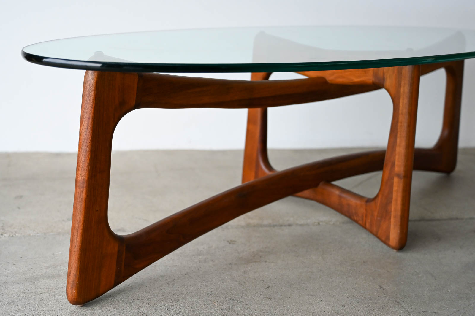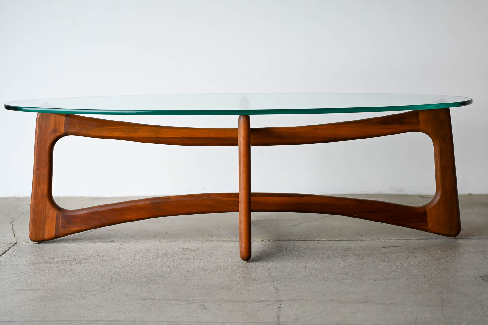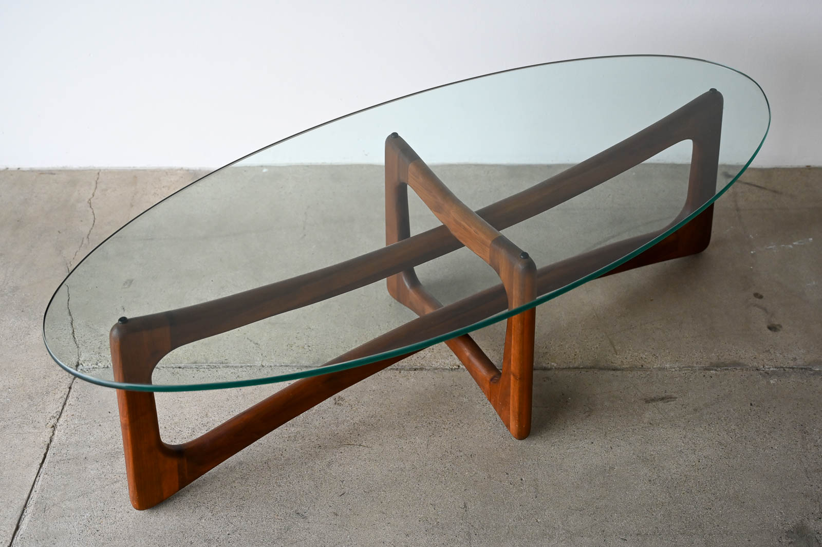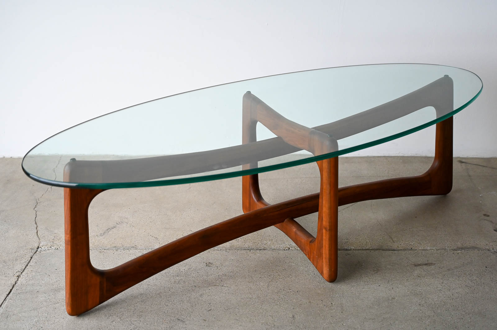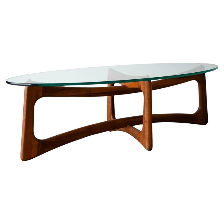 Adrian Pearsall for Craft Associates Oval Bowtie Walnut Coffee Table, ca. 1960. Beautiful original glass and walnut frame in very good to excellent original condition. Glass is thick green colored and original with only very slight wear as shown in photos. Walnut frame is excellent with no scratches or fading. Overall this piece is a 9/10. Measures 50″ L x 22″ W x 16″ H