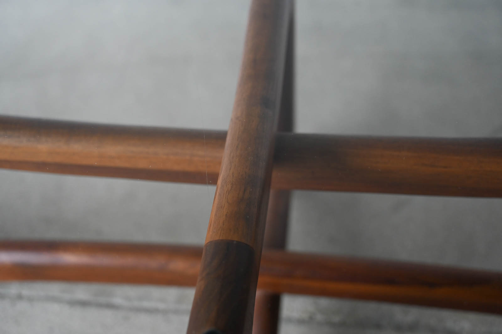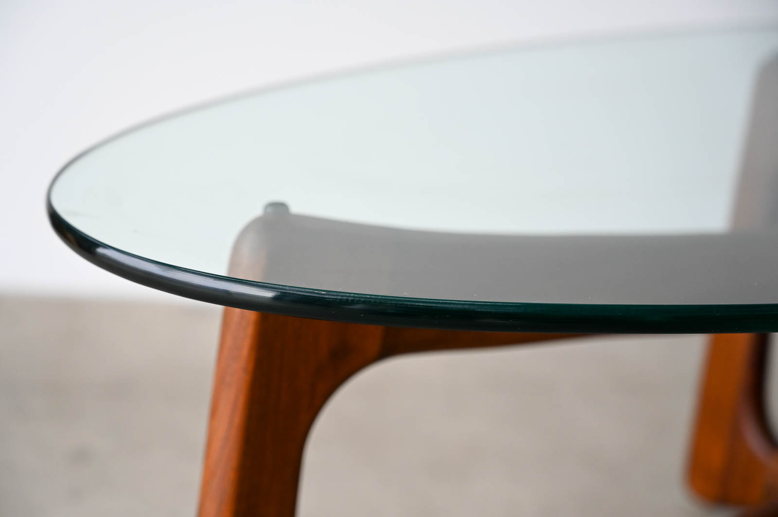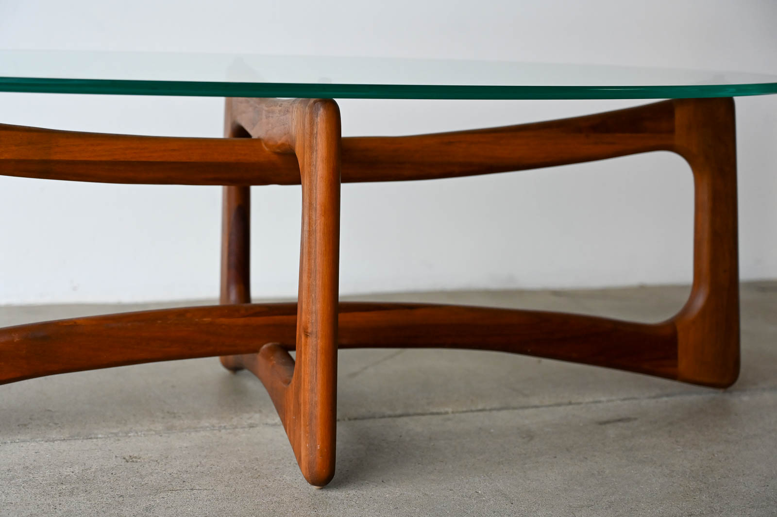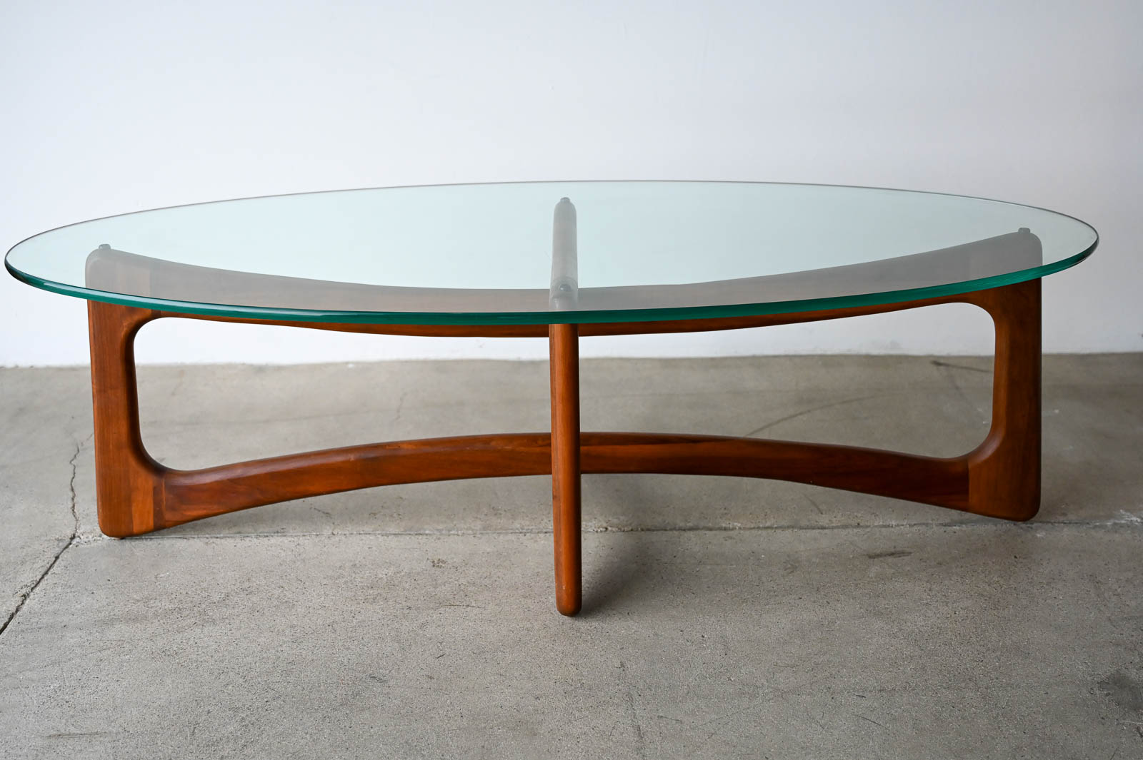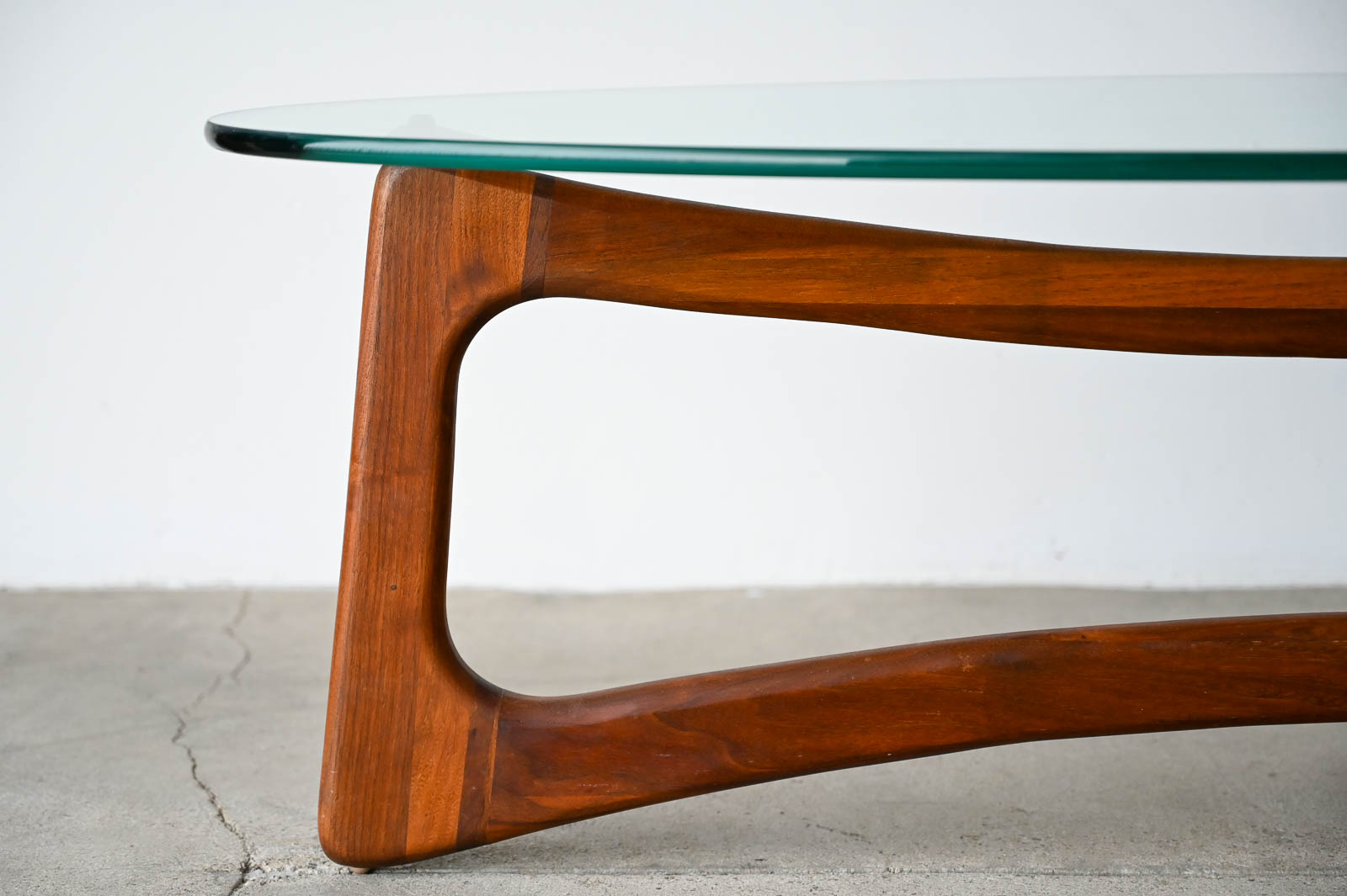 Adrian Pearsall for Craft Associates Oval Bowtie Walnut Coffee Table, ca. 1960. Beautiful original glass and walnut frame in very good to excellent original condition. Glass is thick green colored and original with only very slight wear as shown in photos. Walnut frame is excellent with no scratches or fading. Overall this piece is a 9/10. Measures 50″ L x 22″ W x 16″ H