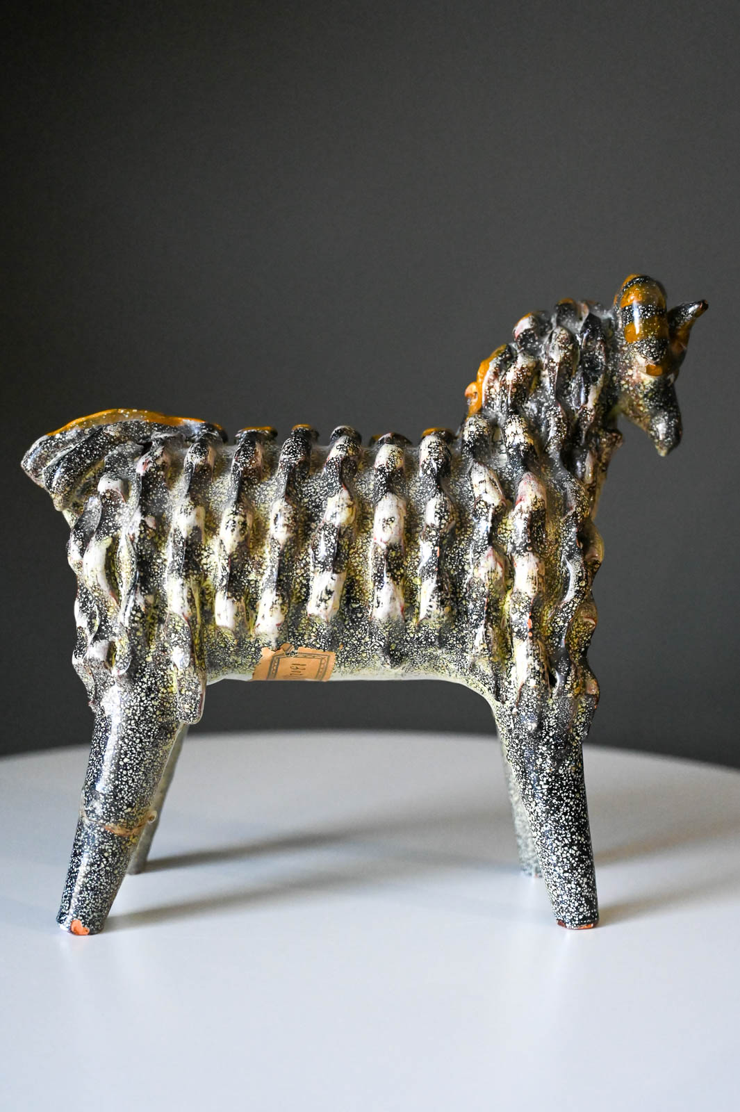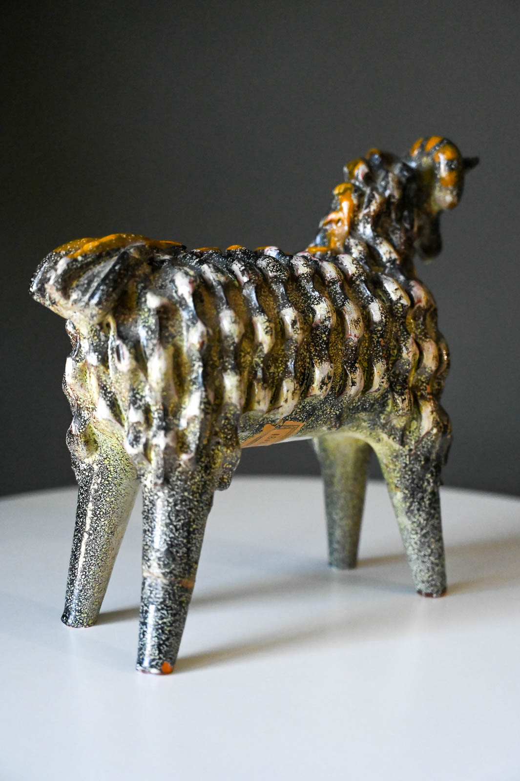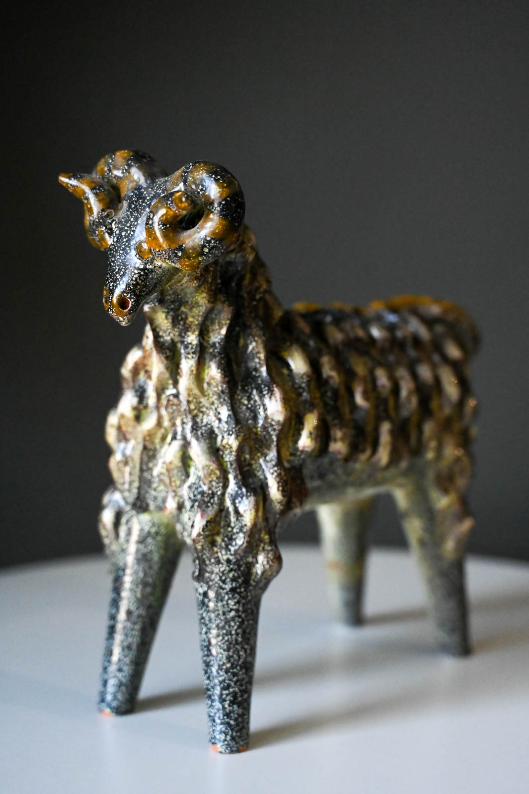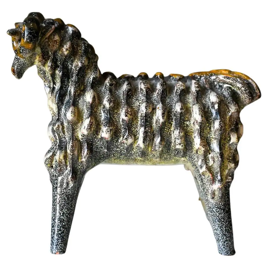 Aries Ram by Miguel Duran-Loriga for Alfaraz Ceramics, ca. 1960. Wonderful ceramic ram sculpture by Miguel Duran-Loriga, manufactured by Alfaraz Workshops in Spain, circa 1960s. Duran-Loriga was an architect, designer and ceramic artist. He won the National Design Award in 1971 and 1979, he was director of the Experimental School of Design and created the magazines Topics Architecture and Design Issues. Ram is made of textured red clay and decorated with a speckled grey glaze over a bright yellow glaze. In good vintage condition with a repaired leg (by original owner) (please see pictures for details). Price has been adjusted accordingly.