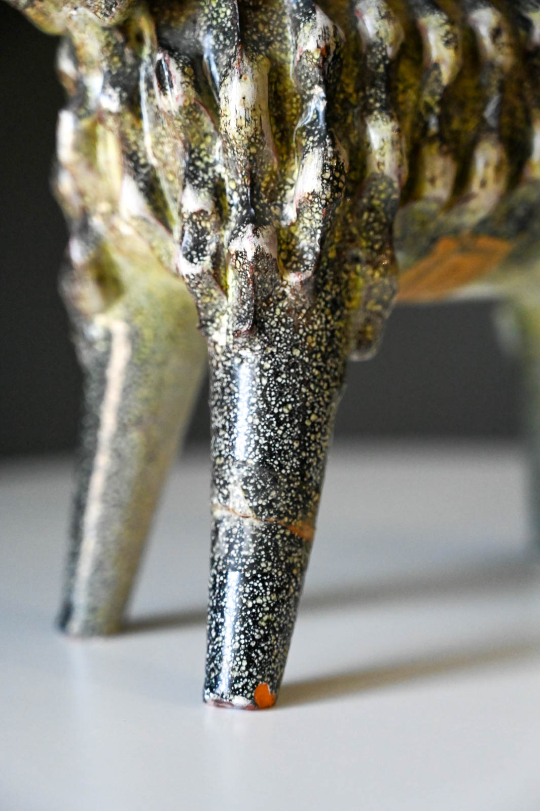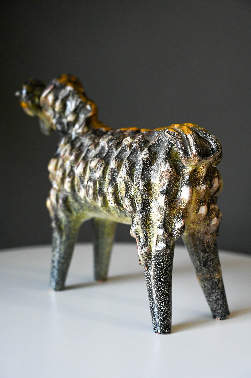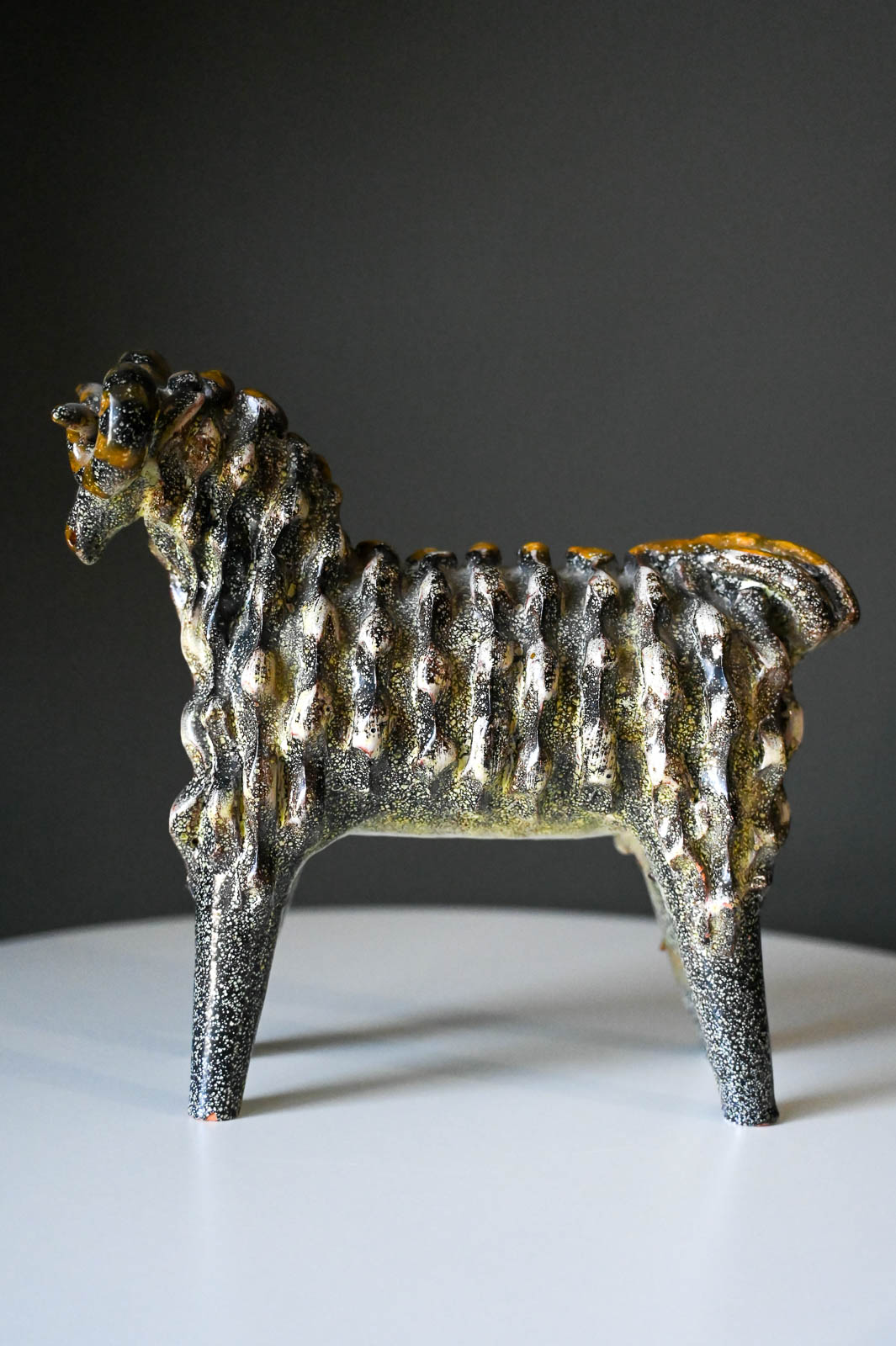 Aries Ram by Miguel Duran-Loriga for Alfaraz Ceramics, ca. 1960. Wonderful ceramic ram sculpture by Miguel Duran-Loriga, manufactured by Alfaraz Workshops in Spain, circa 1960s. Duran-Loriga was an architect, designer and ceramic artist. He won the National Design Award in 1971 and 1979, he was director of the Experimental School of Design and created the magazines Topics Architecture and Design Issues. Ram is made of textured red clay and decorated with a speckled grey glaze over a bright yellow glaze. In good vintage condition with a repaired leg (by original owner) (please see pictures for details). Price has been adjusted accordingly.