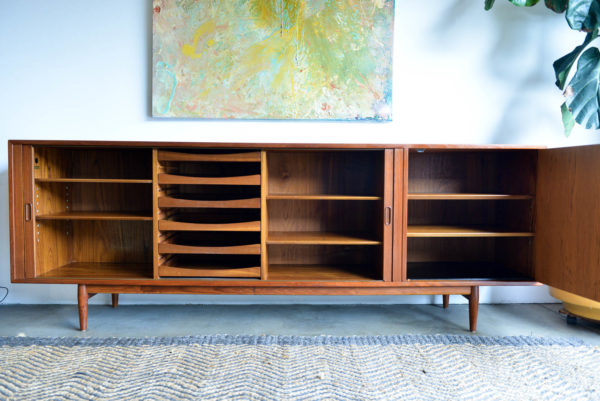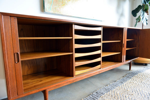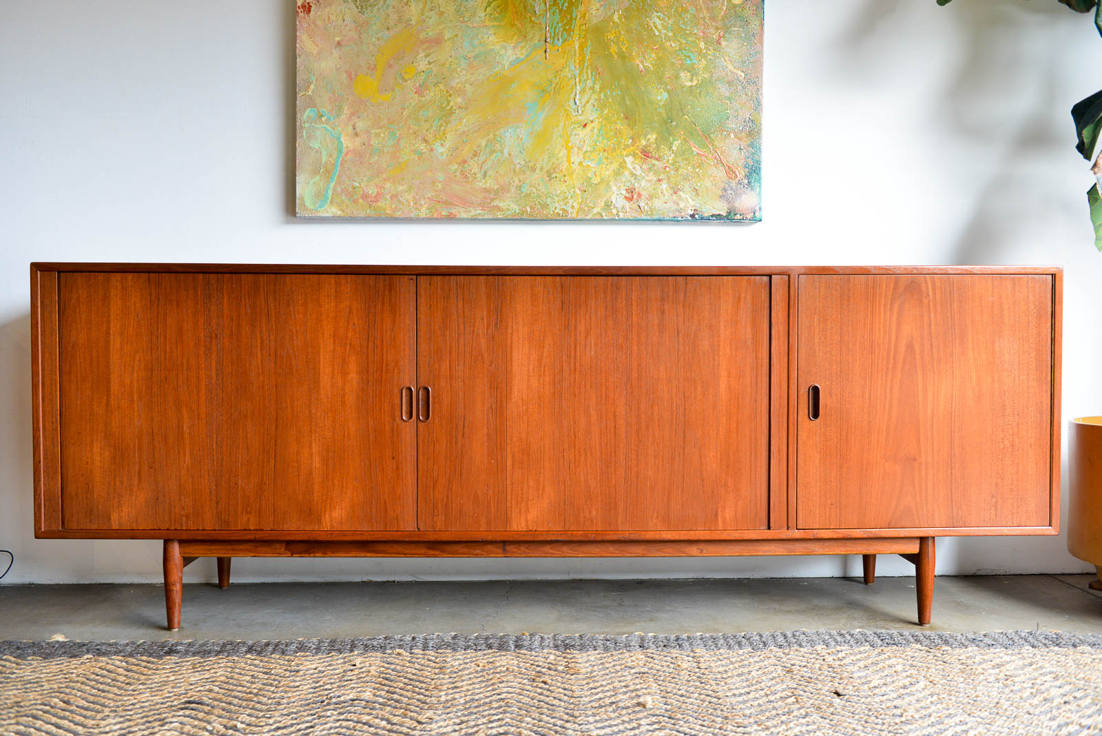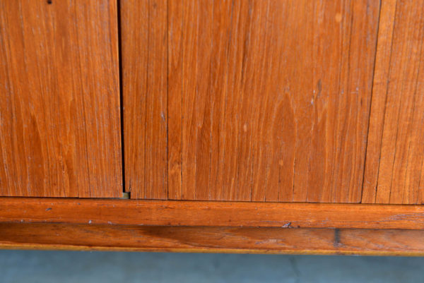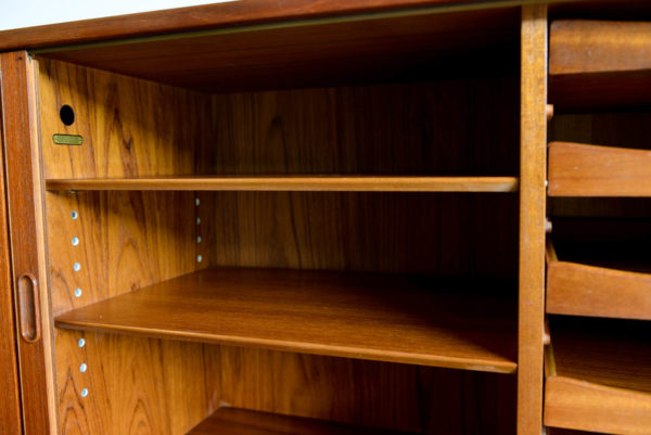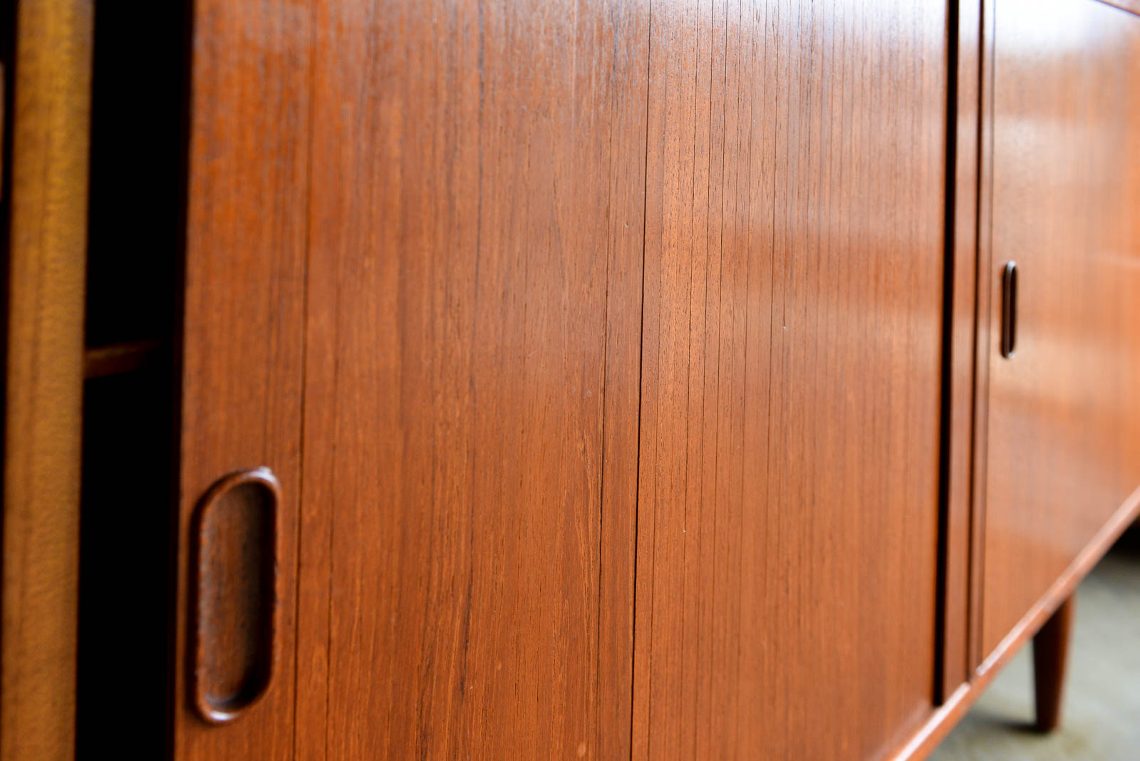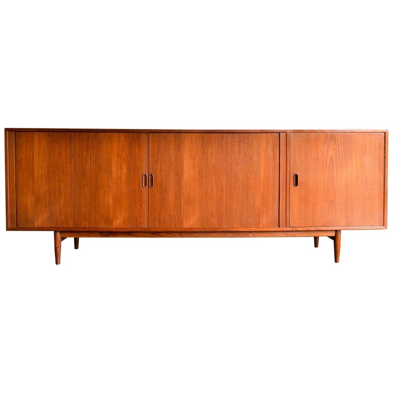 Arne Vodder for Sibast large tambour door credenza, circa 1960. Teak cabinet with two sliding tambour doors and one swing open door on the right. Inside has plenty of storage with adjustable and removable shelving and the right cabinet was originally made for a dry bar and has the original Micarta shelf on the bottom to protect from liquid stains. This piece is in very good vintage condition, the top has been restored and the back is finished so you can float in the room. Doors slide smoothly with no sticking.