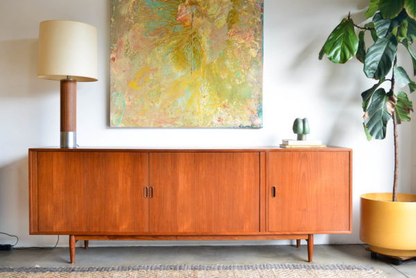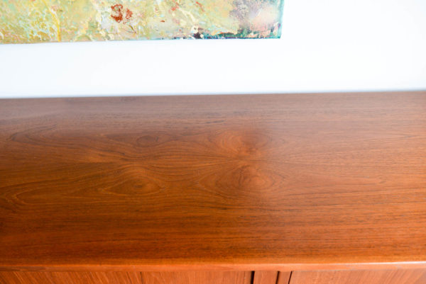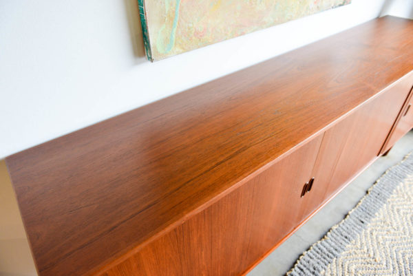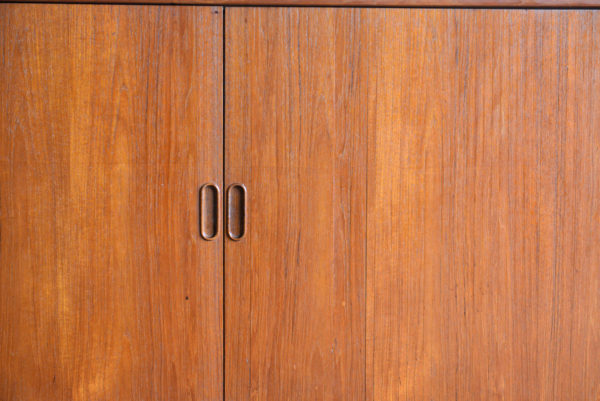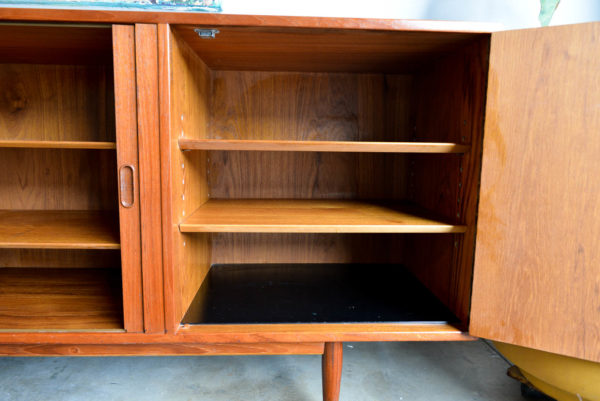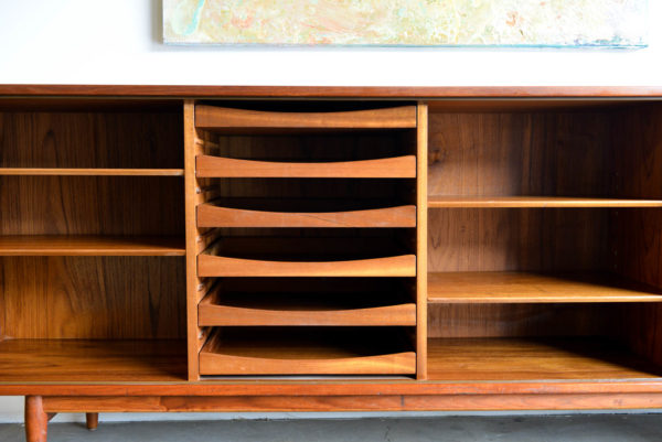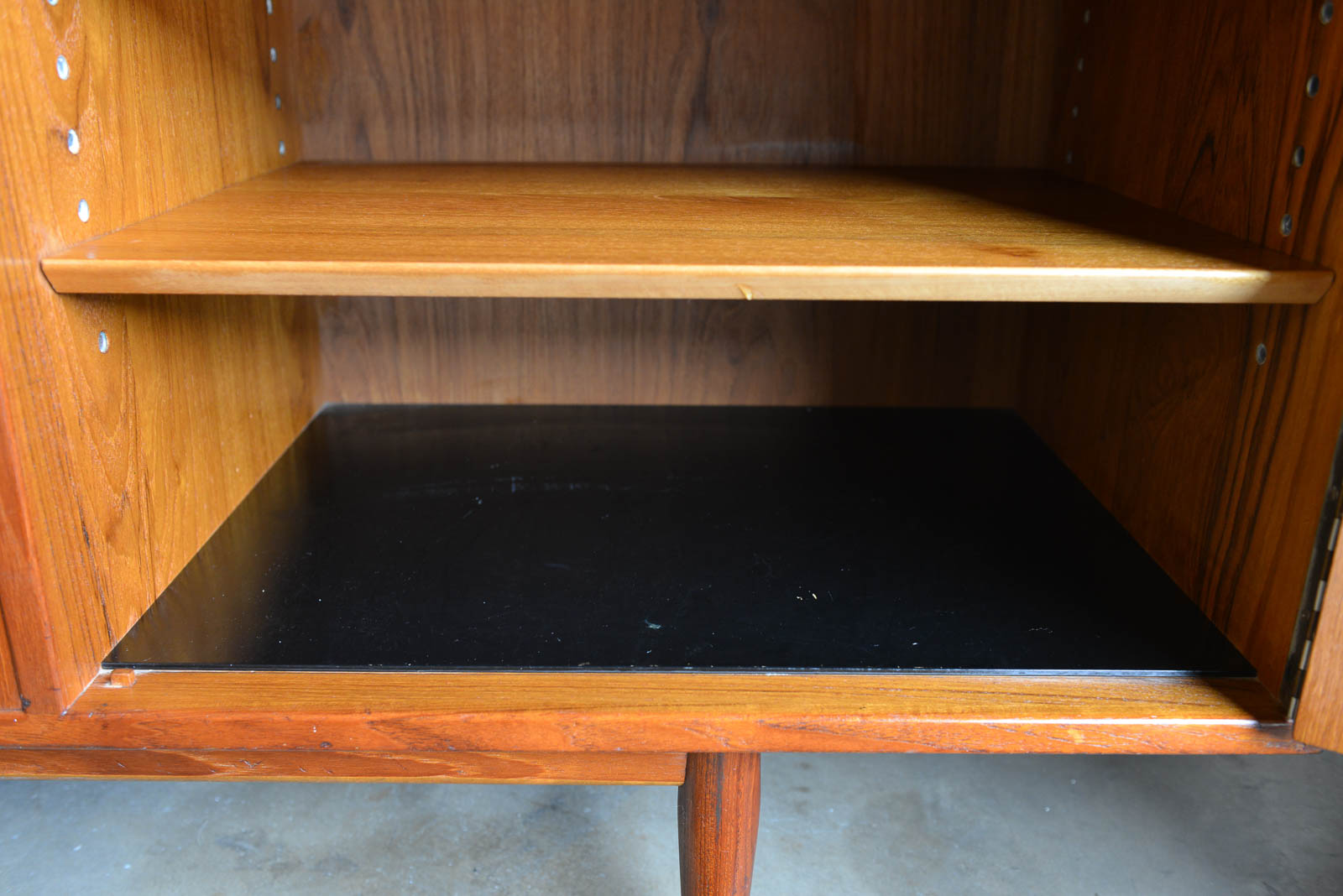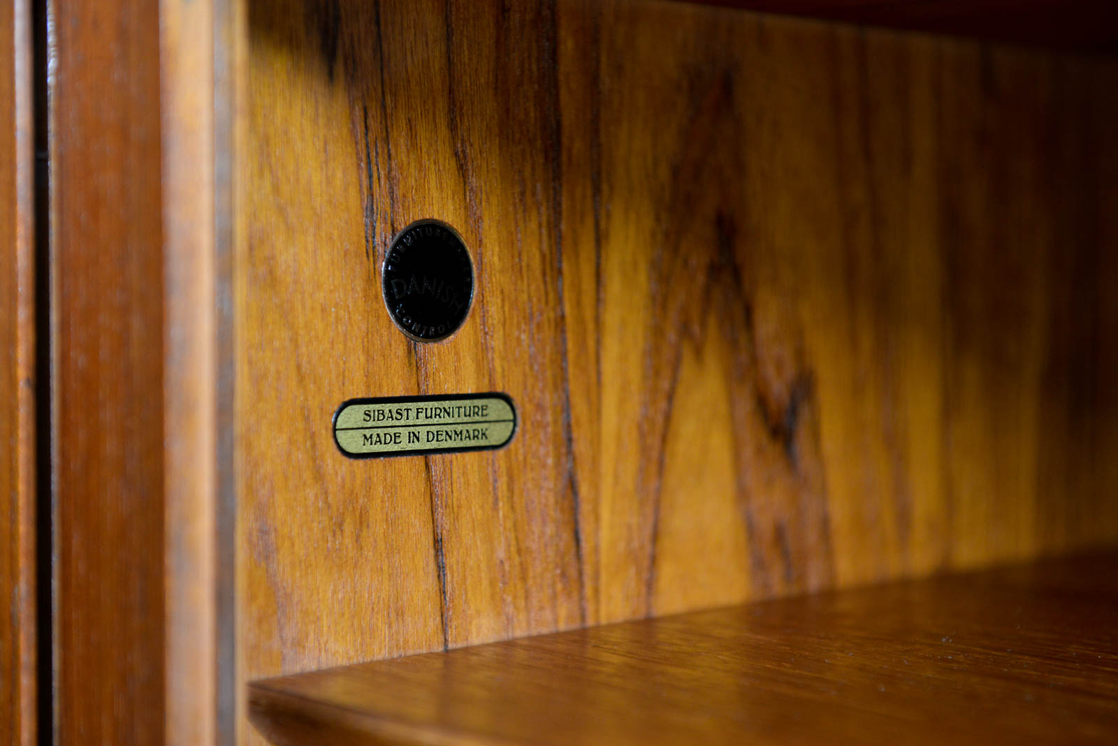 Arne Vodder for Sibast large tambour door credenza, circa 1960. Teak cabinet with two sliding tambour doors and one swing open door on the right. Inside has plenty of storage with adjustable and removable shelving and the right cabinet was originally made for a dry bar and has the original Micarta shelf on the bottom to protect from liquid stains. This piece is in very good vintage condition, the top has been restored and the back is finished so you can float in the room. Doors slide smoothly with no sticking.