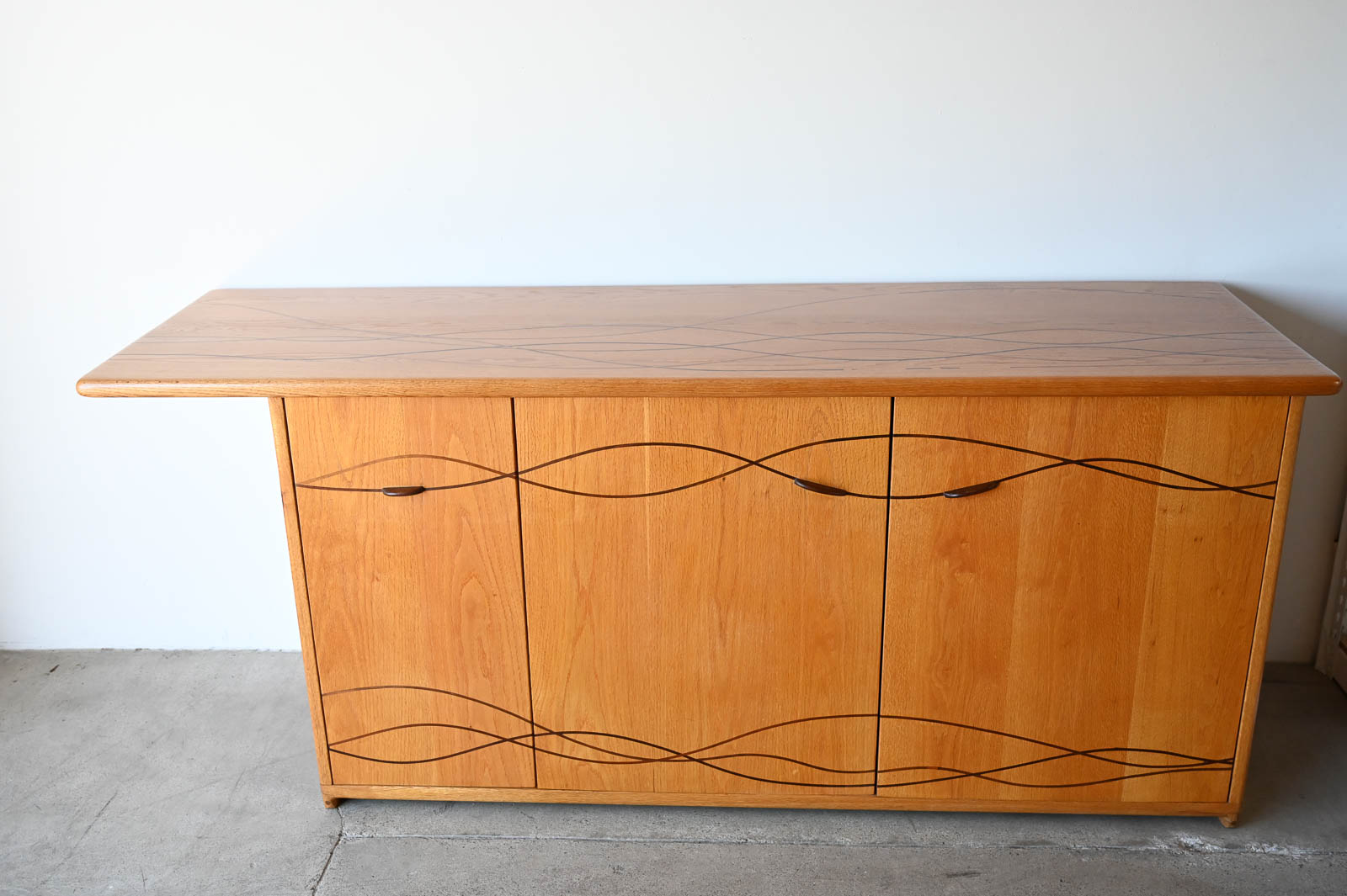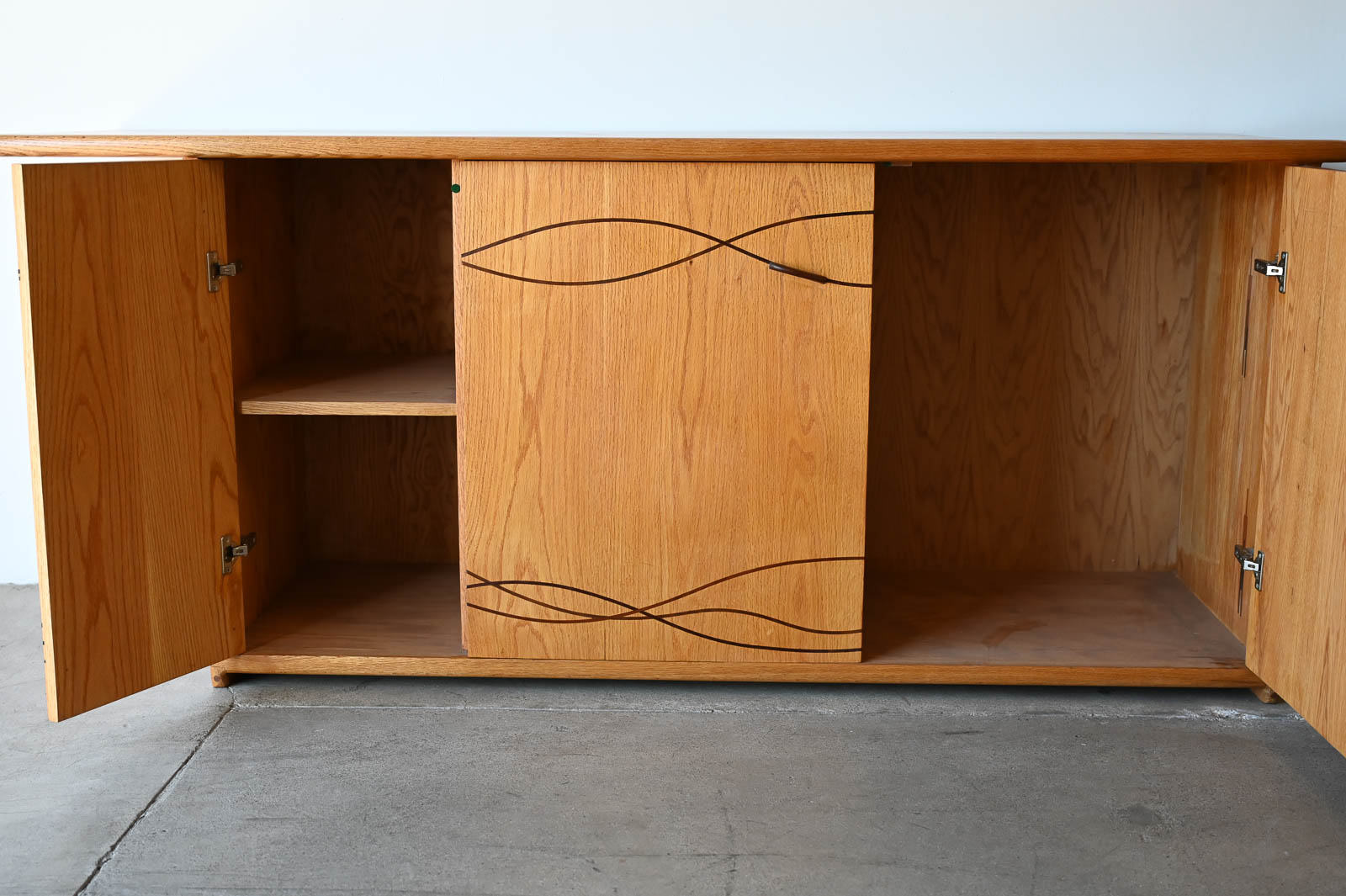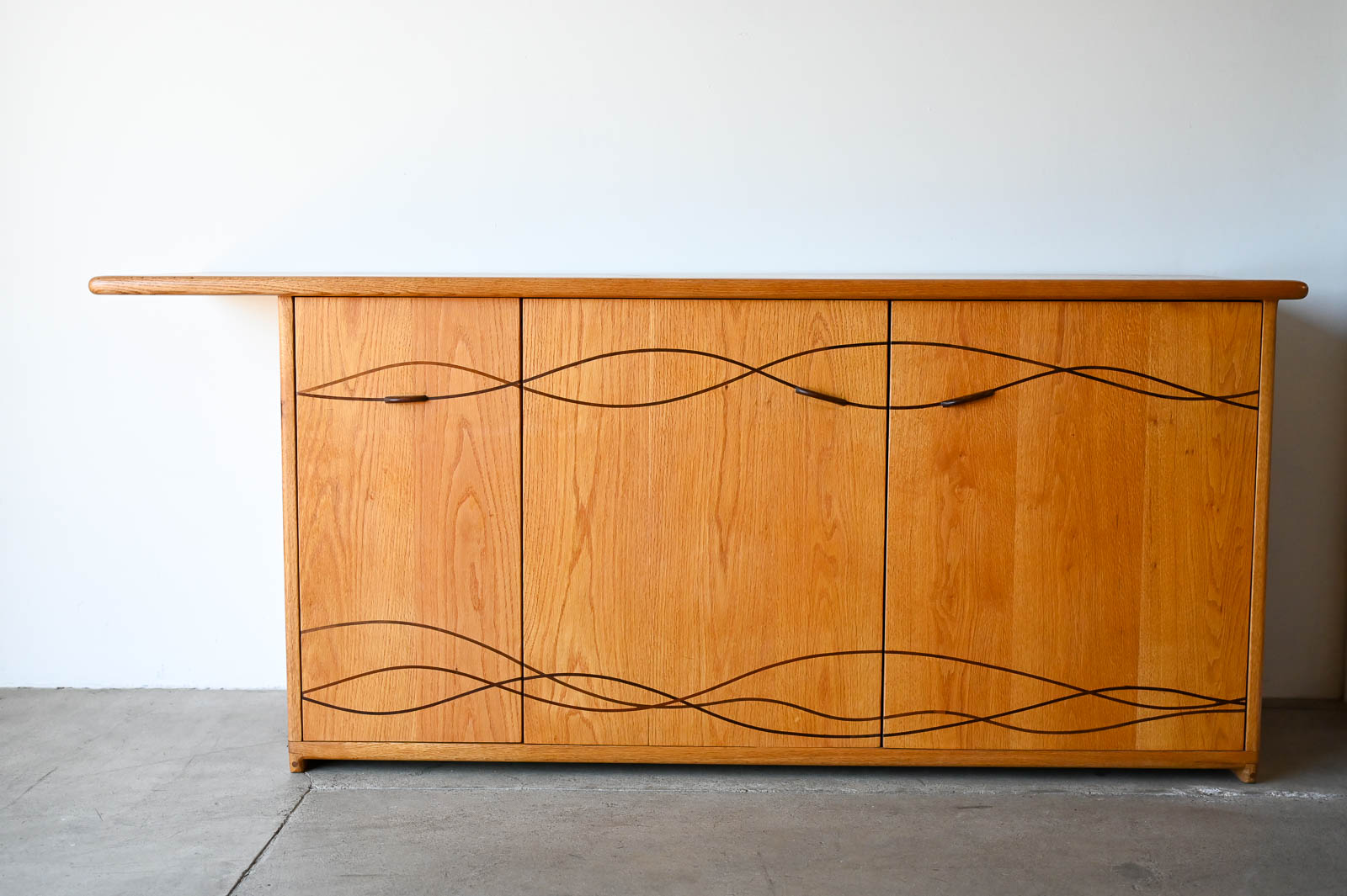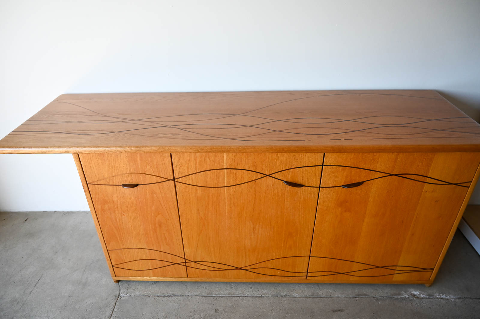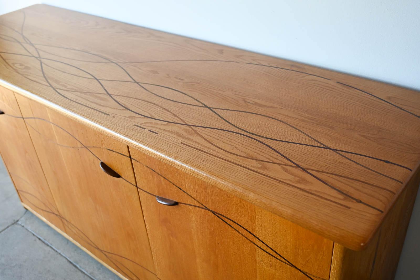 Bespoke Cabinet with Carved Inlay by Robert Squire Bierbaum, 1995. Custom made for a local client, this beautiful american craftsman style cabinet was meticulously crafted by the artist with beautiful inlay of cherry, walnut, wedge and oak. Three doors open to an open cabinet area on the left with a smaller cabinet with shelf on right. Beautiful work, the craftsmanship is evident in every detail of the piece including the top, handcrafted and sculpted door hardware and inlay. Measures 75″ W x 22.5″ D x 32″ H