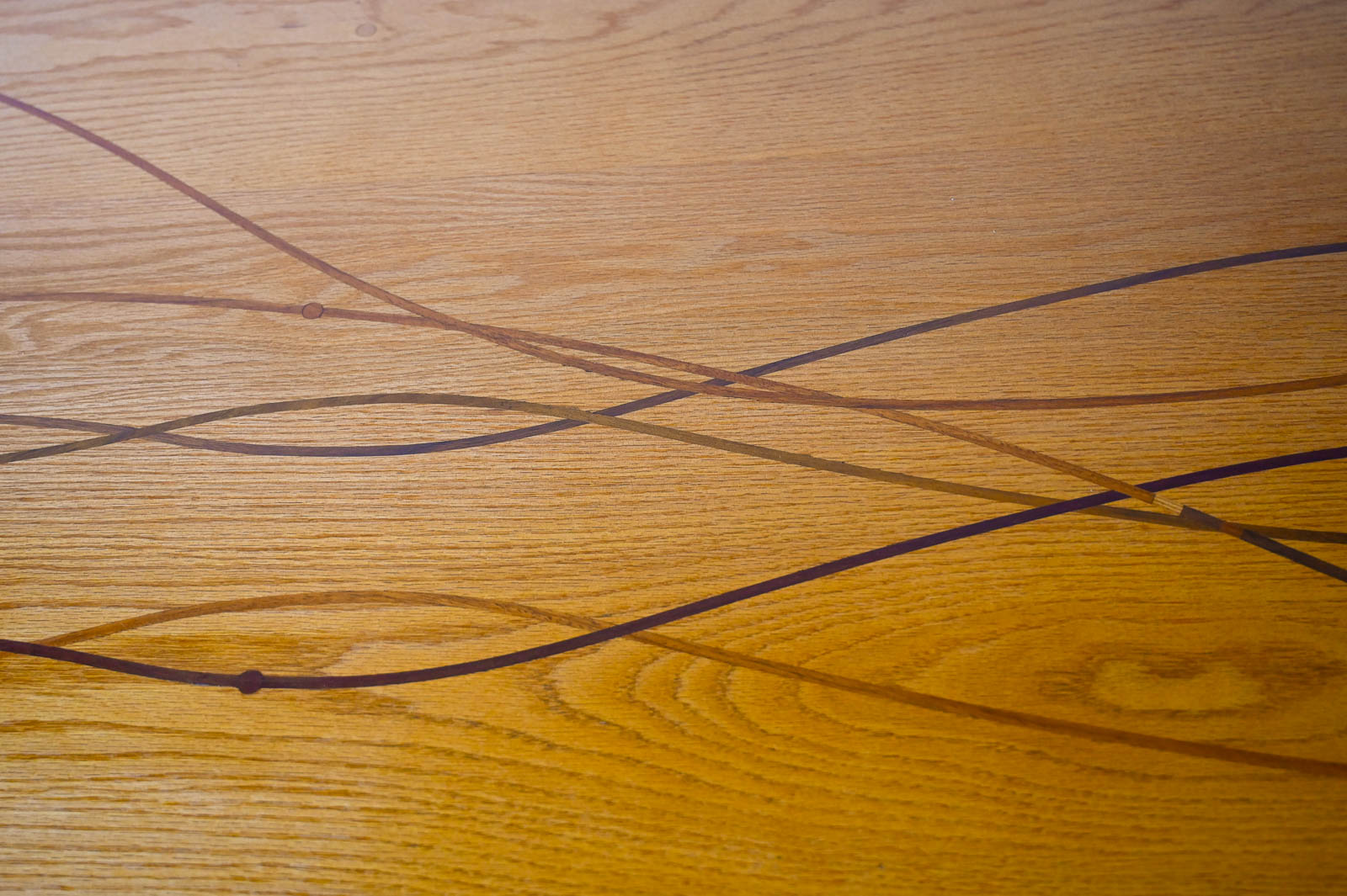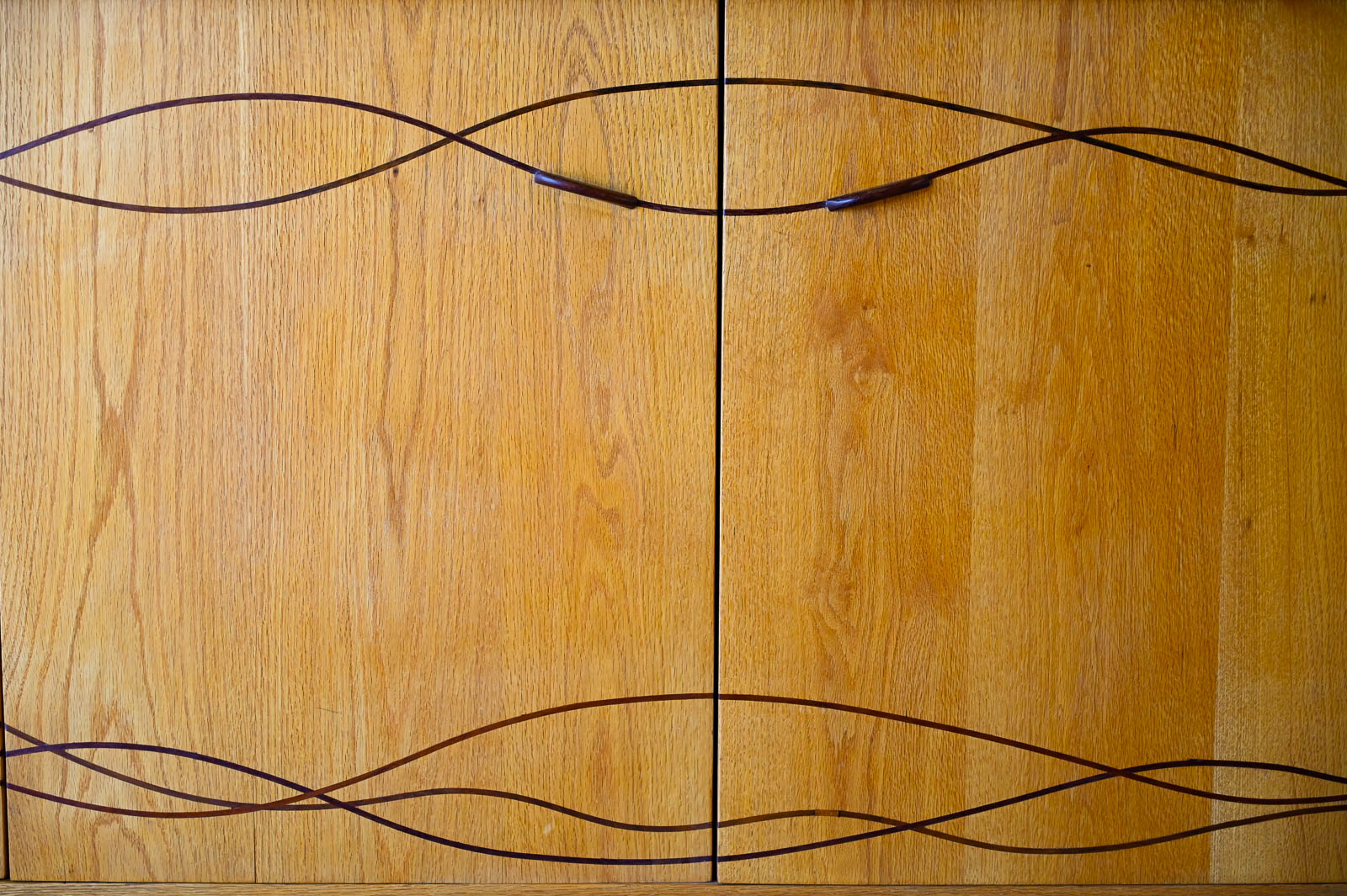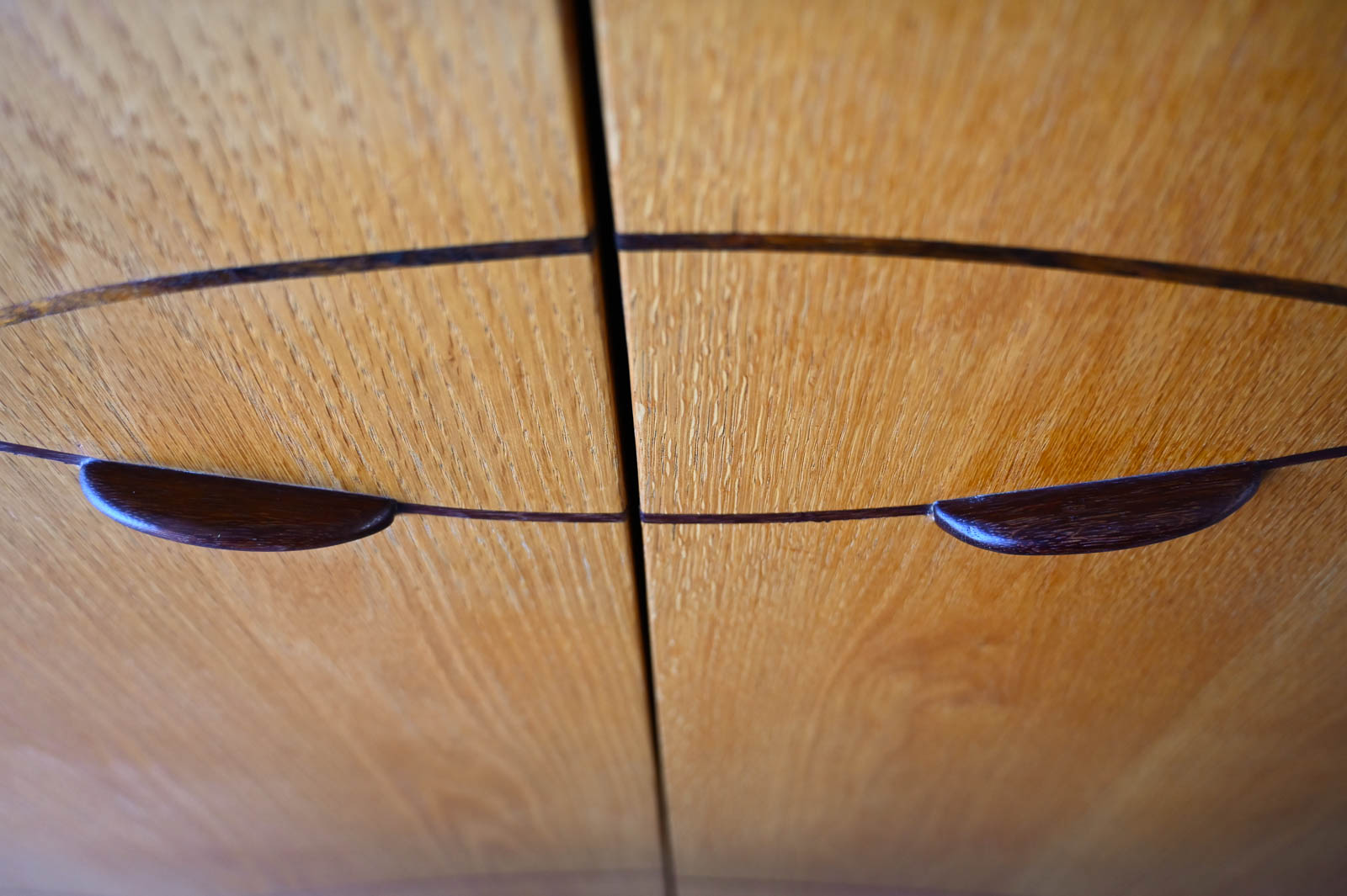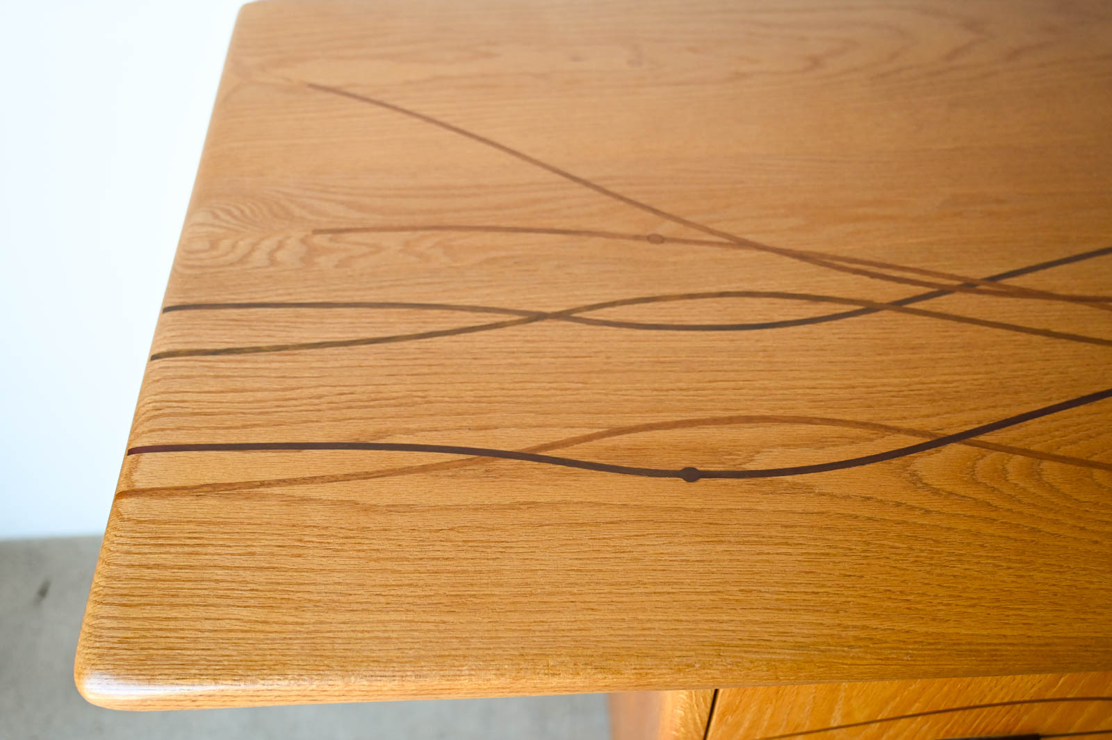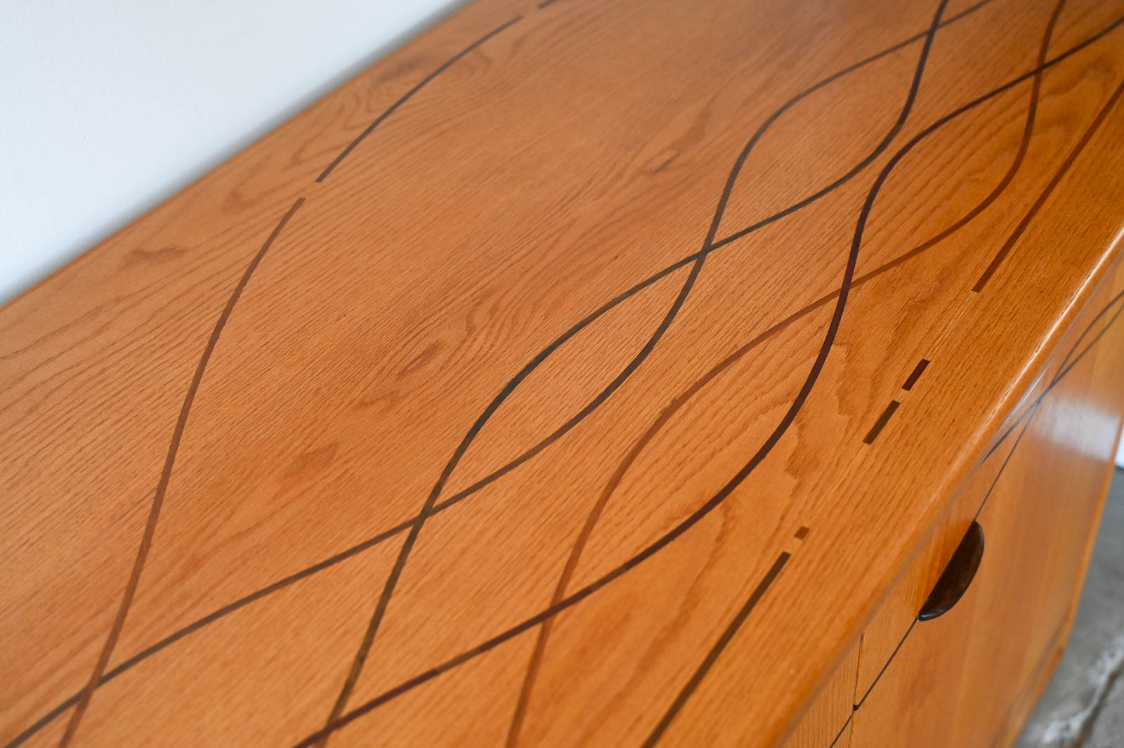 Bespoke Cabinet with Carved Inlay by Robert Squire Bierbaum, 1995. Custom made for a local client, this beautiful american craftsman style cabinet was meticulously crafted by the artist with beautiful inlay of cherry, walnut, wedge and oak. Three doors open to an open cabinet area on the left with a smaller cabinet with shelf on right. Beautiful work, the craftsmanship is evident in every detail of the piece including the top, handcrafted and sculpted door hardware and inlay. Measures 75″ W x 22.5″ D x 32″ H
