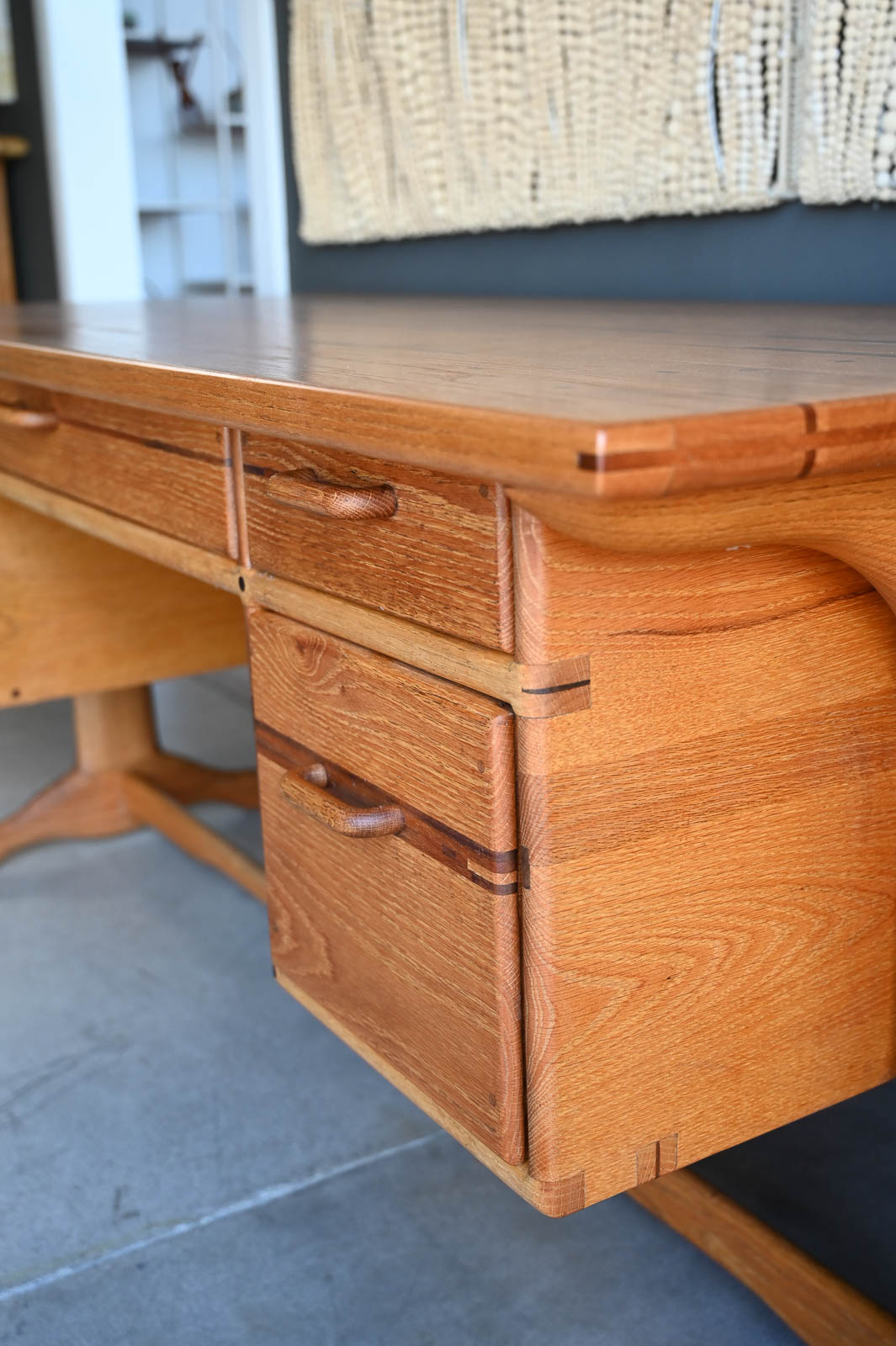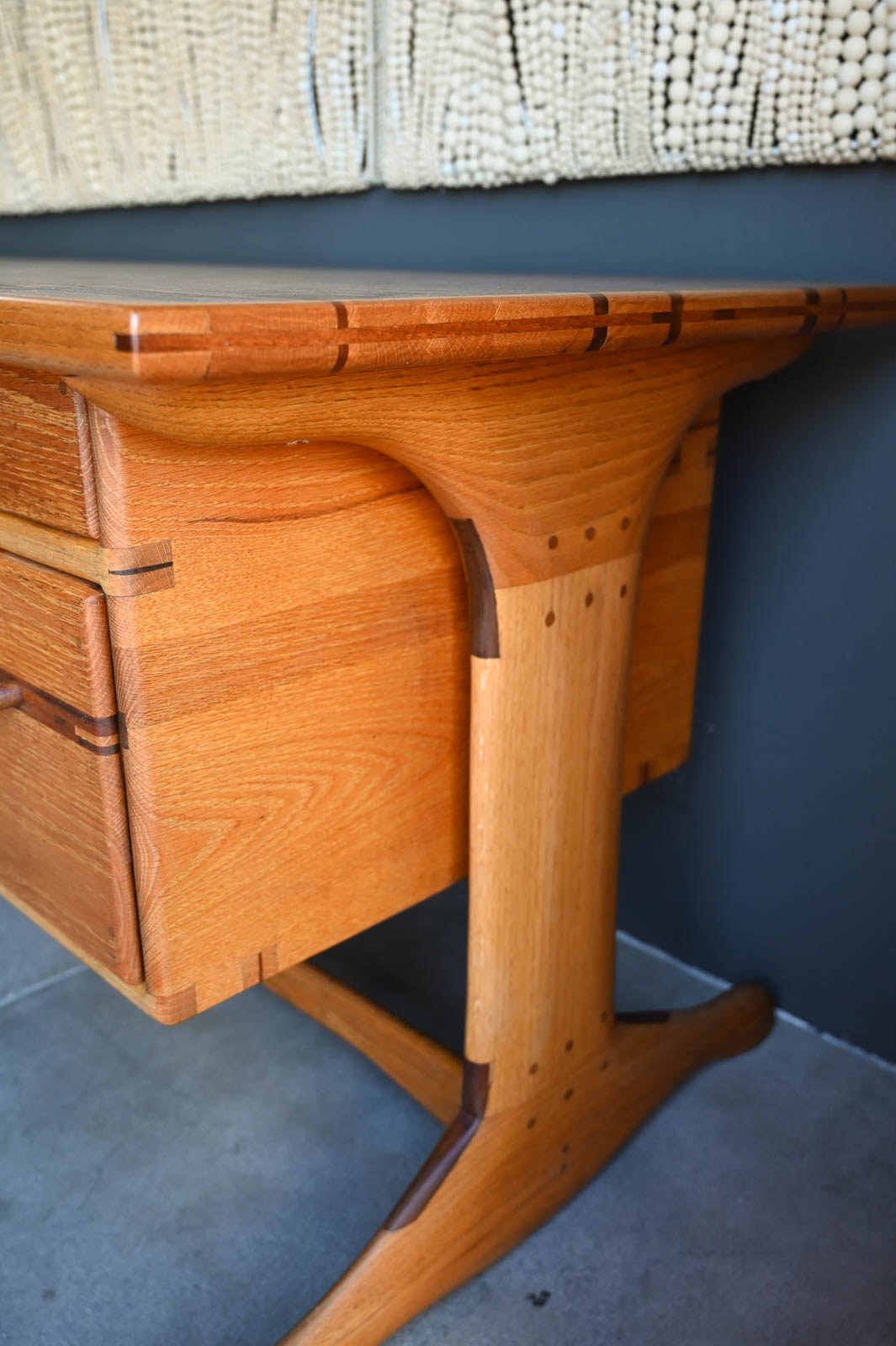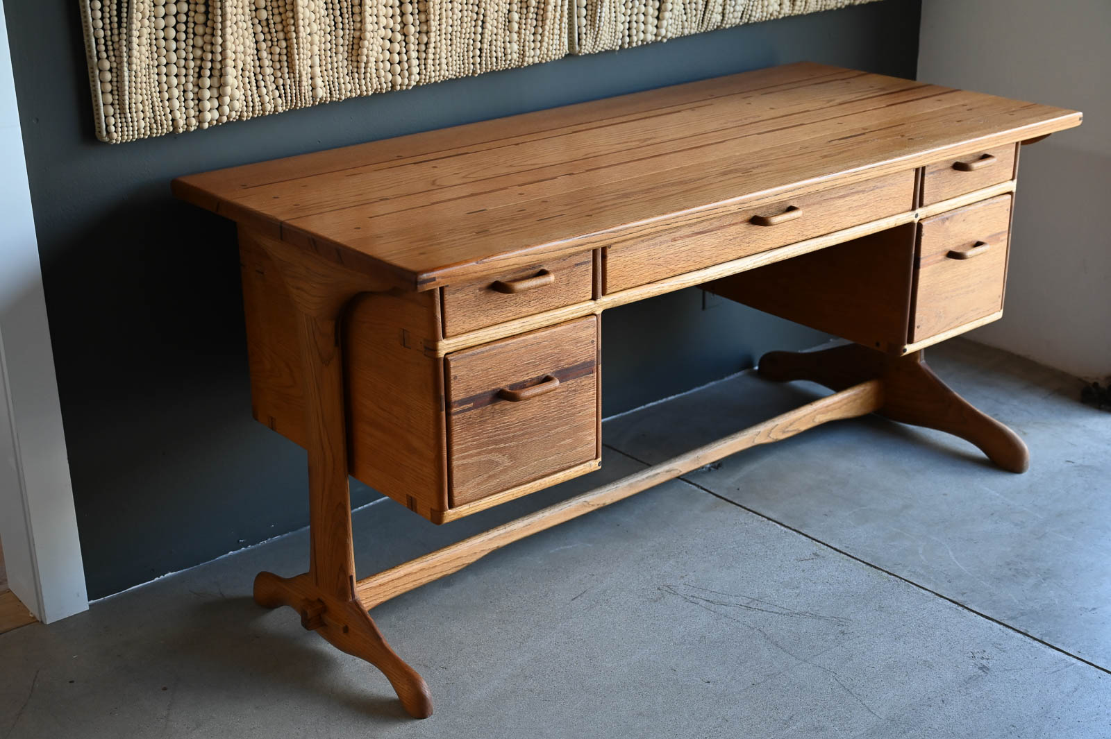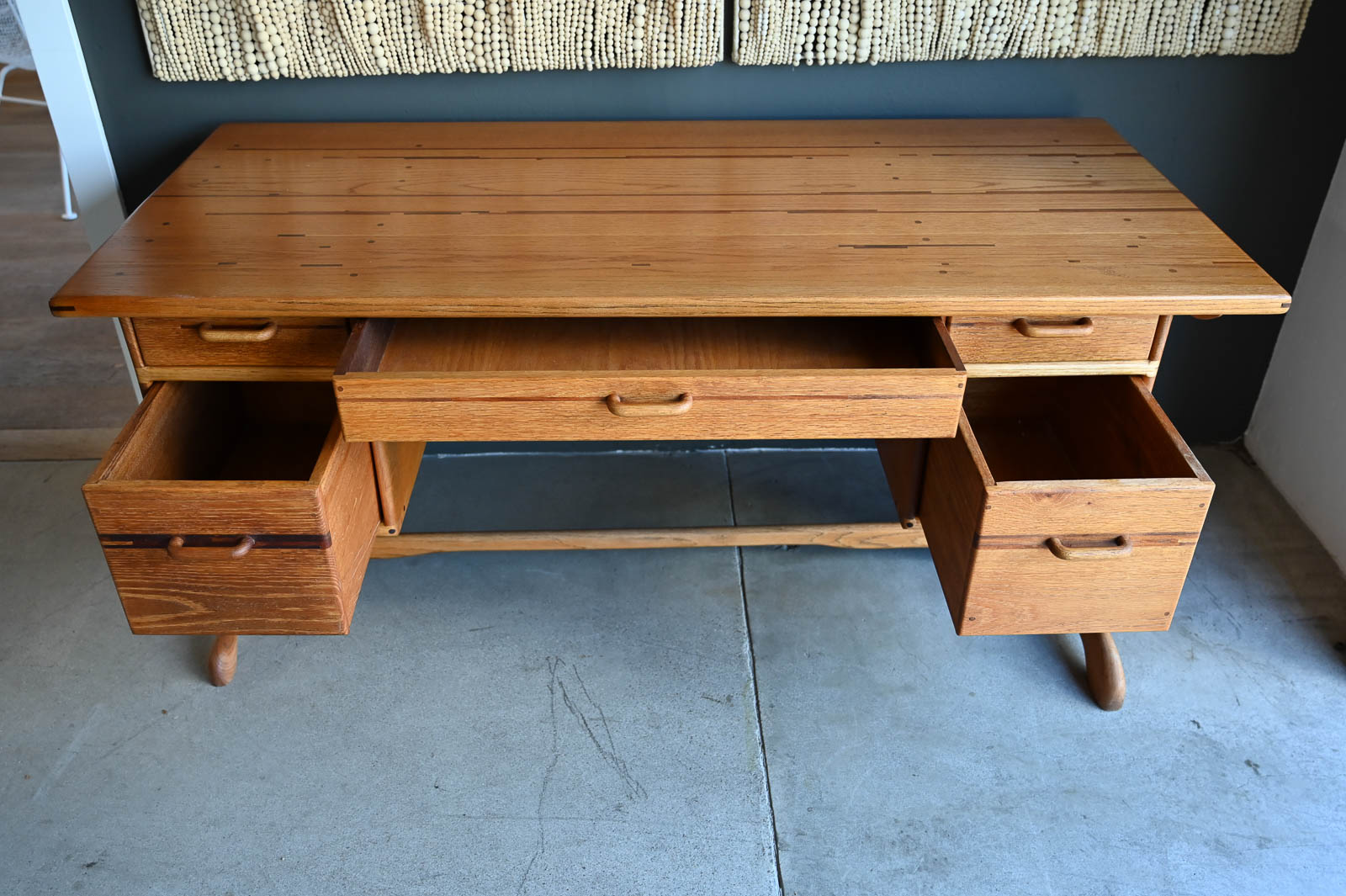 Bespoke Desk by Robert Squire Bierbaum, 1995. Beautiful hand sculpted oak desk with inlay of walnut, cherry and wedge woods. Handmade by Robert Squire Bierbaum of Laguna Beach, CA and commissioned by his client. This beautiful desk is completely handmade and tooled by the artist. Top has been refinished with a clearcoat for longer wear and protection. A beautiful piece of craftsmanship that will add character to any home or office. Signed on the underside by the artist. Measures 63.5″ W x 28.5″ D x 30″ H
