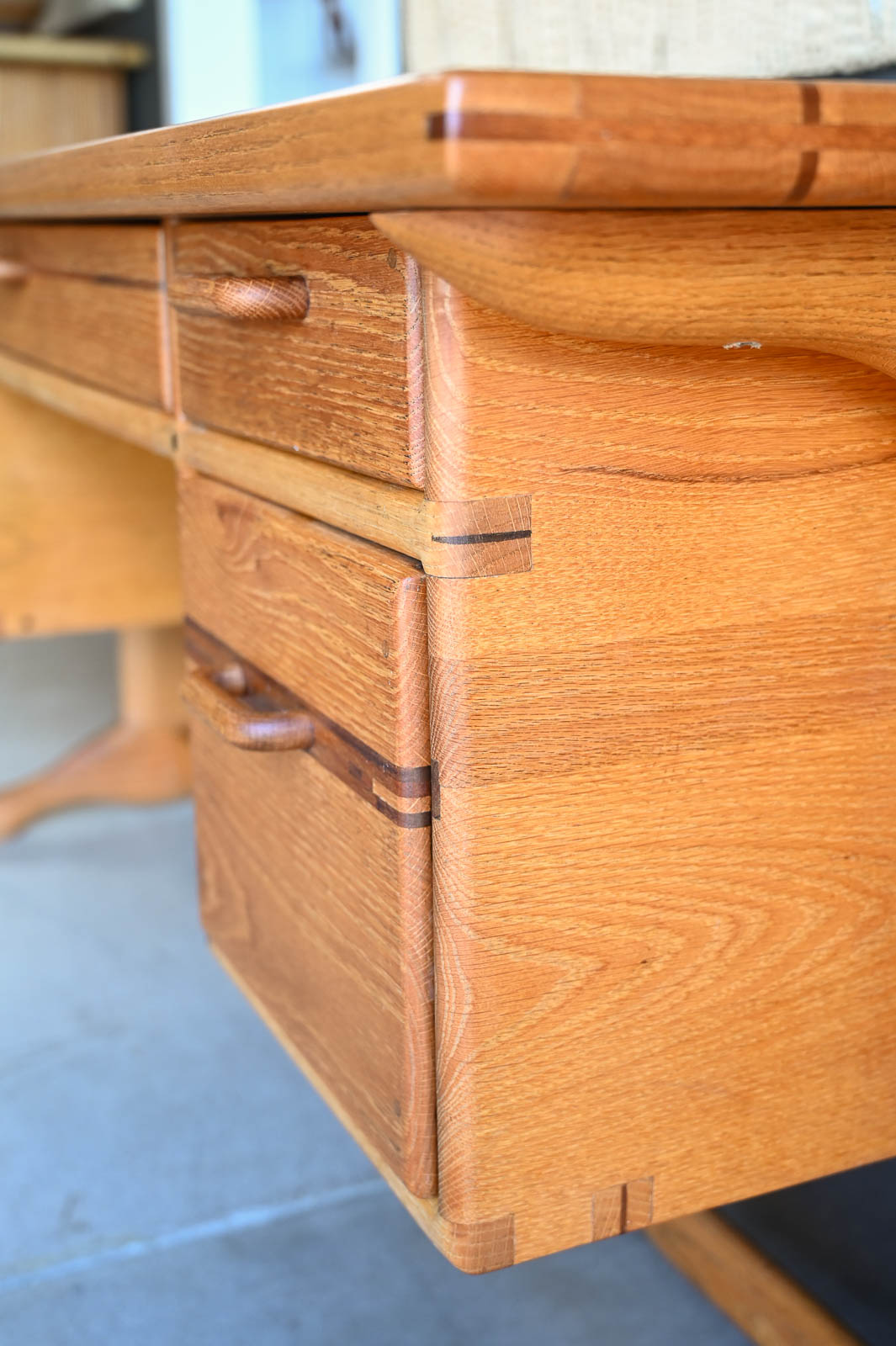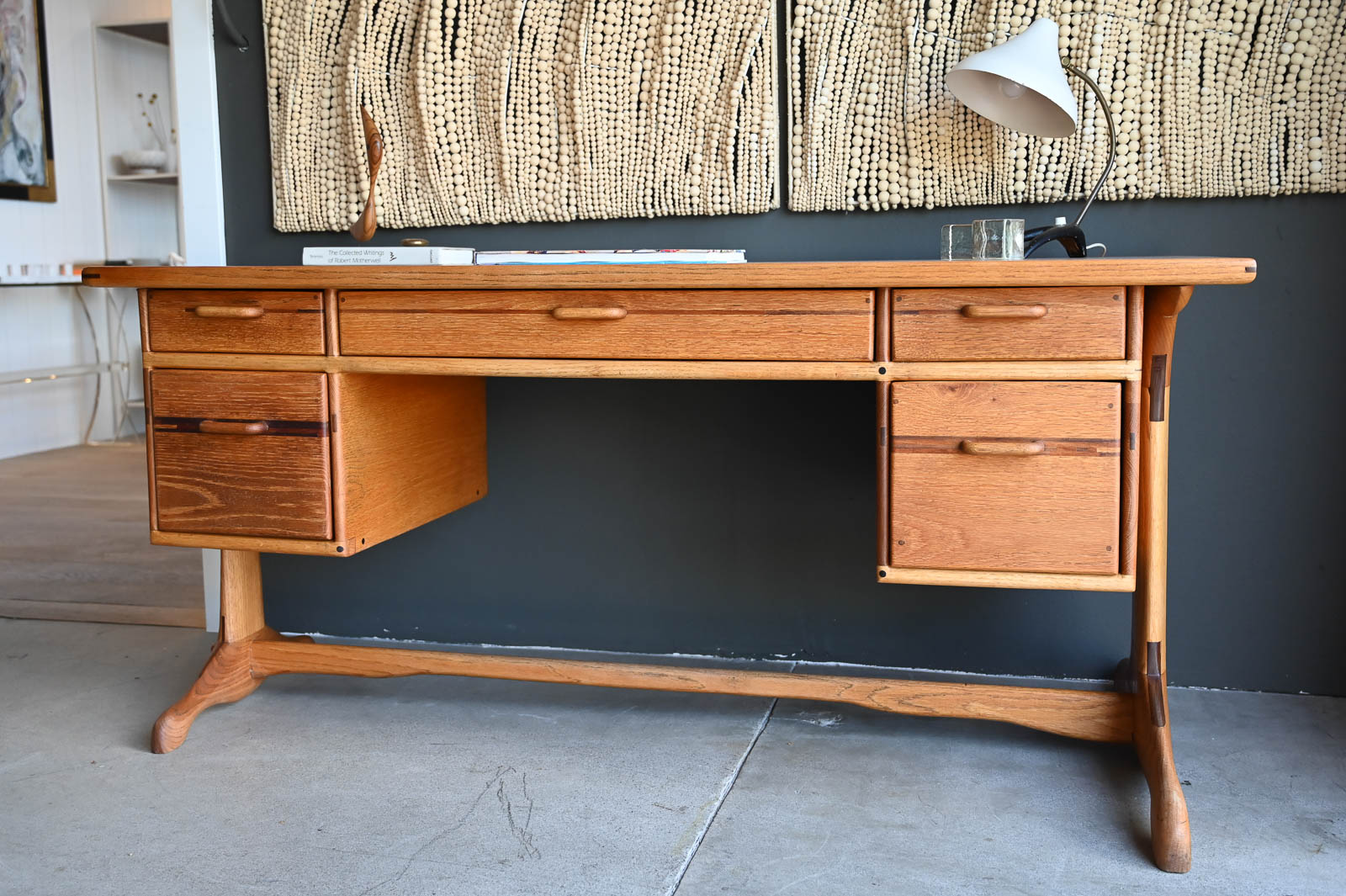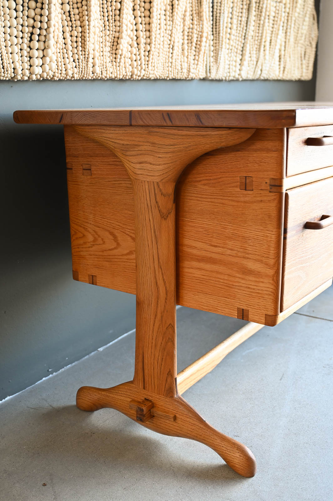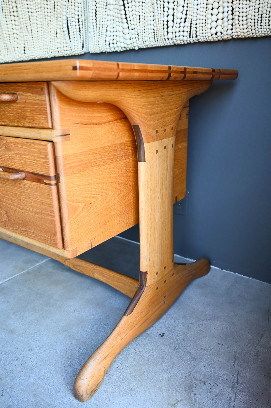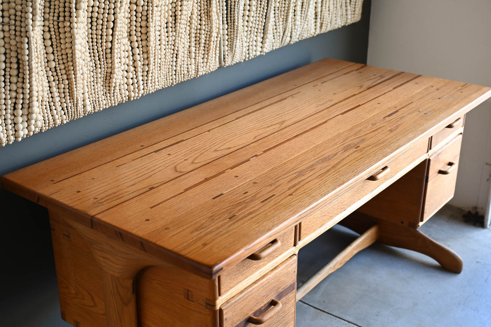 Bespoke Desk by Robert Squire Bierbaum, 1995. Beautiful hand sculpted oak desk with inlay of walnut, cherry and wedge woods. Handmade by Robert Squire Bierbaum of Laguna Beach, CA and commissioned by his client. This beautiful desk is completely handmade and tooled by the artist. Top has been refinished with a clearcoat for longer wear and protection. A beautiful piece of craftsmanship that will add character to any home or office. Signed on the underside by the artist. Measures 63.5″ W x 28.5″ D x 30″ H
