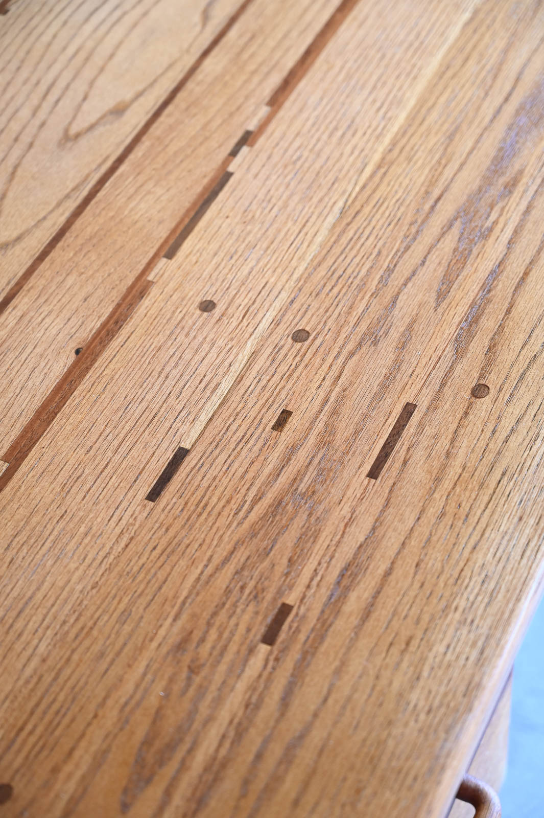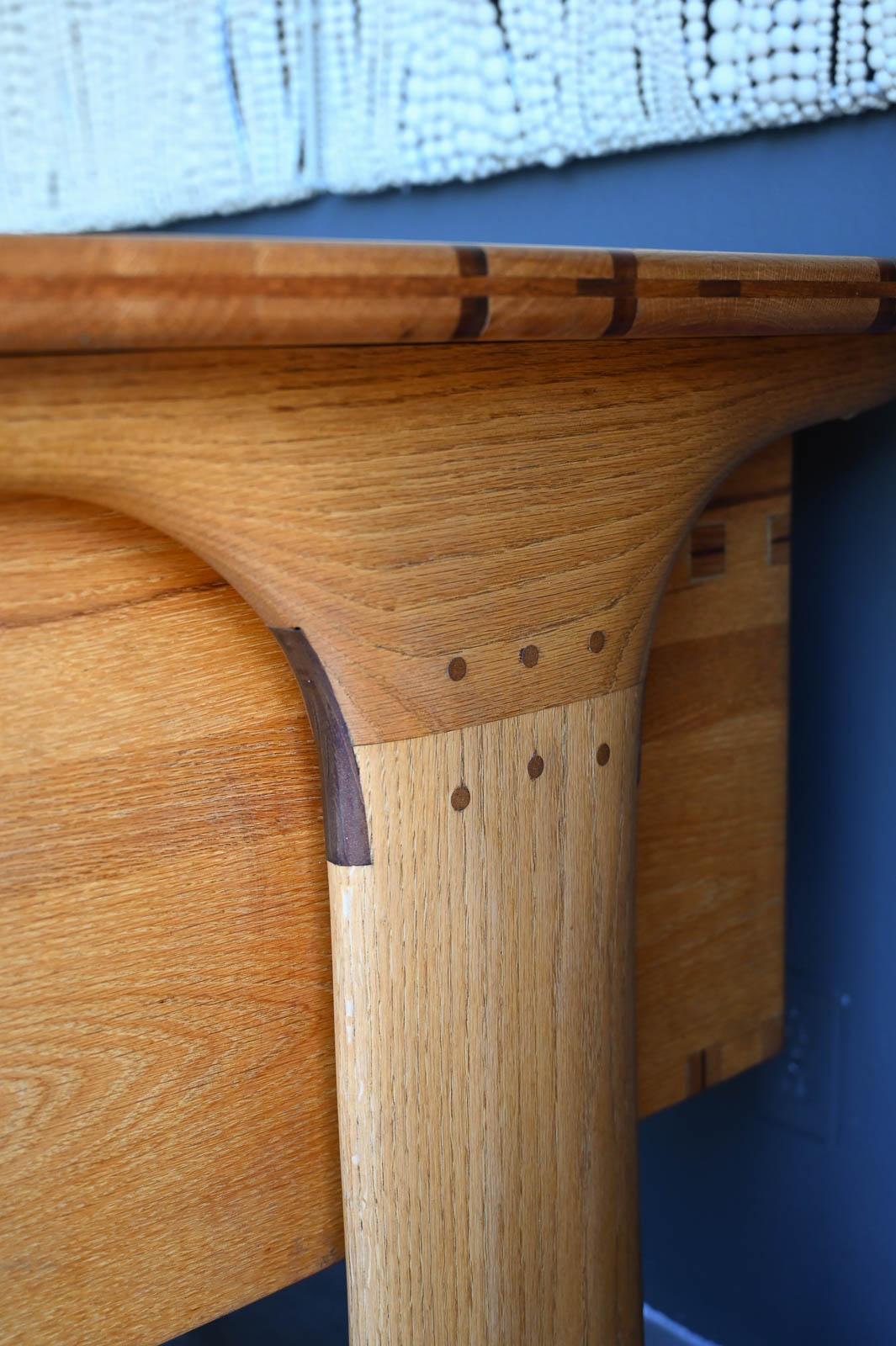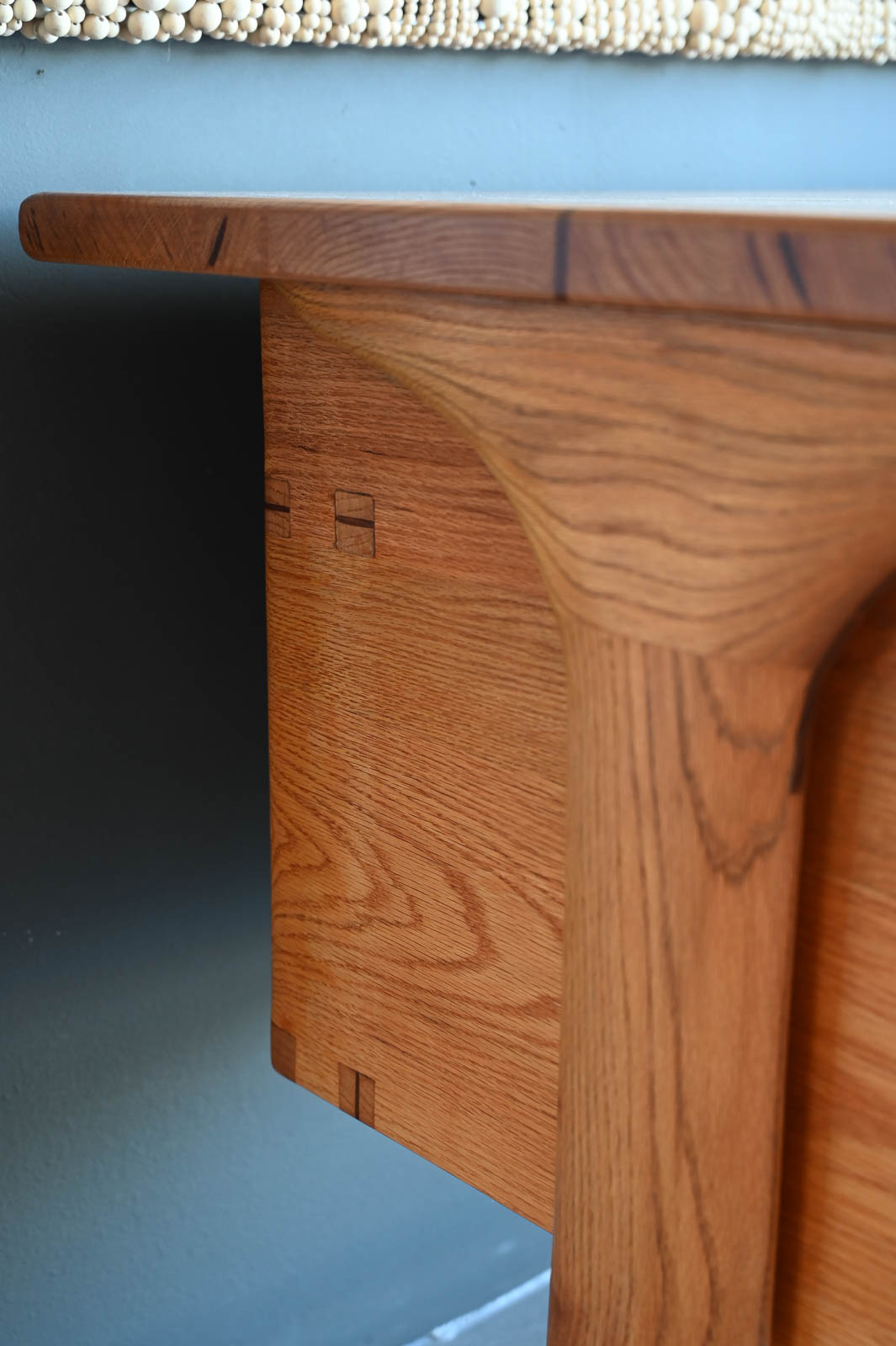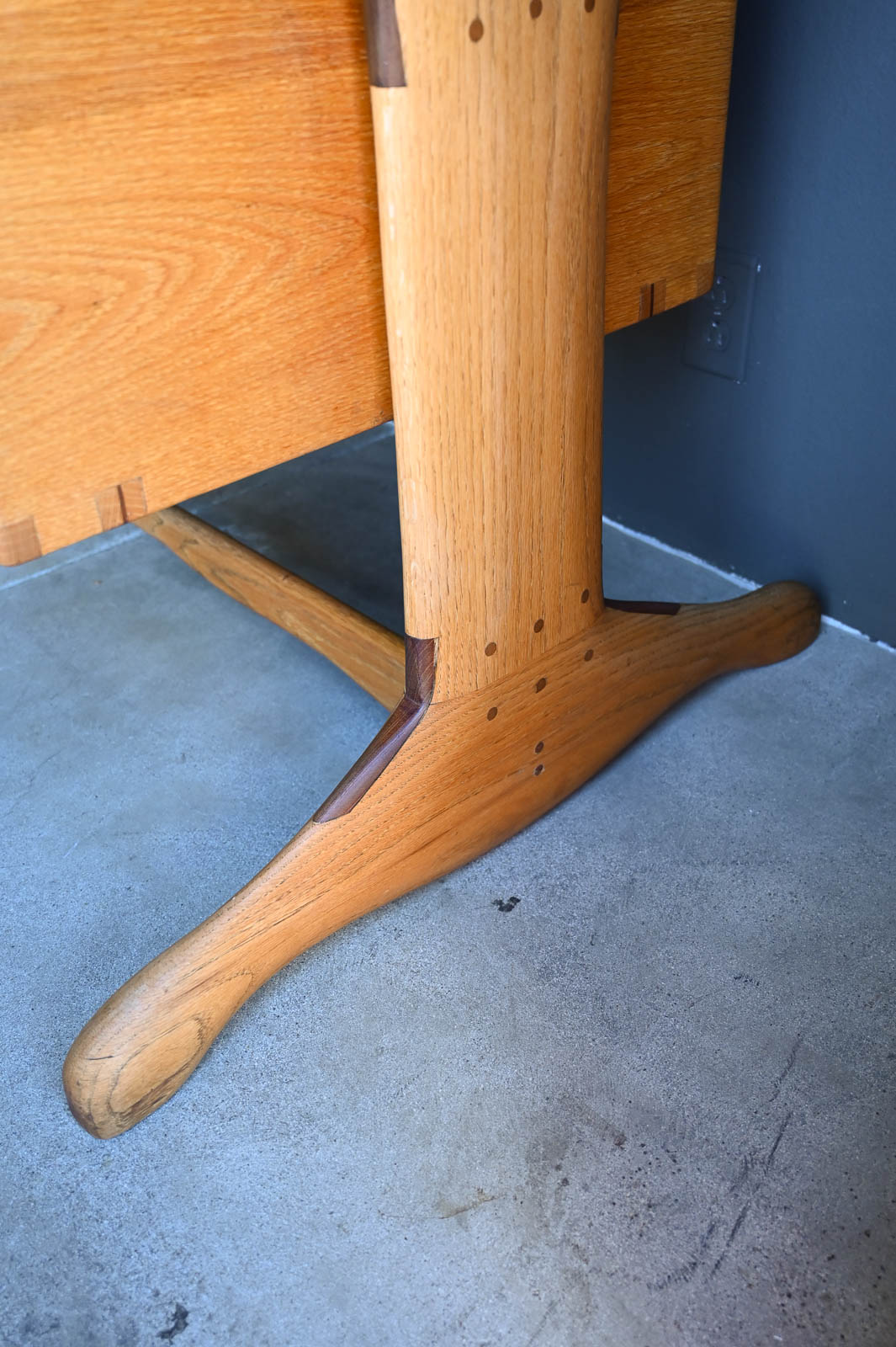 Bespoke Desk by Robert Squire Bierbaum, 1995. Beautiful hand sculpted oak desk with inlay of walnut, cherry and wedge woods. Handmade by Robert Squire Bierbaum of Laguna Beach, CA and commissioned by his client. This beautiful desk is completely handmade and tooled by the artist. Top has been refinished with a clearcoat for longer wear and protection. A beautiful piece of craftsmanship that will add character to any home or office. Signed on the underside by the artist. Measures 63.5″ W x 28.5″ D x 30″ H