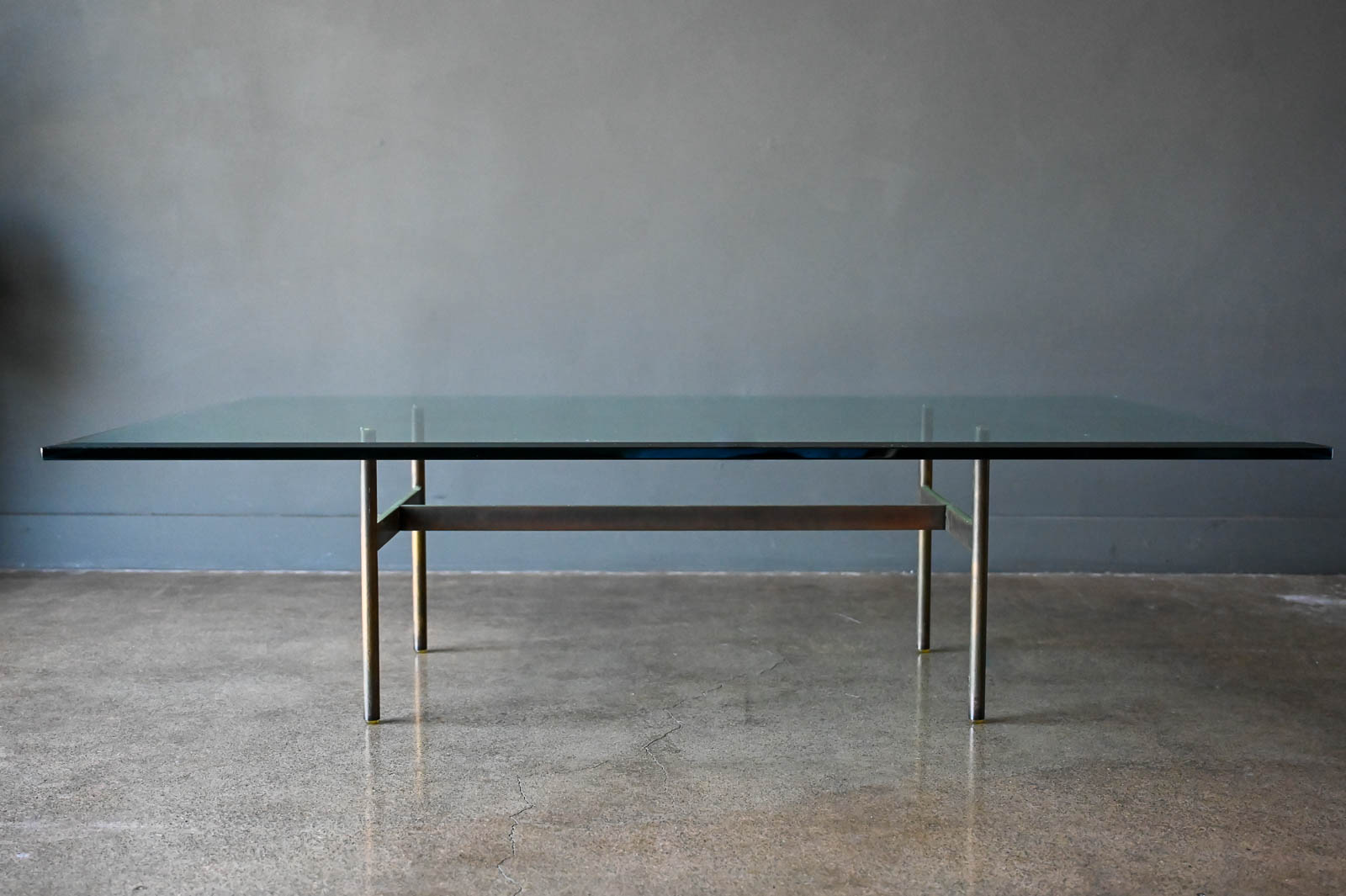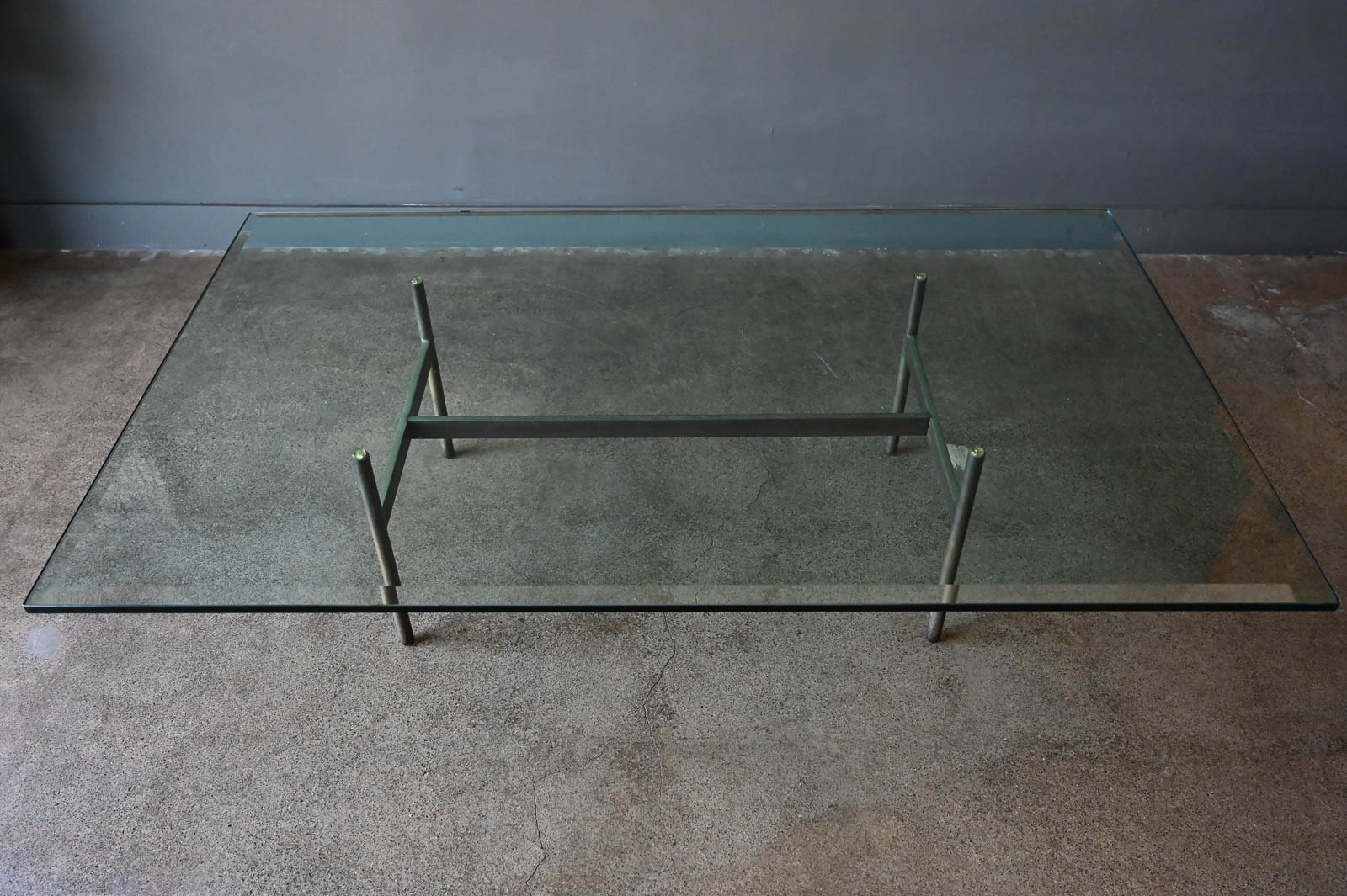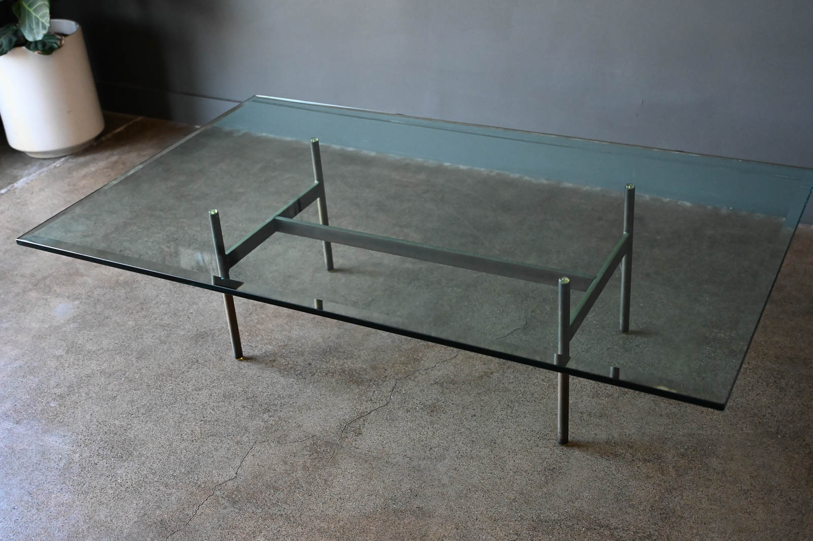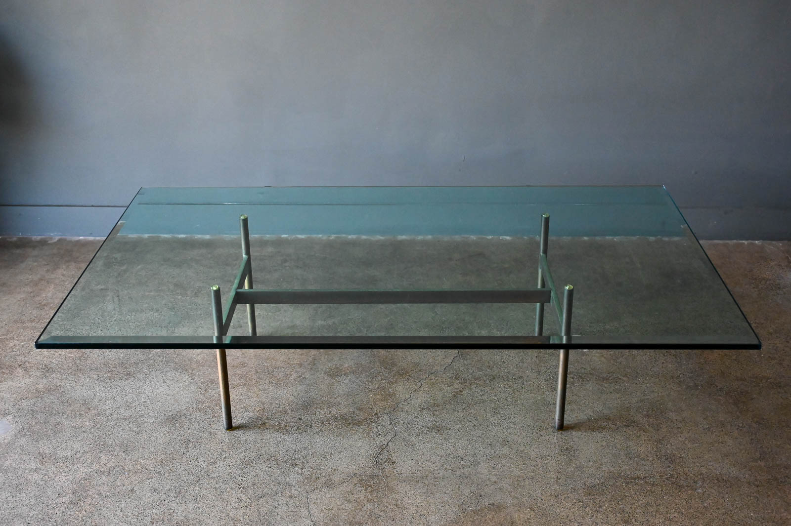 Brass and glass H base coffee table by Gerald McCabe, circa. 1960. Beautiful solid brass base with great patina and original thick beveled glass top in very good vintage condition with only slight wear. Measures 60″ L x 36″ W x 16″ H. Rare brass base, most were in chrome.