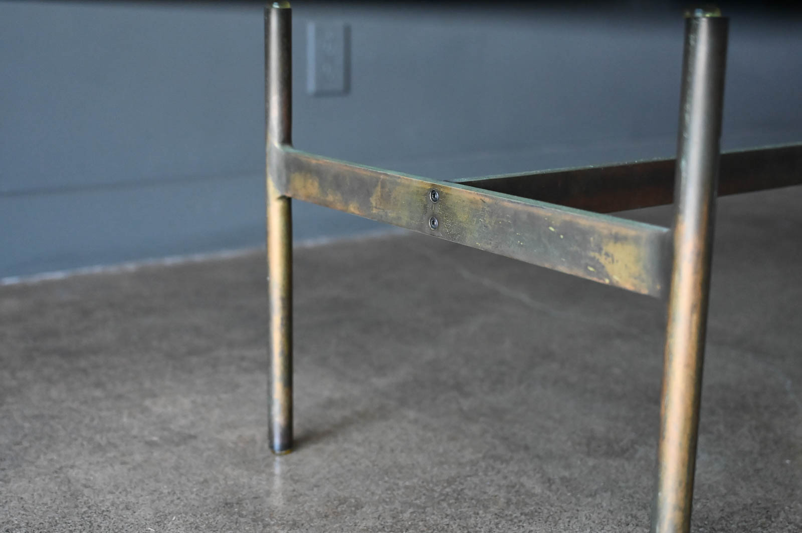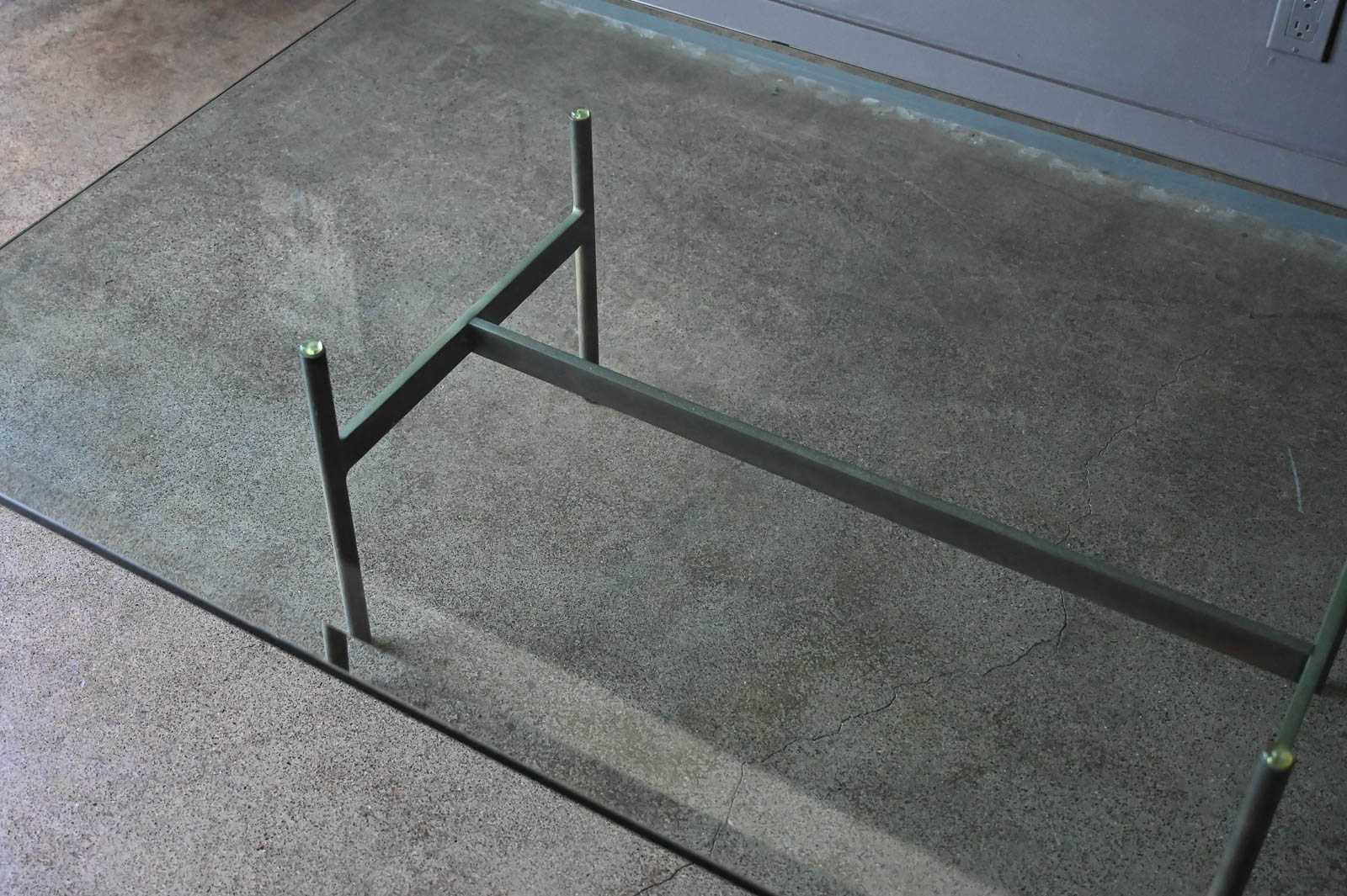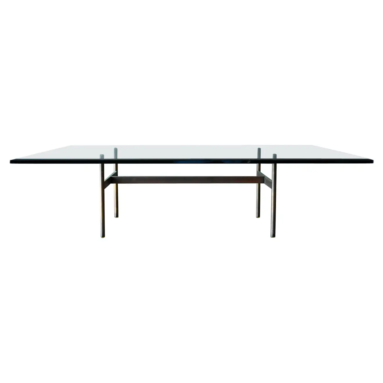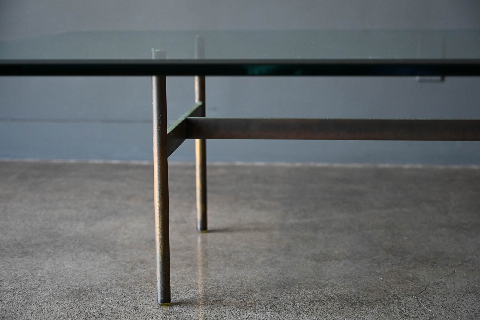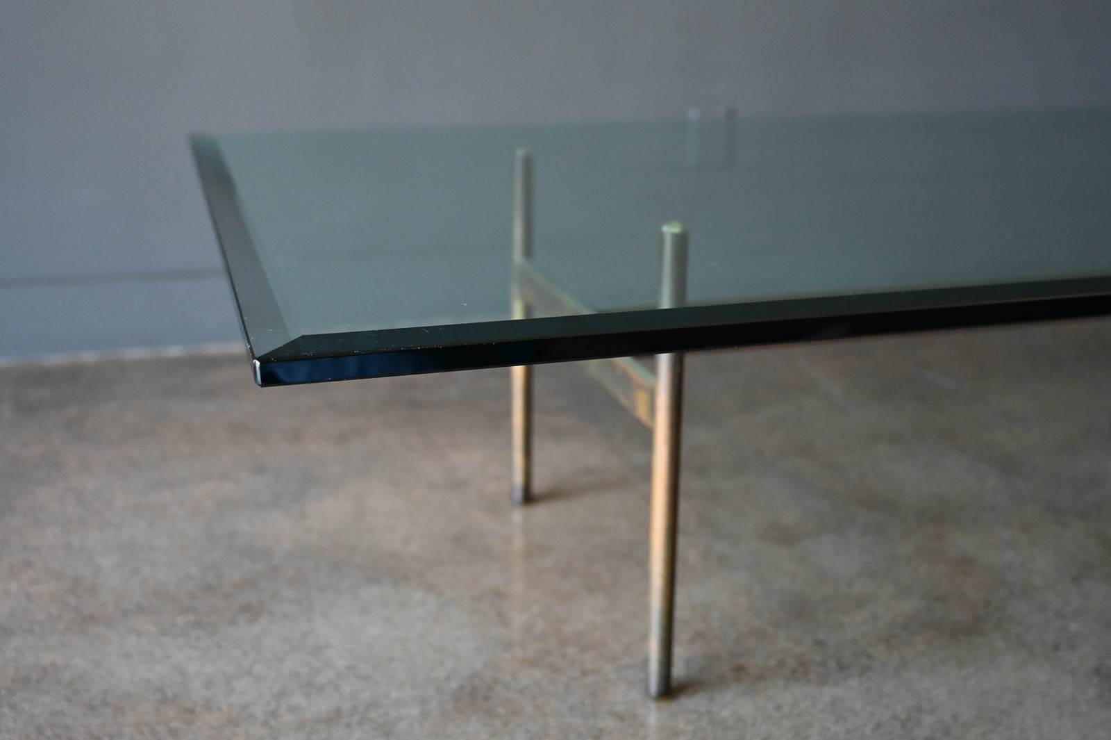Brass and glass H base coffee table by Gerald McCabe, circa. 1960. Beautiful solid brass base with great patina and original thick beveled glass top in very good vintage condition with only slight wear. Measures 60″ L x 36″ W x 16″ H. Rare brass base, most were in chrome.