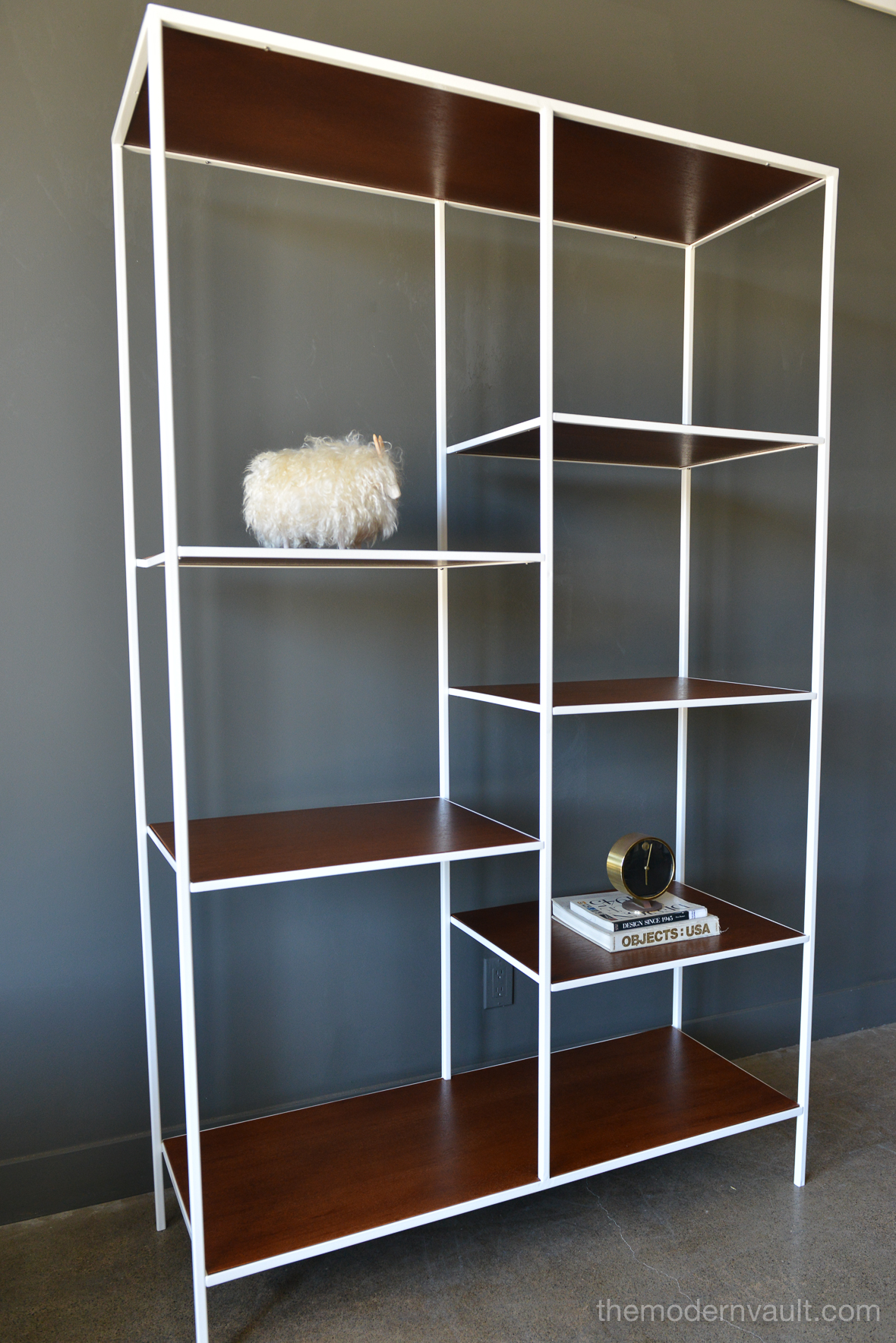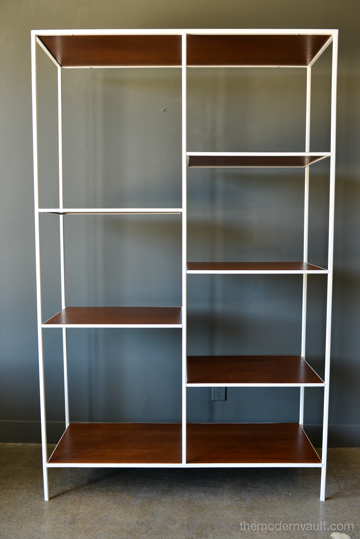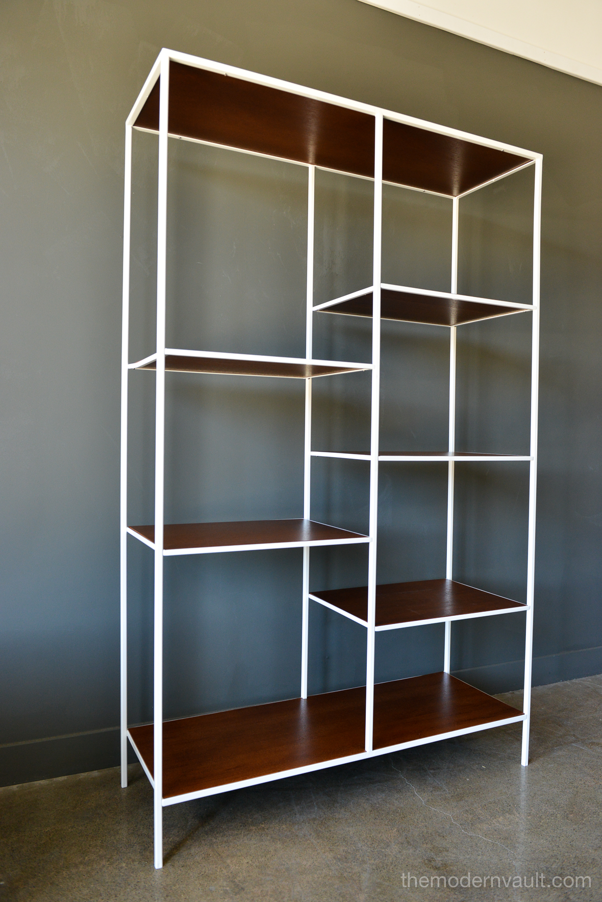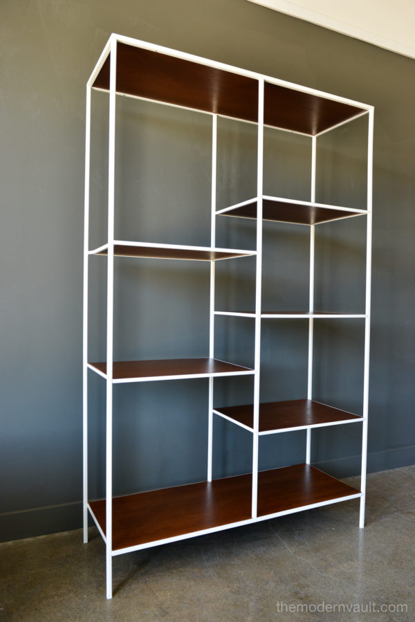 Frederic Weinberg Case Study Iron and Mahogany Etagere or Room Divider, ca. 1950. Could be used as a display cabinet, bookshelf or room divider. Beautiful ribbon mahogany shelving has been professionally restored and the iron has been newly powder coated. Very versatile pieces would look great in any room. Showroom perfect condition.