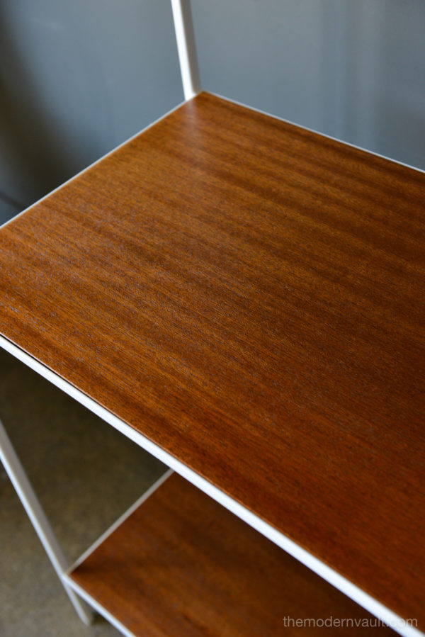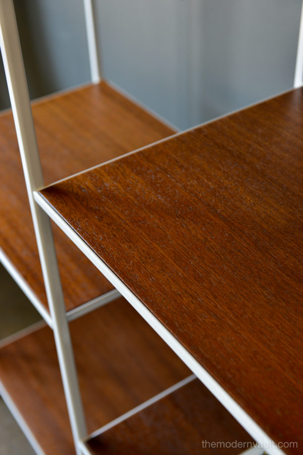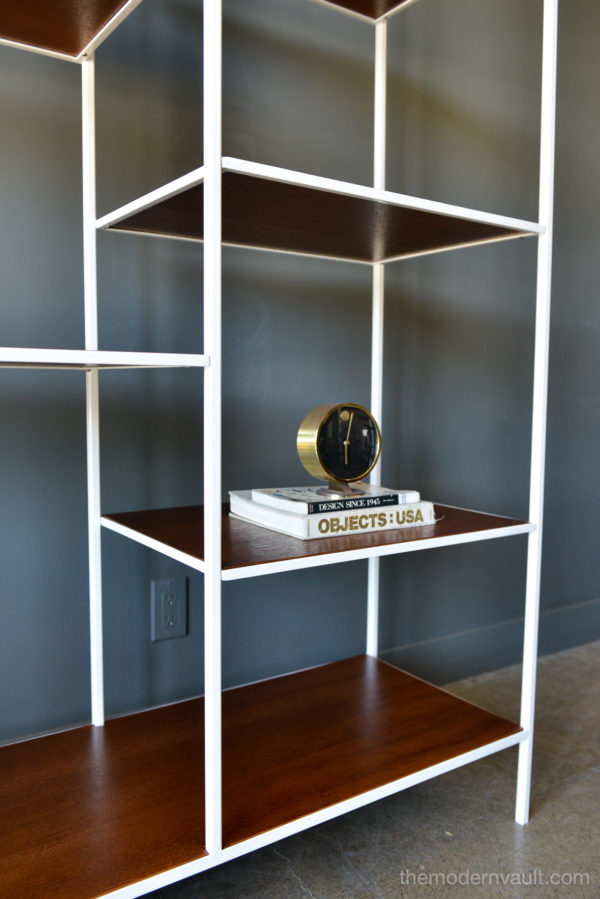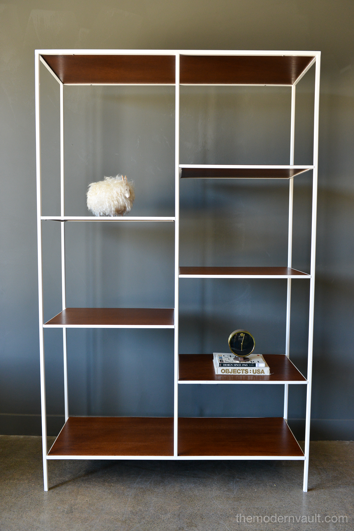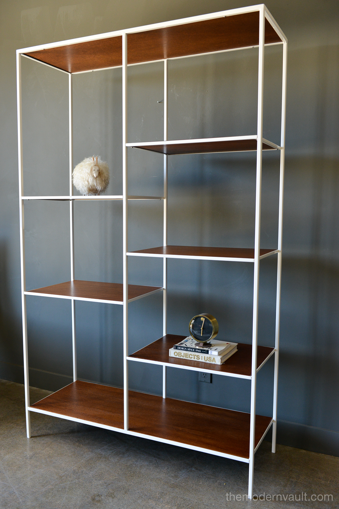 Frederic Weinberg Case Study Iron and Mahogany Etagere or Room Divider, ca. 1950. Could be used as a display cabinet, bookshelf or room divider. Beautiful ribbon mahogany shelving has been professionally restored and the iron has been newly powder coated. Very versatile pieces would look great in any room. Showroom perfect condition.