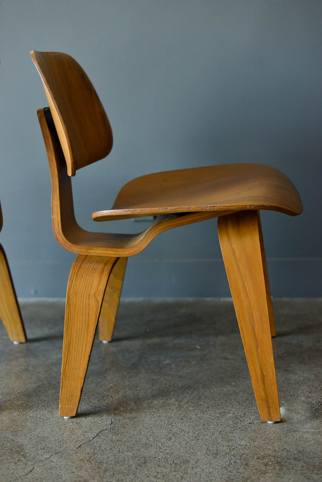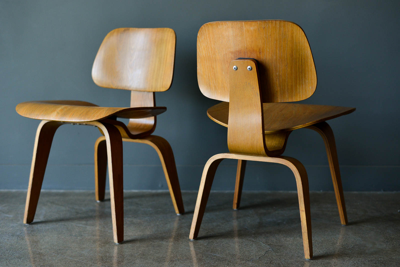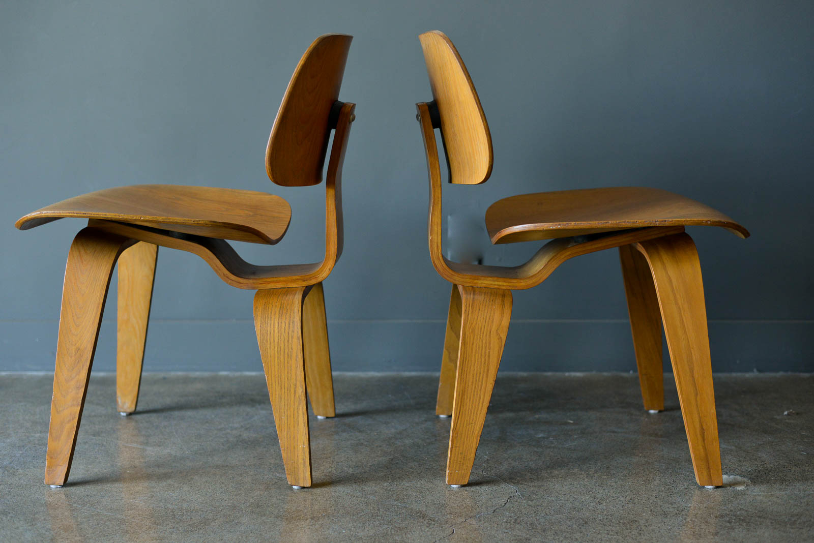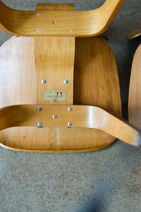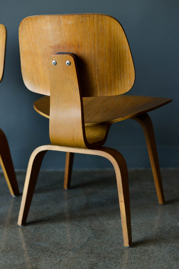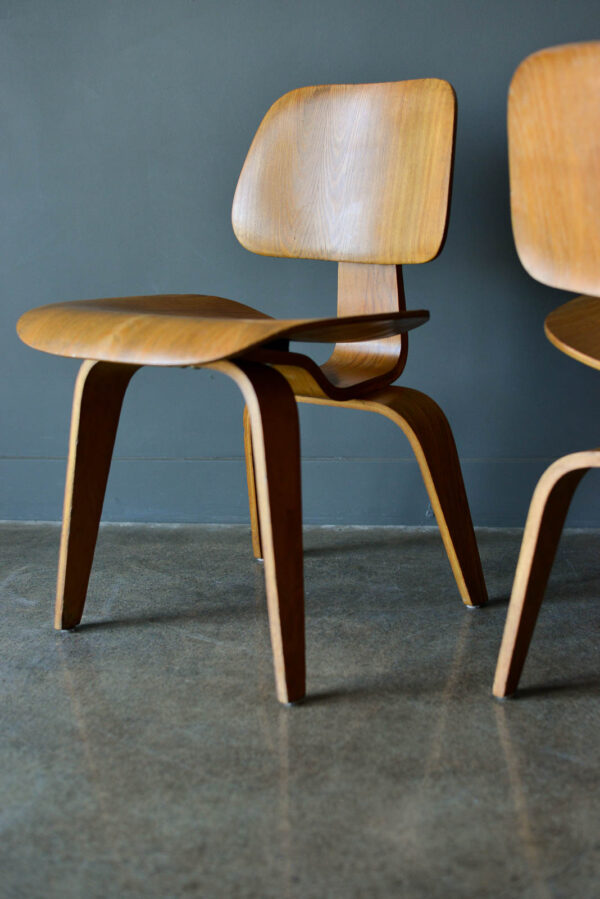 Charles and Ray Eames for Evans Pair of DCW Chairs, ca. 1950. Pair of original Charles and Ray Eames for Evans Products DCW (dining chair wood). Beautiful original condition with no restorations. Shock mounts are still good and usable, very slight wear as shown.