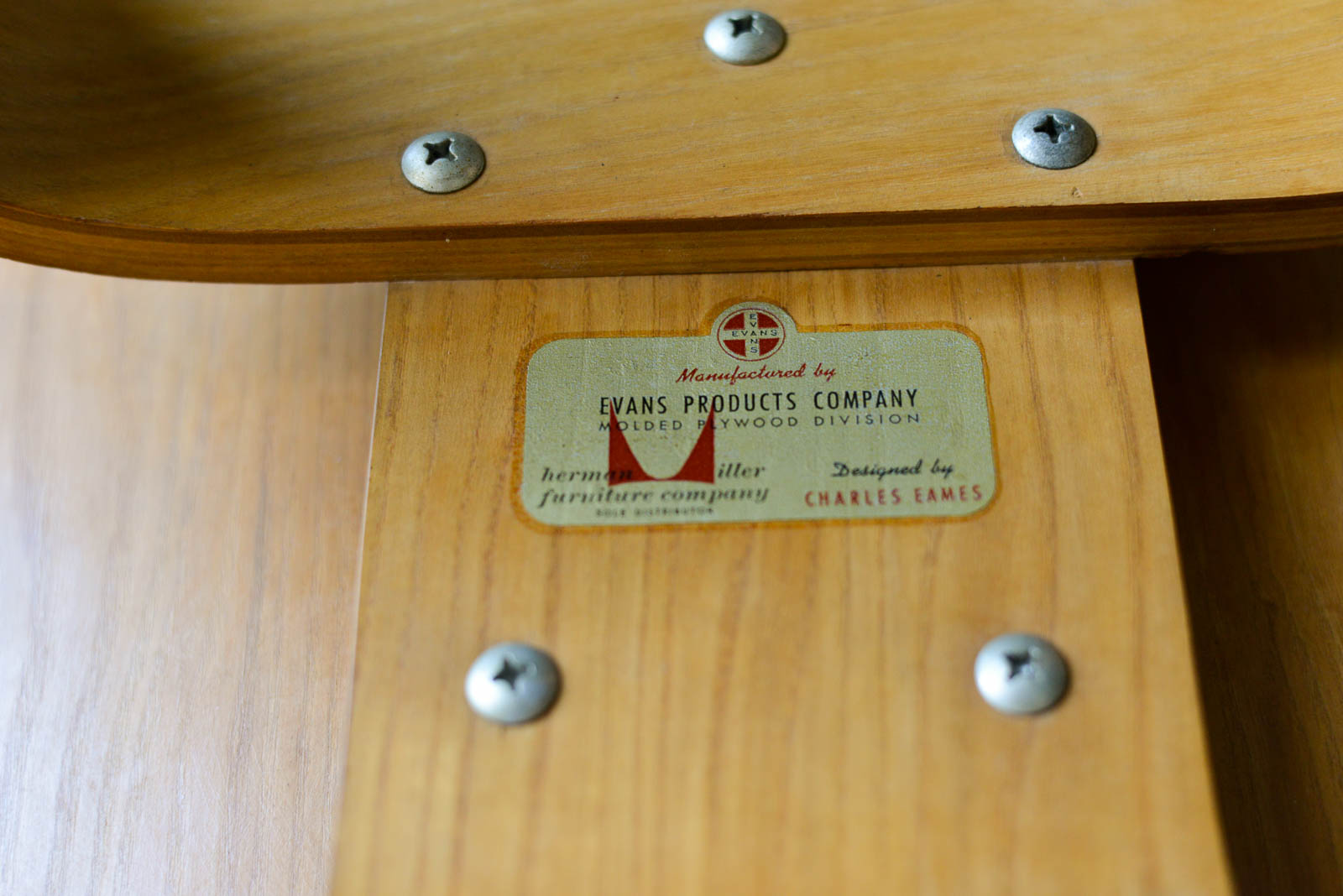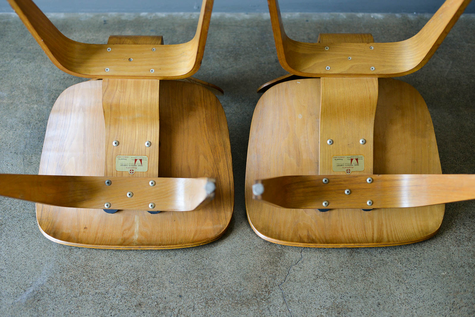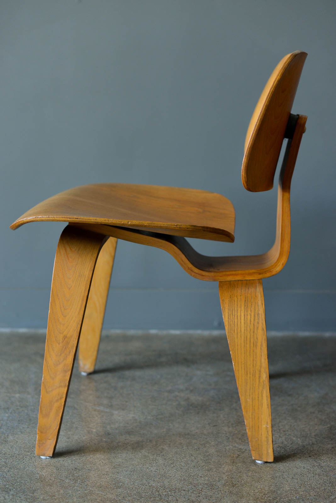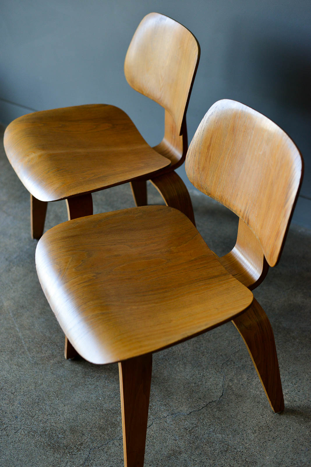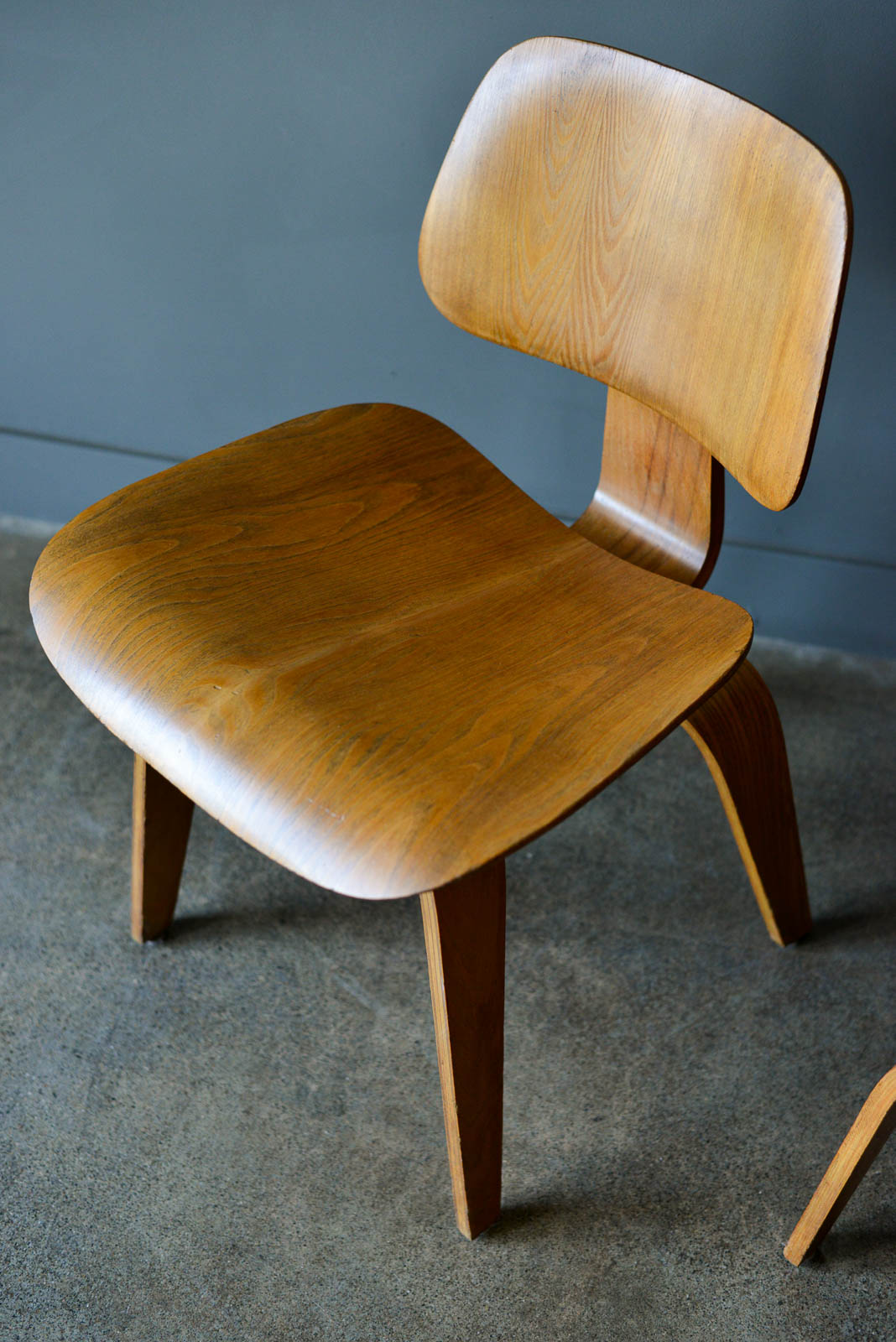 Charles and Ray Eames for Evans Pair of DCW Chairs, ca. 1950. Pair of original Charles and Ray Eames for Evans Products DCW (dining chair wood). Beautiful original condition with no restorations. Shock mounts are still good and usable, very slight wear as shown.