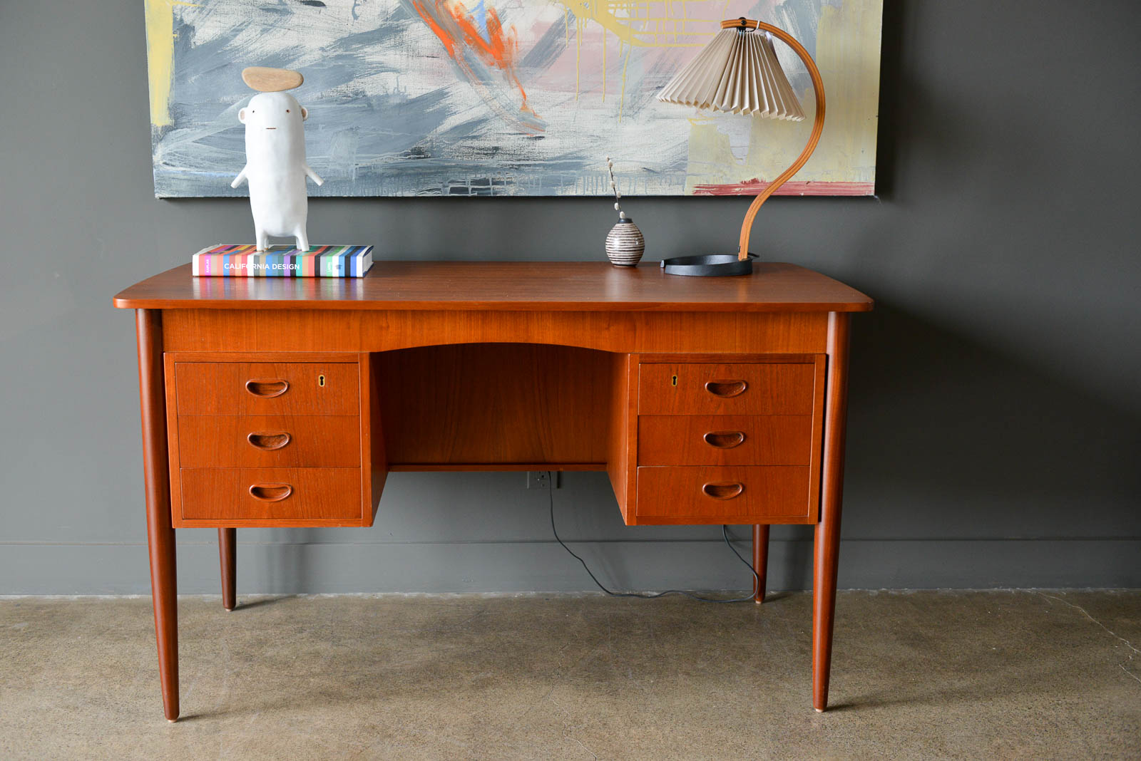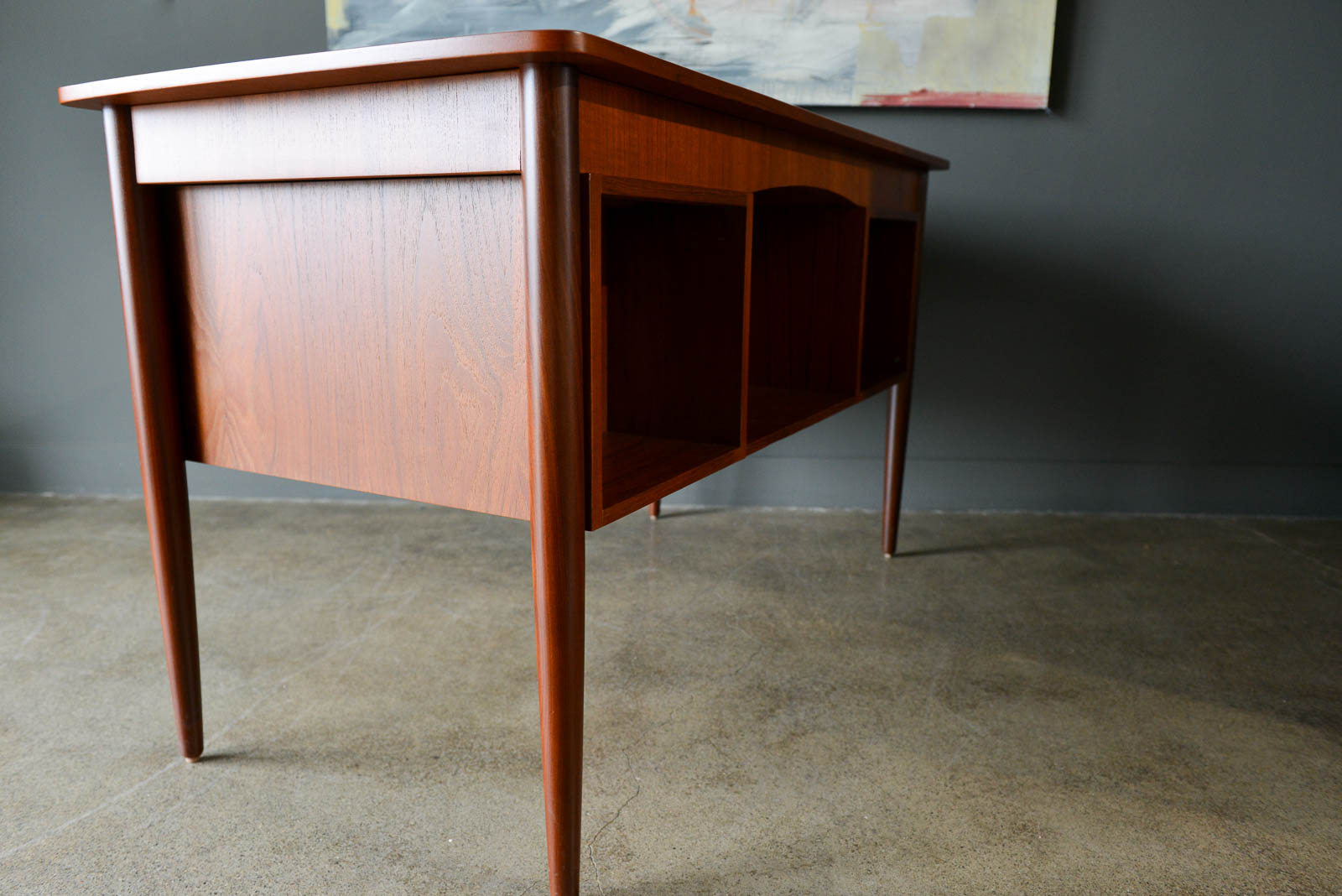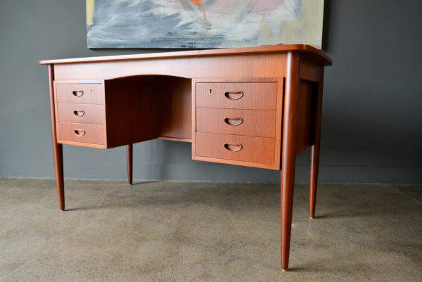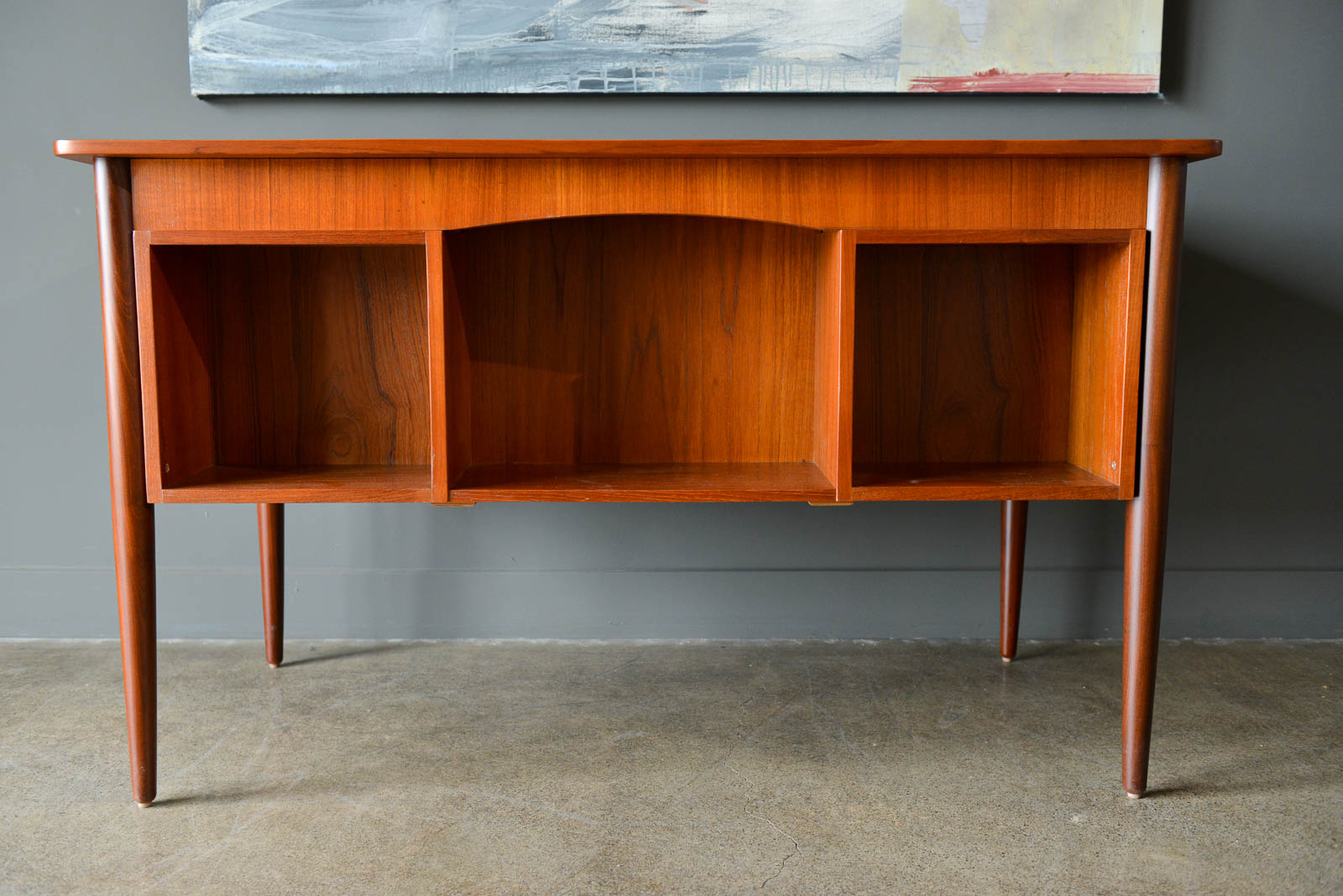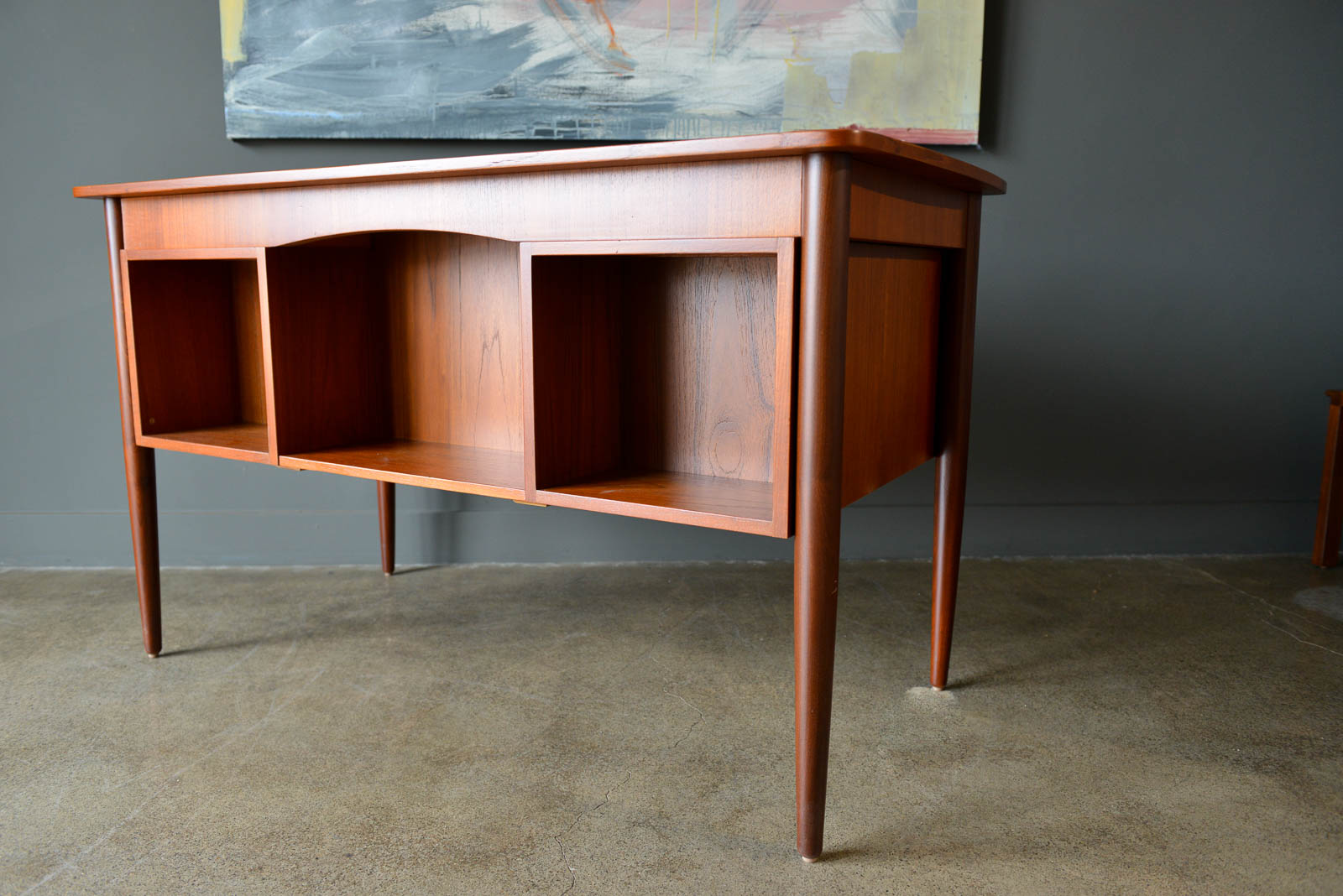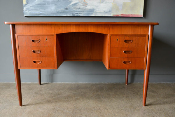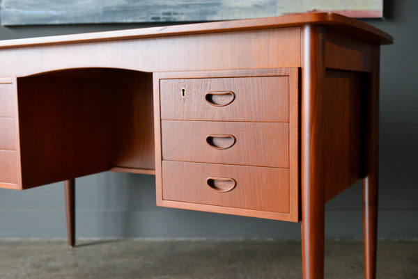 Danish Teak Writing Desk with Open Bookshelf, ca. 1960. Professionally restored in showroom condition, this beautiful desk has two locking upper drawers with the original key included. Three drawers on each side for abundant storage and an open back so desk can float in a room beautifully. The top has a nice curved edge and exposed side legs give great detail. Measures 50.5″ W x 25″ D x 30″ H. Opening for seat measures 17″ Wide