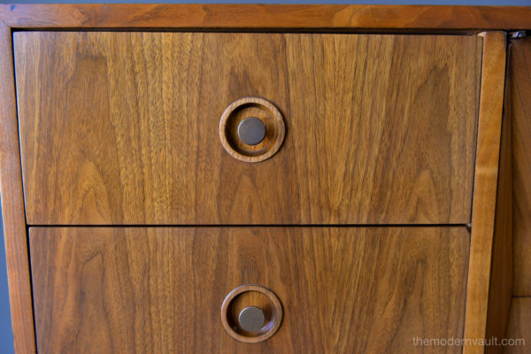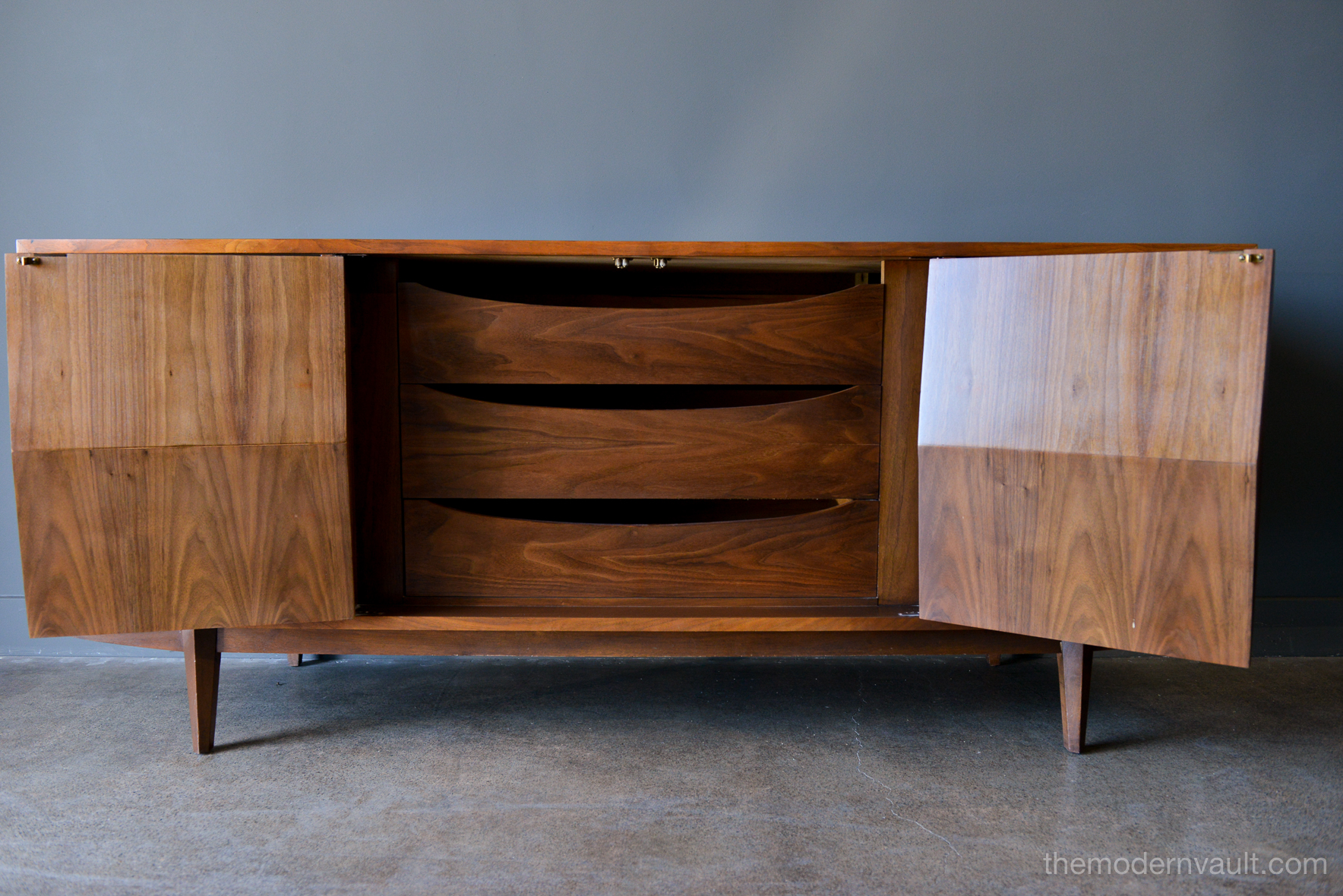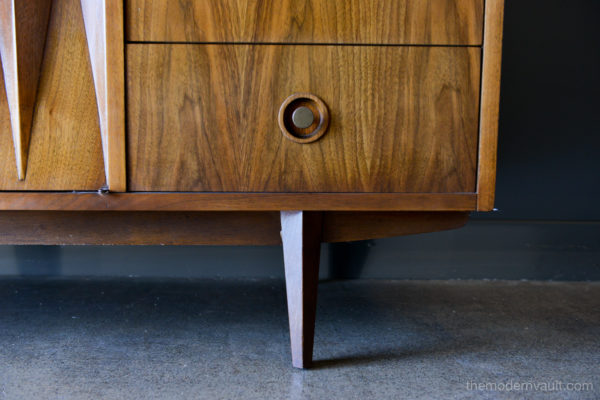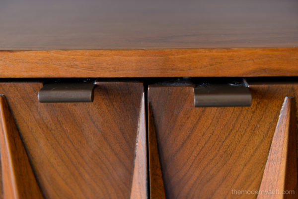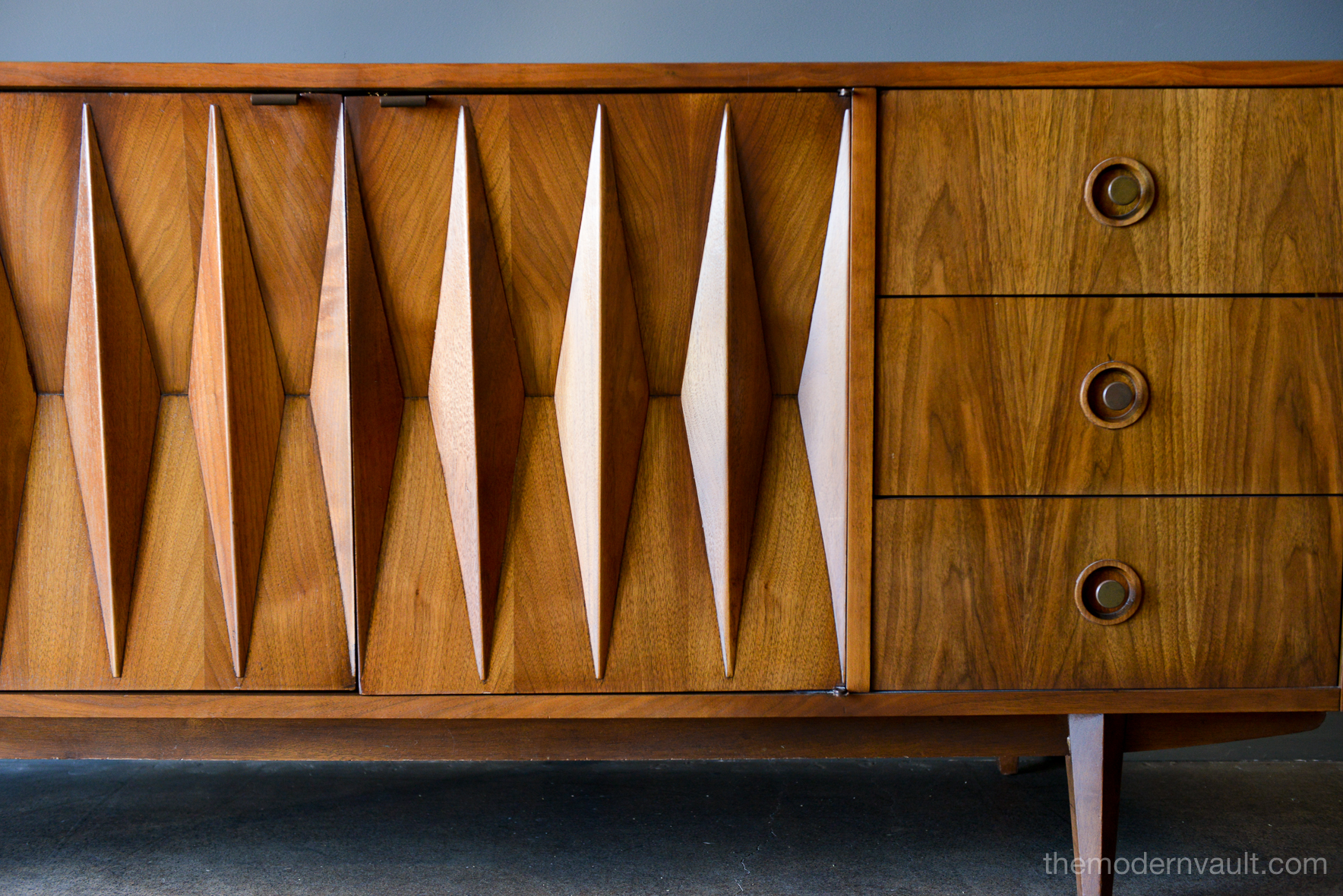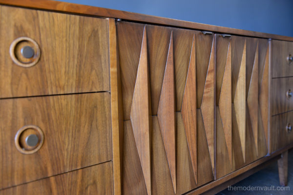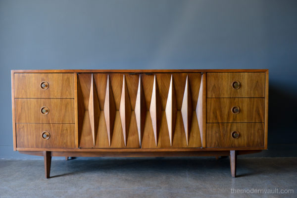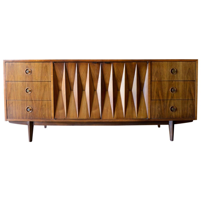 Diamond front sculpted walnut credenza by Albert Parvin, circa 1960. Beautifully sculpted solid walnut detailing with double doors that open to three inner drawers. Six smaller drawers on the outside. Beautiful original condition, hardly any wear as shown.