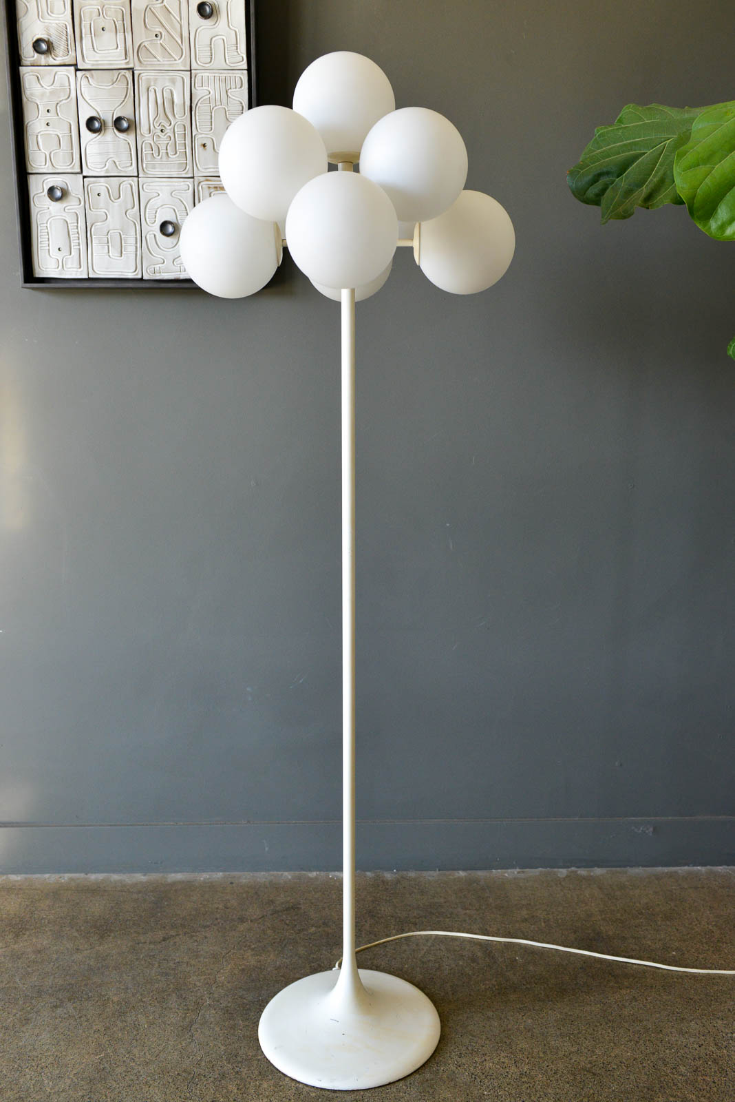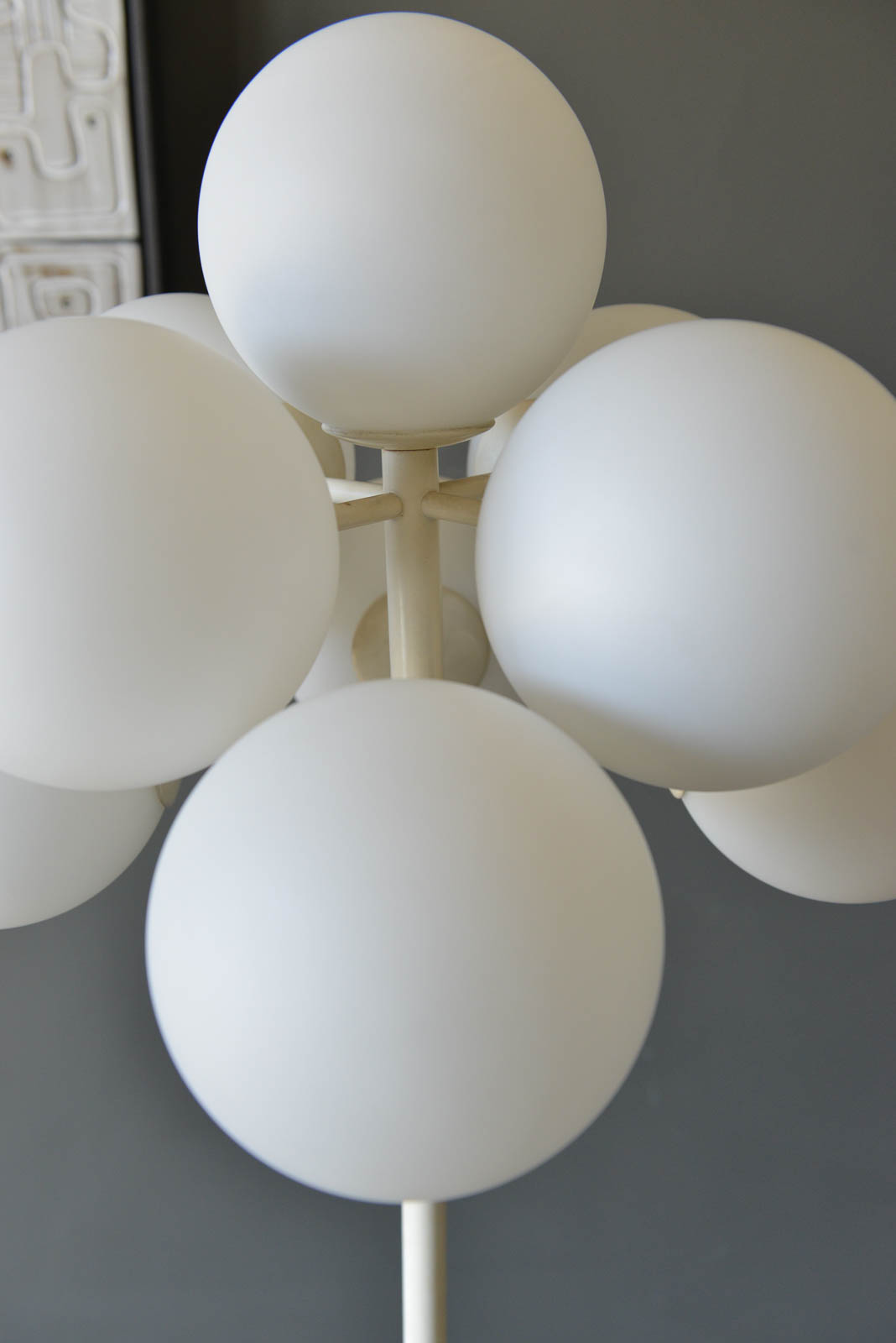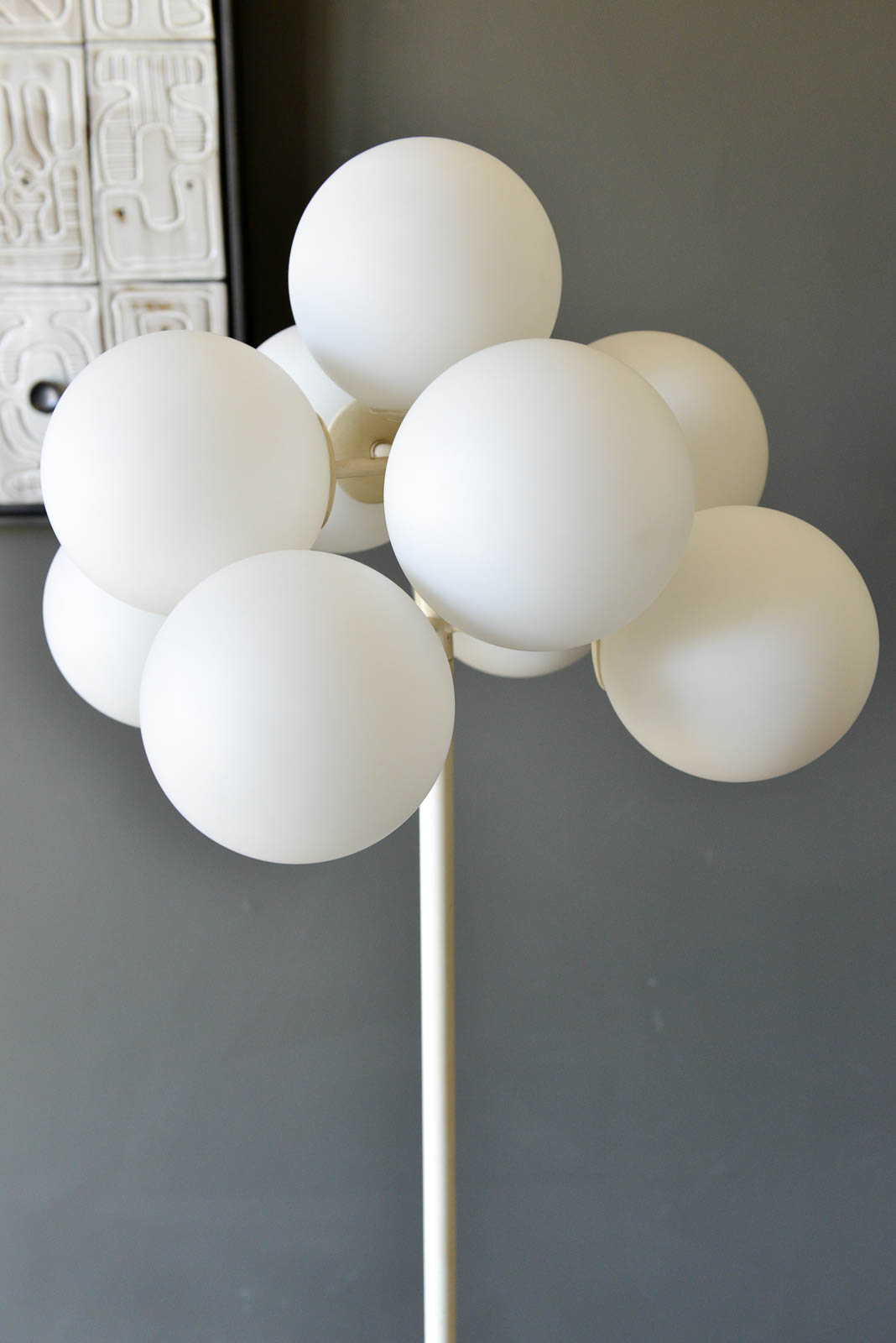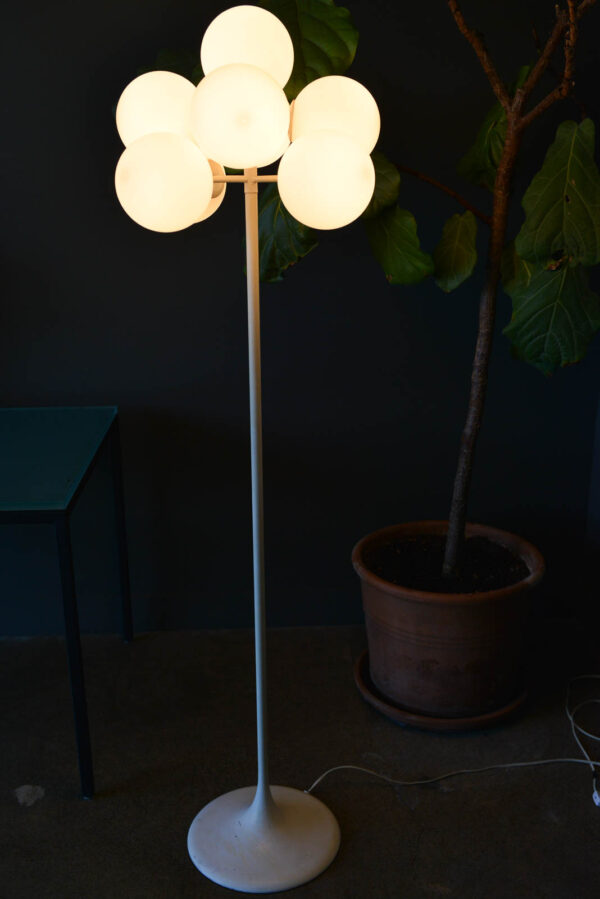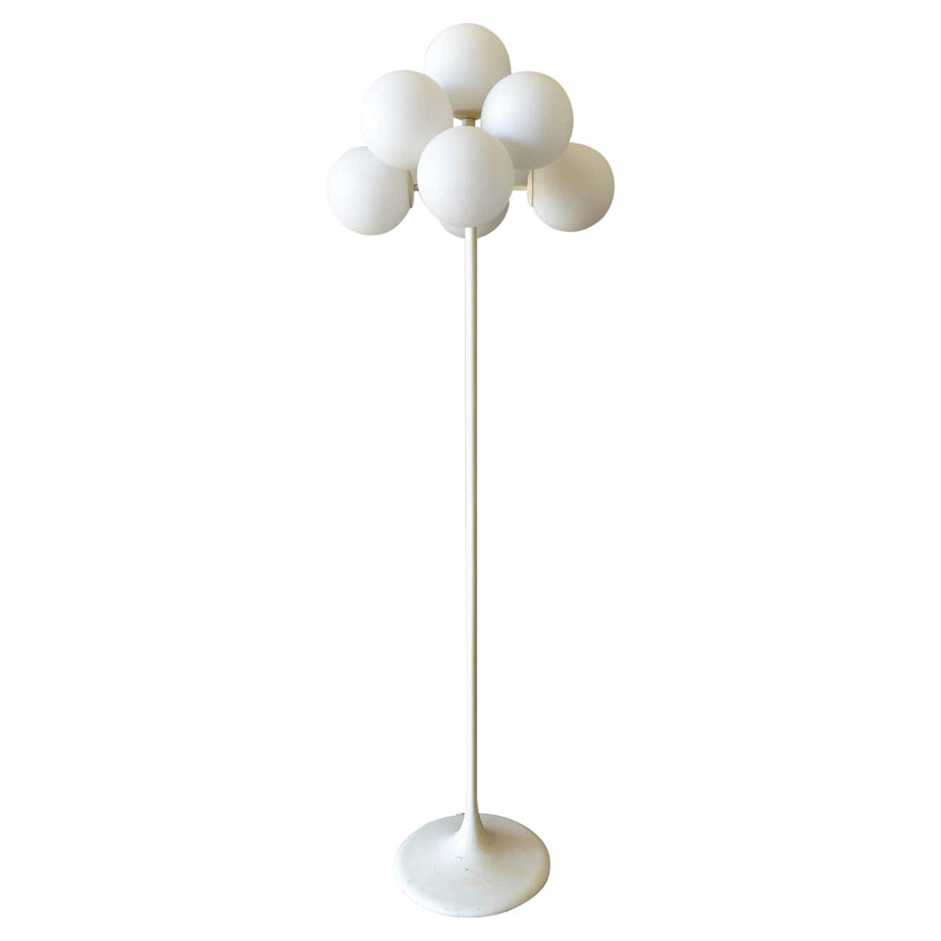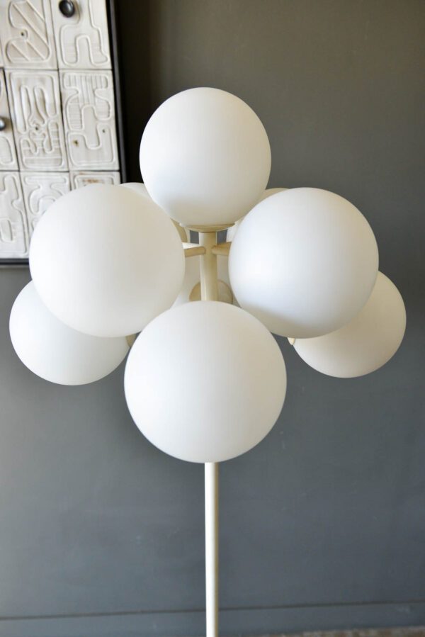 Eva Rene Nele Bode for Temde Leuchten Bubble Floor Lamp, 1965. Beautiful design with nine threaded blown glass globes on a cast aluminum base. Lamp is quite heavy and in very good original condition. White enameled base has some slight wear ash shown but very usable in as found condition. The globes are free of cracks or chips and it works perfectly. Original cord and floor switch. Measures 63″ Height x 19″ Diameter at top. Globes are 6″ diameter each.