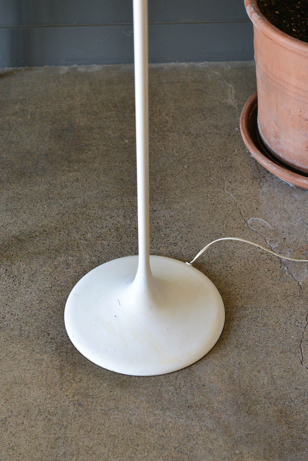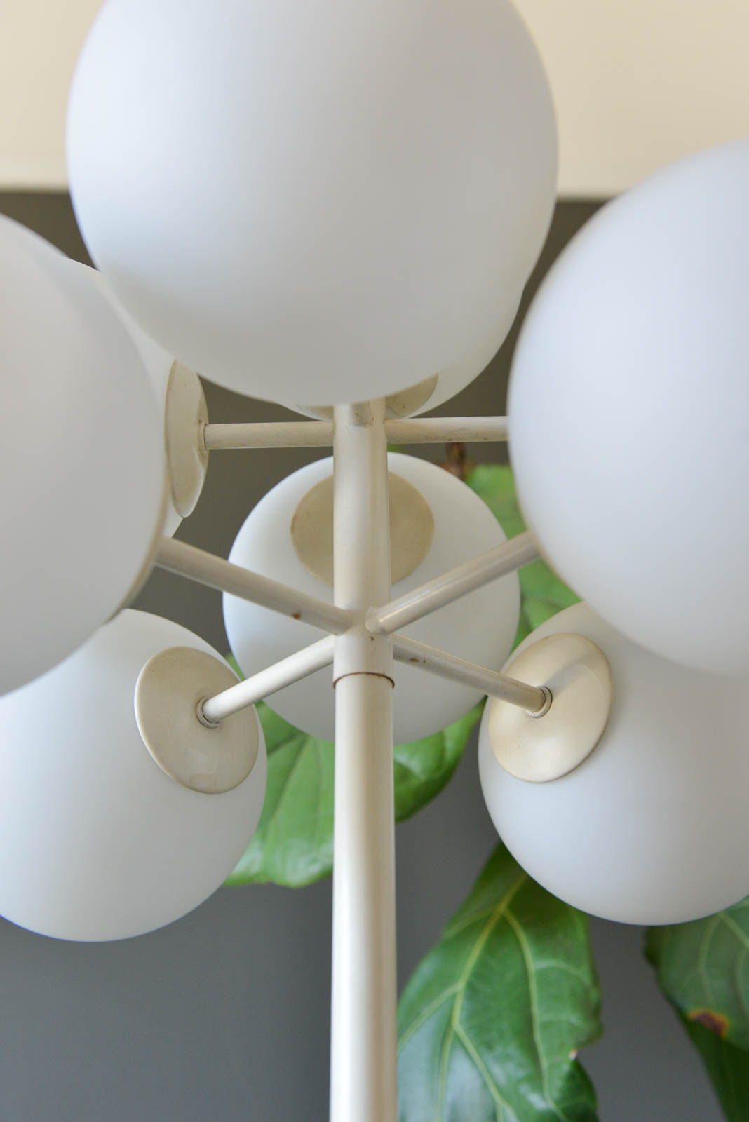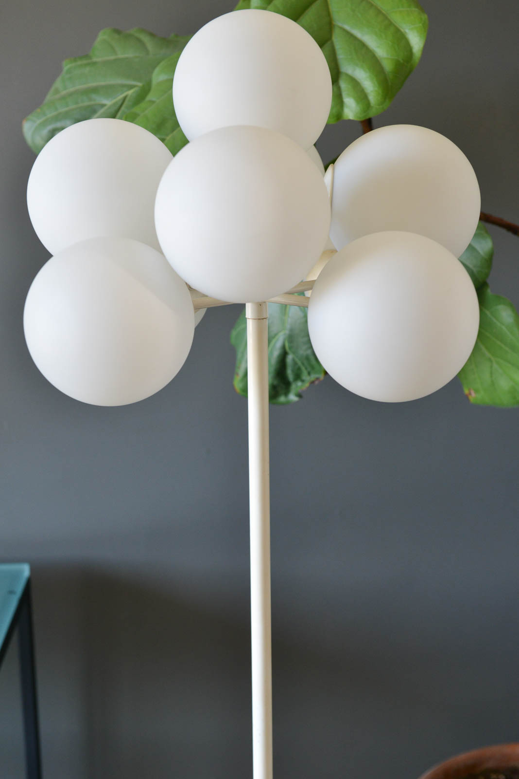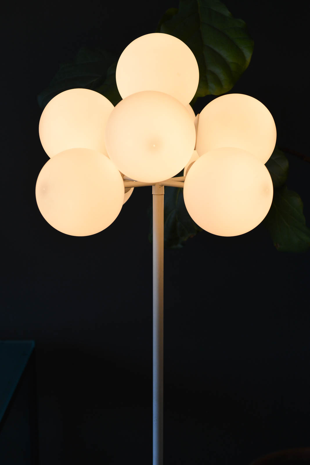 Eva Rene Nele Bode for Temde Leuchten Bubble Floor Lamp, 1965. Beautiful design with nine threaded blown glass globes on a cast aluminum base. Lamp is quite heavy and in very good original condition. White enameled base has some slight wear ash shown but very usable in as found condition. The globes are free of cracks or chips and it works perfectly. Original cord and floor switch. Measures 63″ Height x 19″ Diameter at top. Globes are 6″ diameter each.