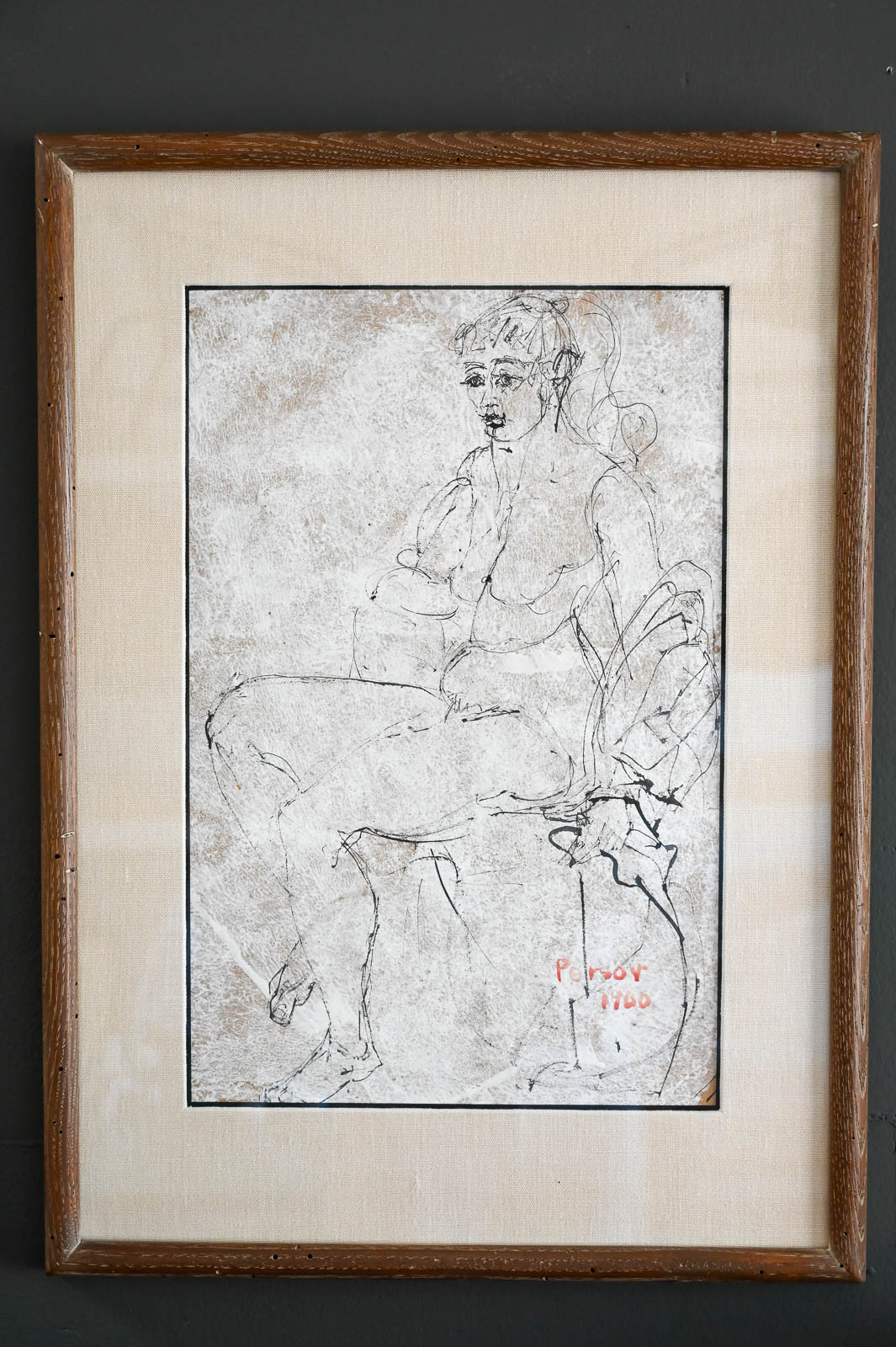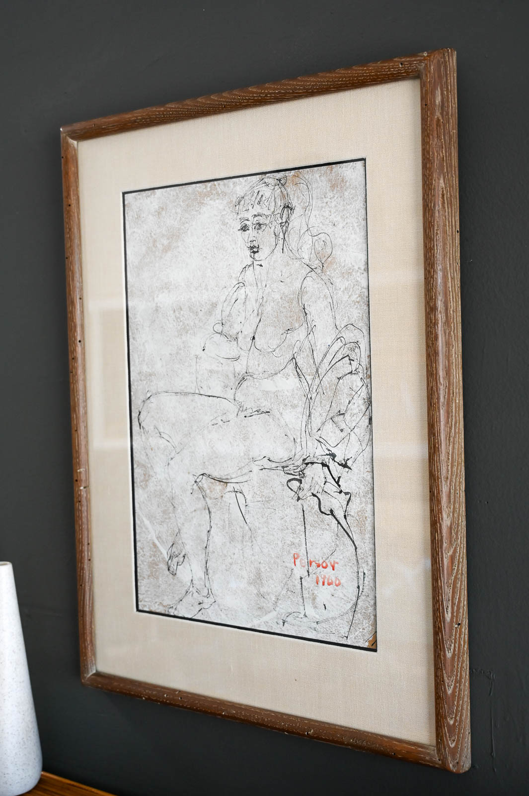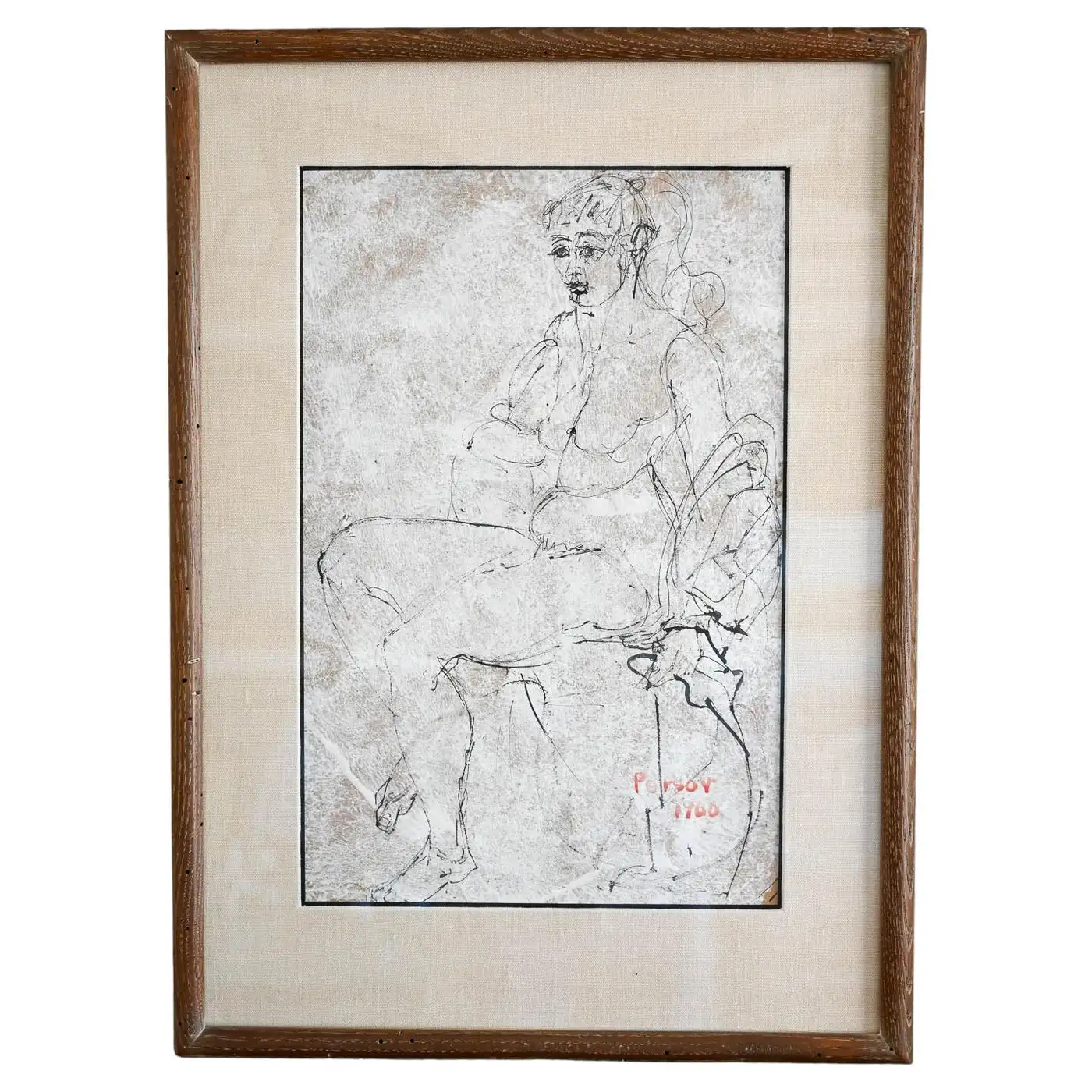 Figurative Etching by Ann Marie Persov, 1960. Framed in original frame and linen mat board, this beautiful figurative aquatint etching is a great size for any intimate space. Ms. Persov was a resident of Orange County, CA. Measures 20″ W x 27″ H. Actual print measures 12.5″ x 19.25″