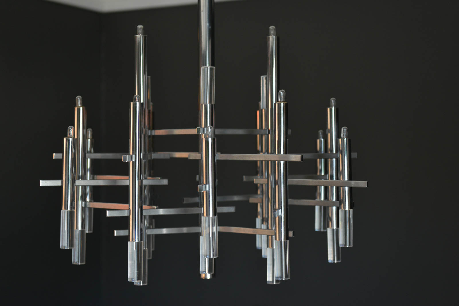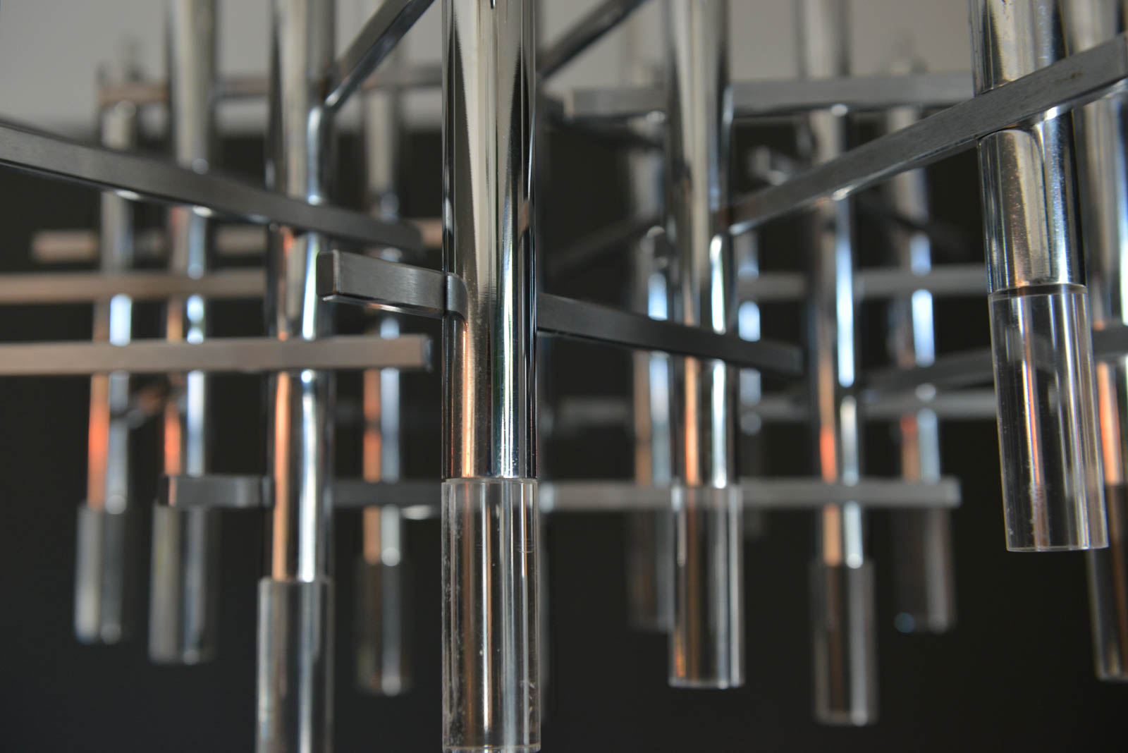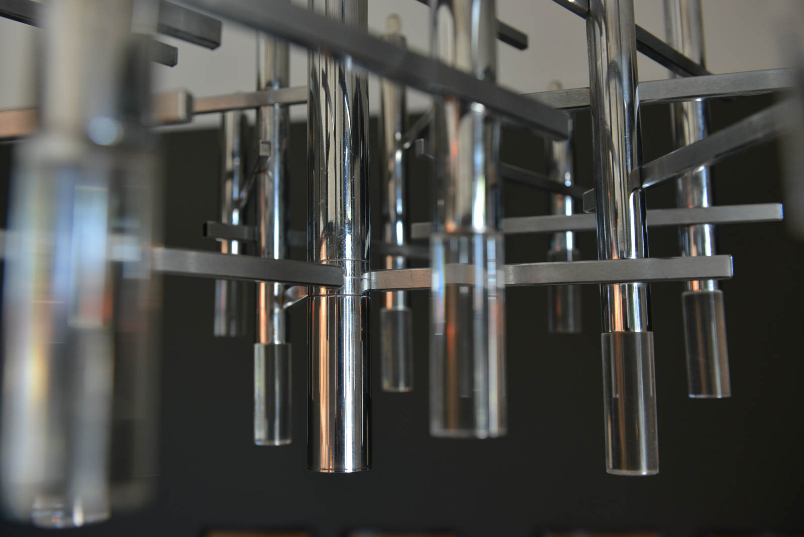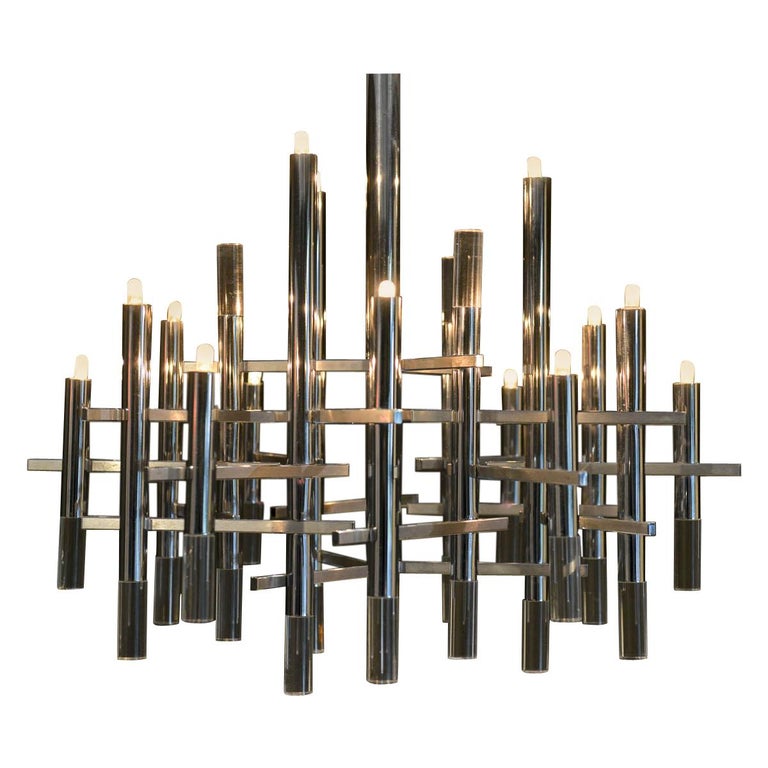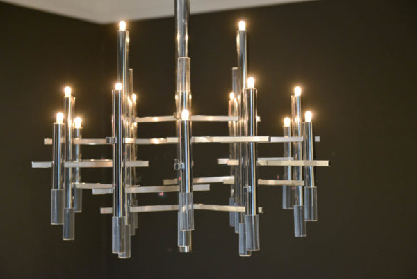 Gaetano Sciolari chrome and Lucite chandelier, circa 1970. Sculptural modern chandelier designed by Gaetano Sciolari in Italy, circa 1970s. This elegant chandelier features twelve chrome and Lucite vertical cylinders, nine of which hold the light-bulbs and are connected with horizontal tubes resembling a pipeline. Its polished and architectural chromed body creates a dazzling atmosphere reflecting the light through it for a warm and cozy flair at any room. Sciolari’s light fixtures are widely known for his significant contribution to Modern Italian design and for having the ideal blend of modern and contemporary features adapting effortlessly to any environment.  Sourced from Eva Gabor’s former estate designed by Arthur Elrod.