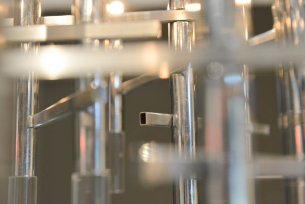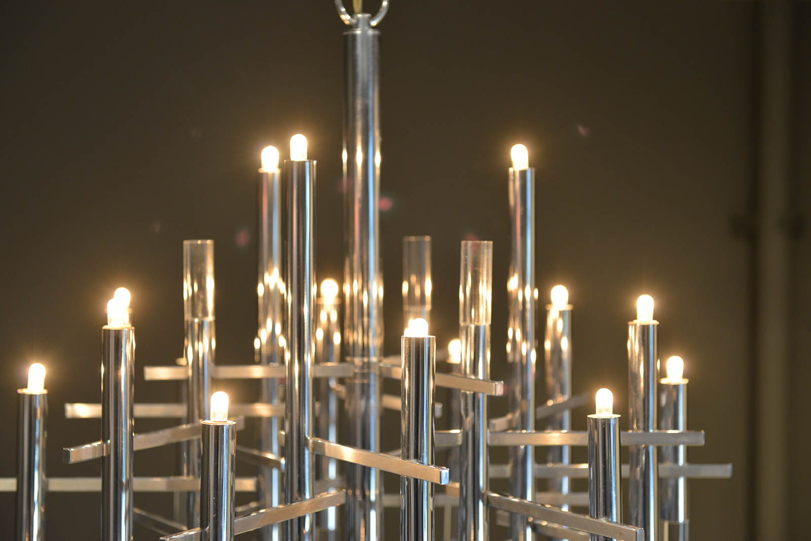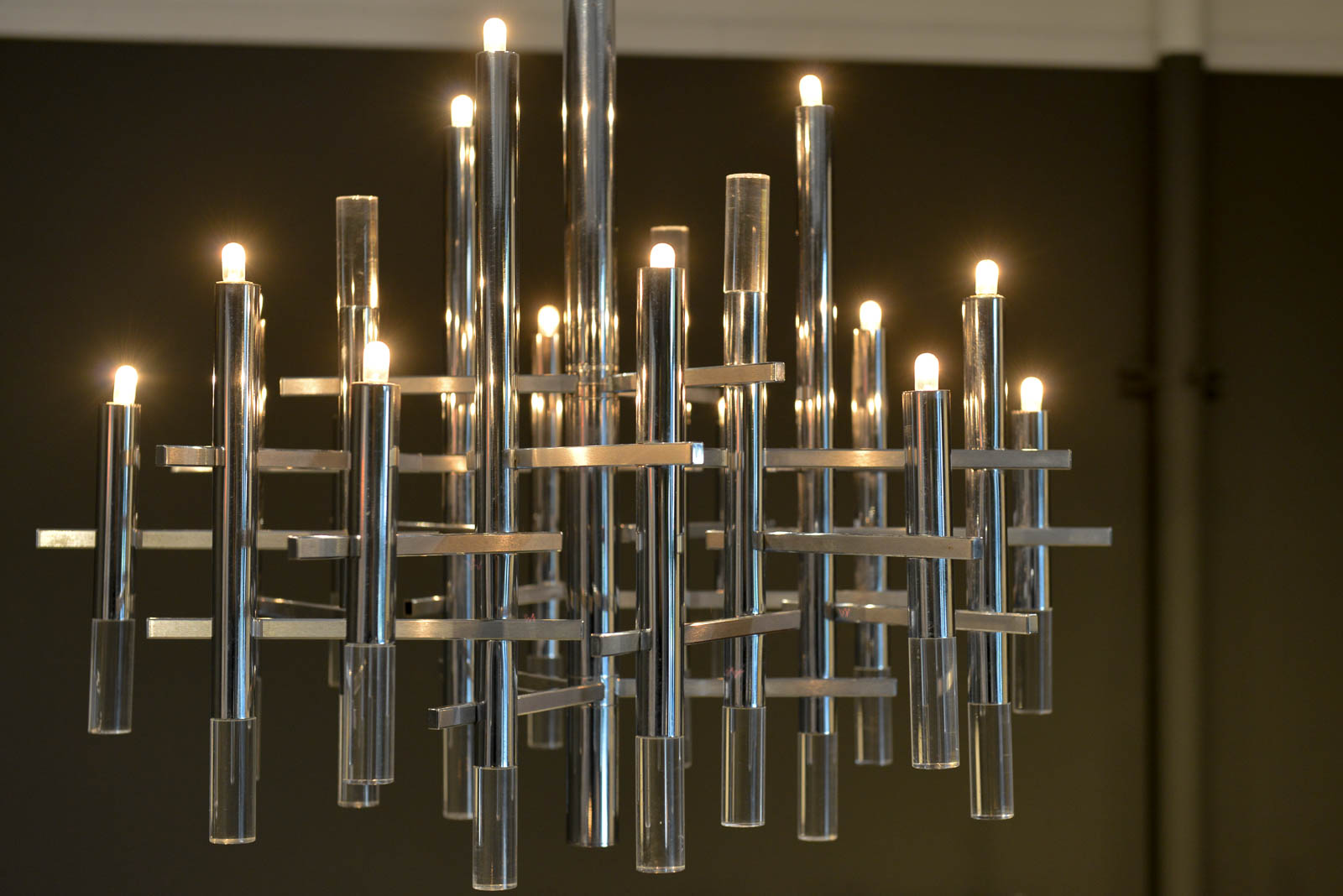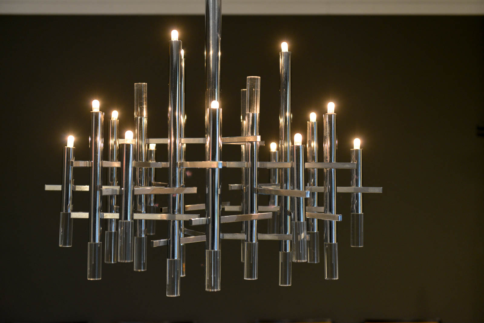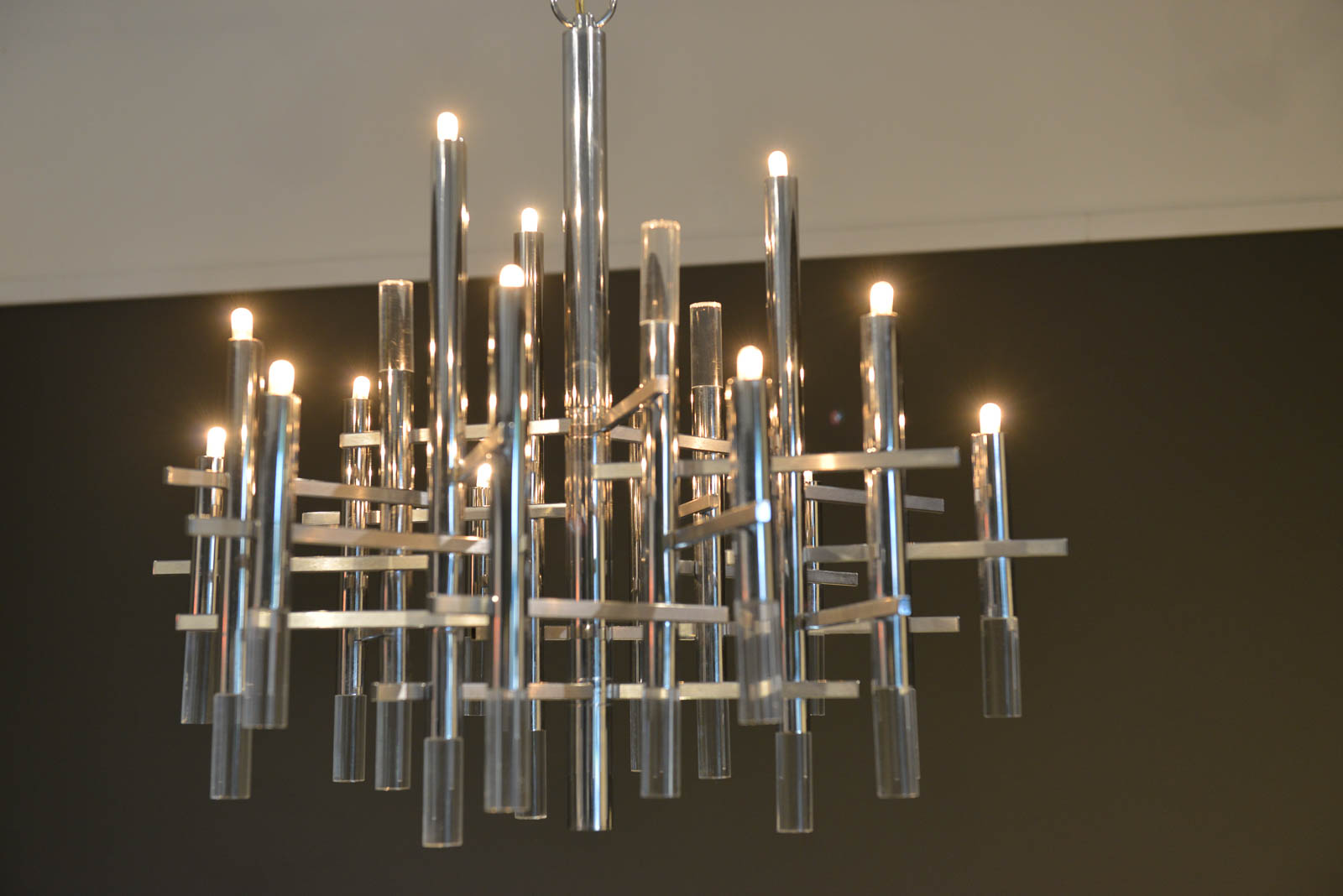 Gaetano Sciolari chrome and Lucite chandelier, circa 1970. Sculptural modern chandelier designed by Gaetano Sciolari in Italy, circa 1970s. This elegant chandelier features twelve chrome and Lucite vertical cylinders, nine of which hold the light-bulbs and are connected with horizontal tubes resembling a pipeline. Its polished and architectural chromed body creates a dazzling atmosphere reflecting the light through it for a warm and cozy flair at any room. Sciolari’s light fixtures are widely known for his significant contribution to Modern Italian design and for having the ideal blend of modern and contemporary features adapting effortlessly to any environment.  Sourced from Eva Gabor’s former estate designed by Arthur Elrod.