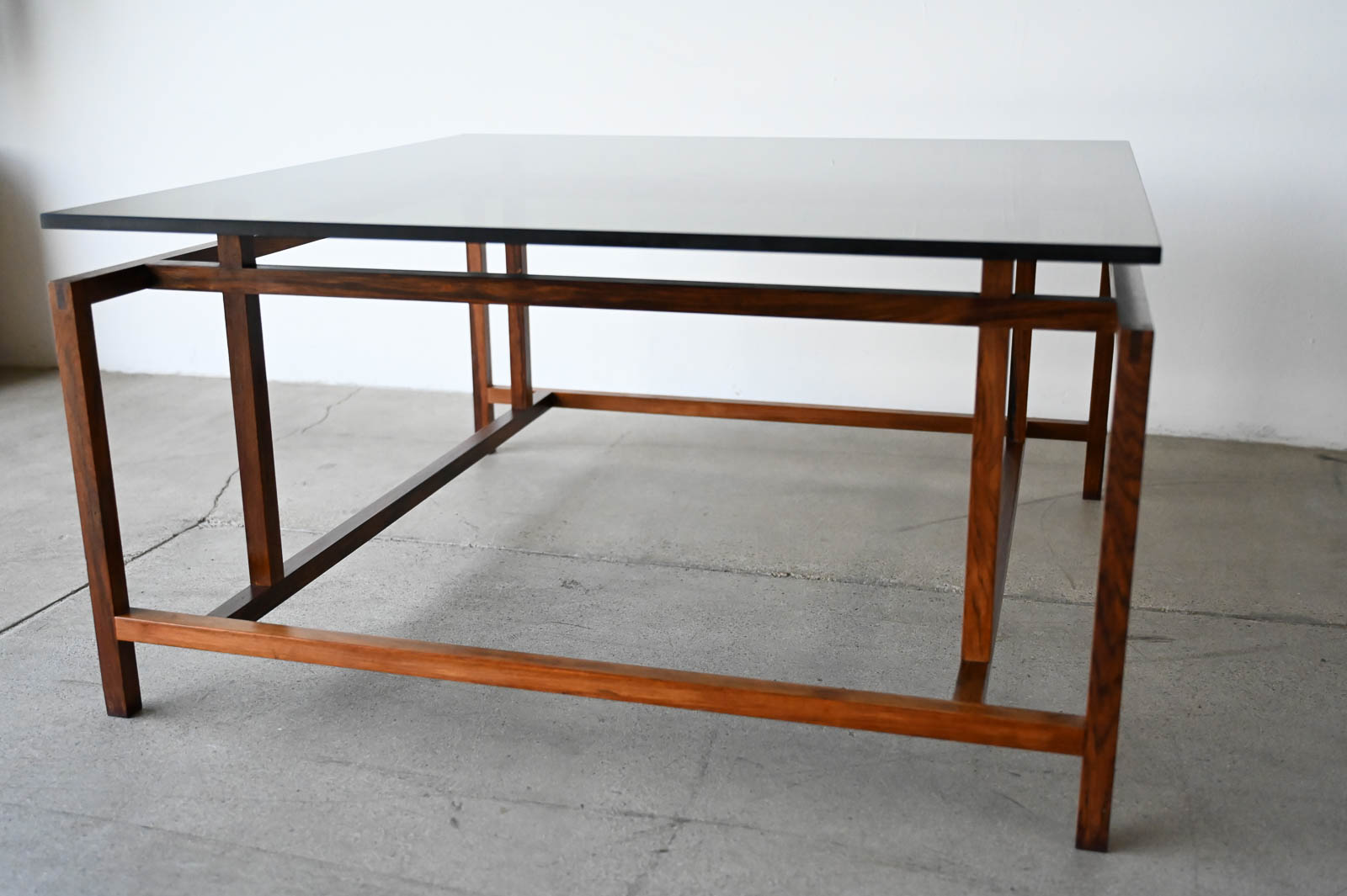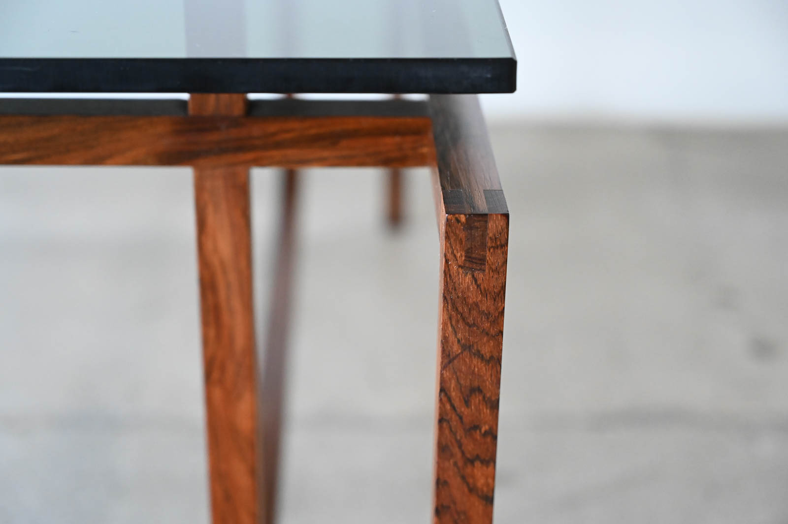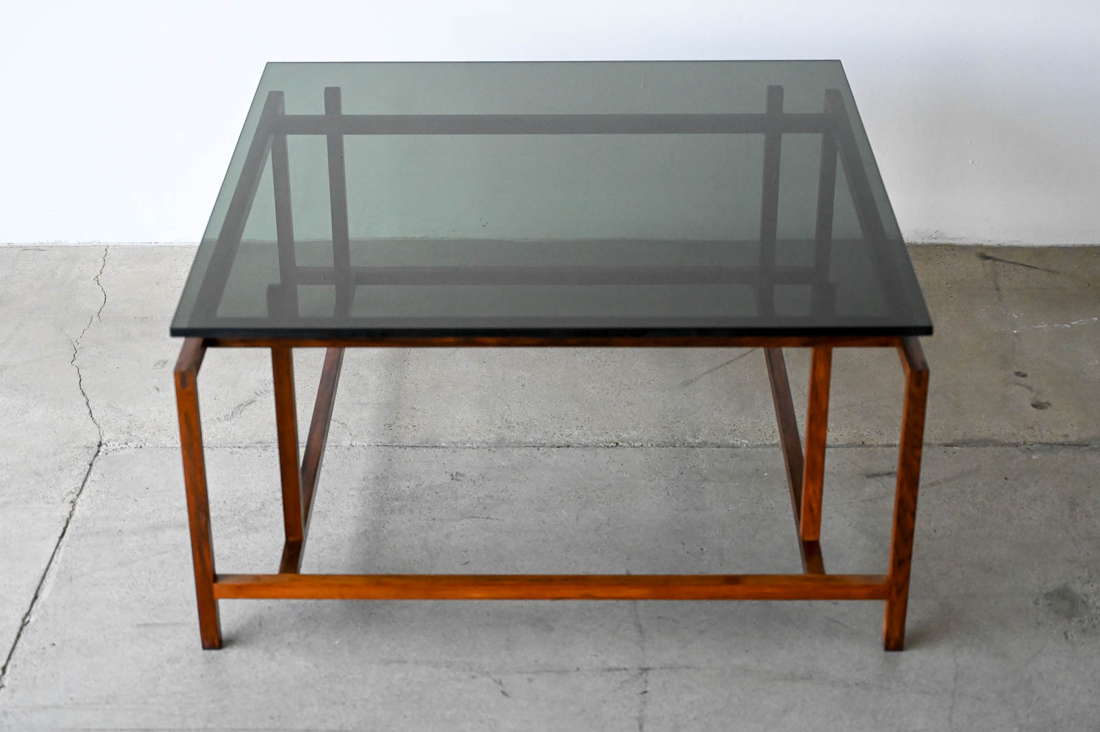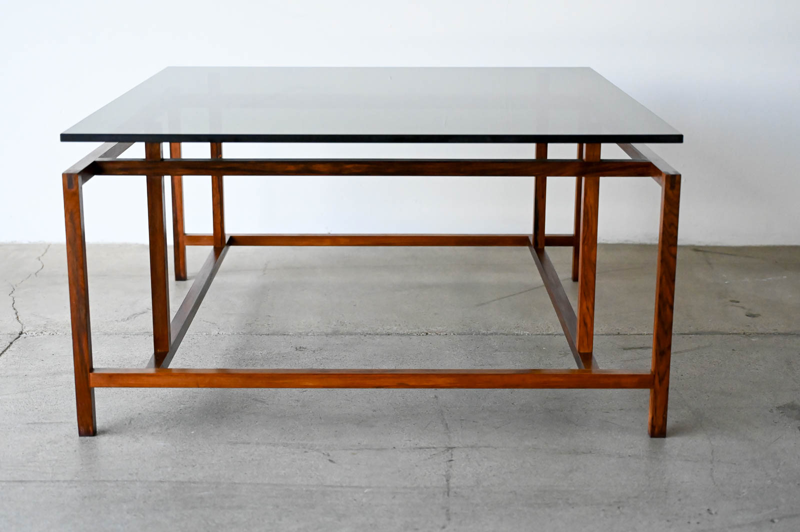Henning Norgaard for Komfort Rosewood and Smoked Glass Coffee Table, ca. 1960. Beautiful delicate rosewood frame with original smoked glass top that floats effortlessly on the notched frame. Piece is in very good original condition with only slight wear. Measures 31.5″ Square x 16.5″ H