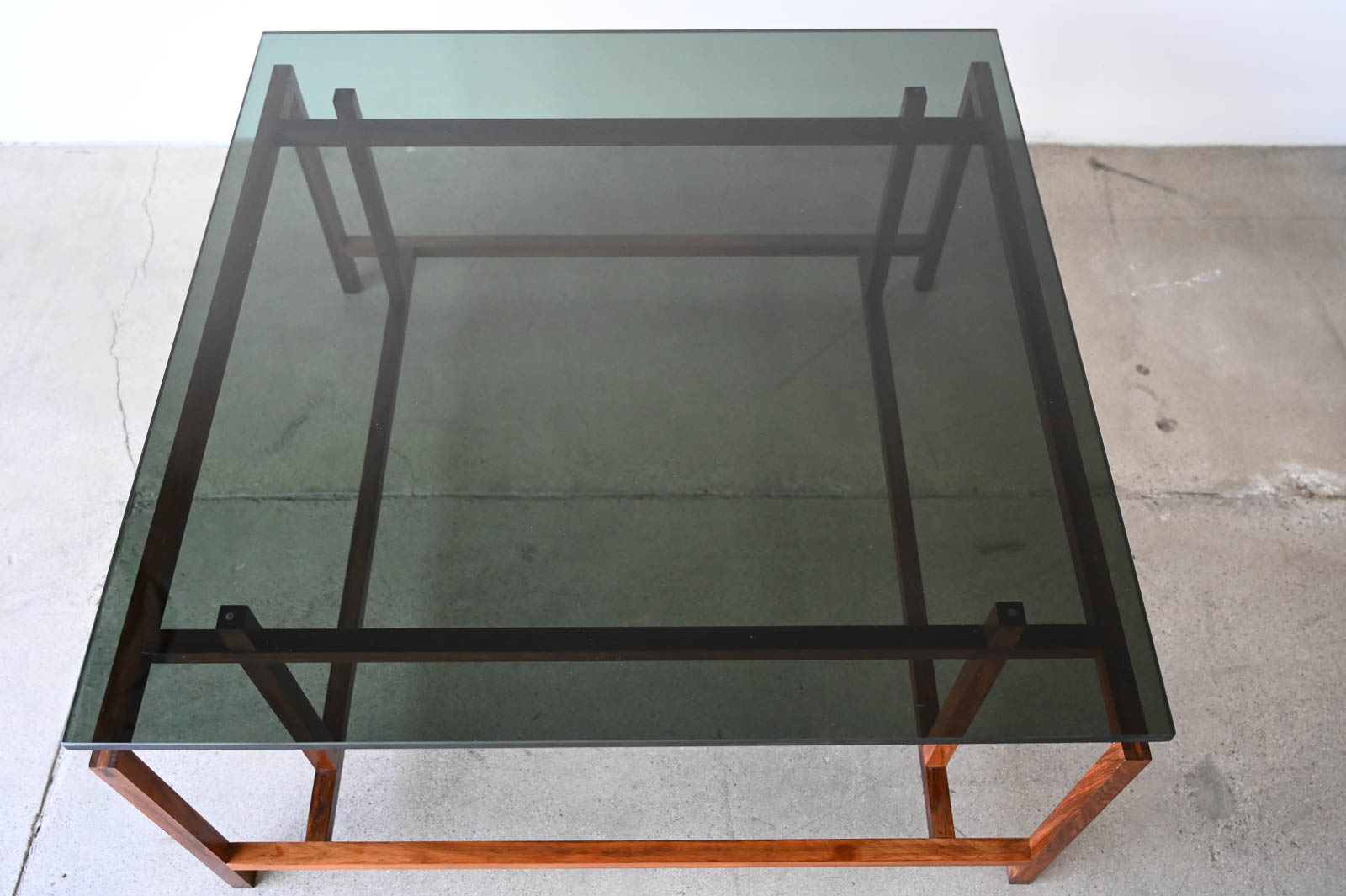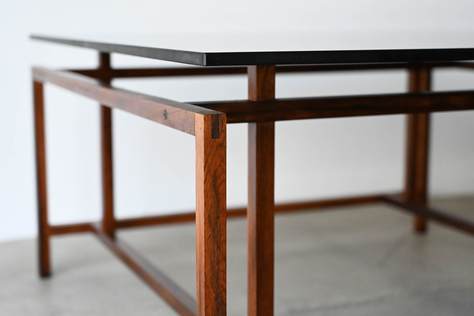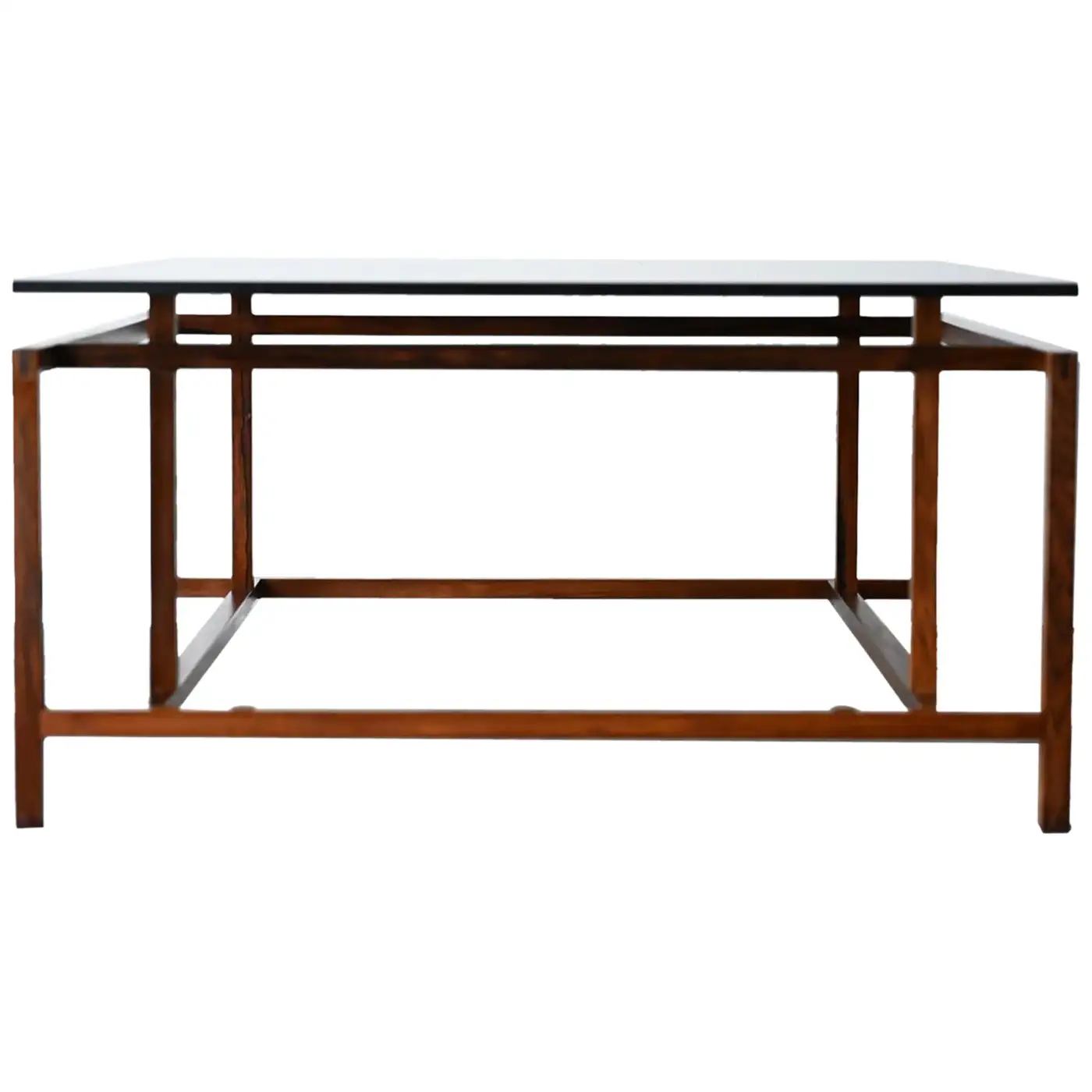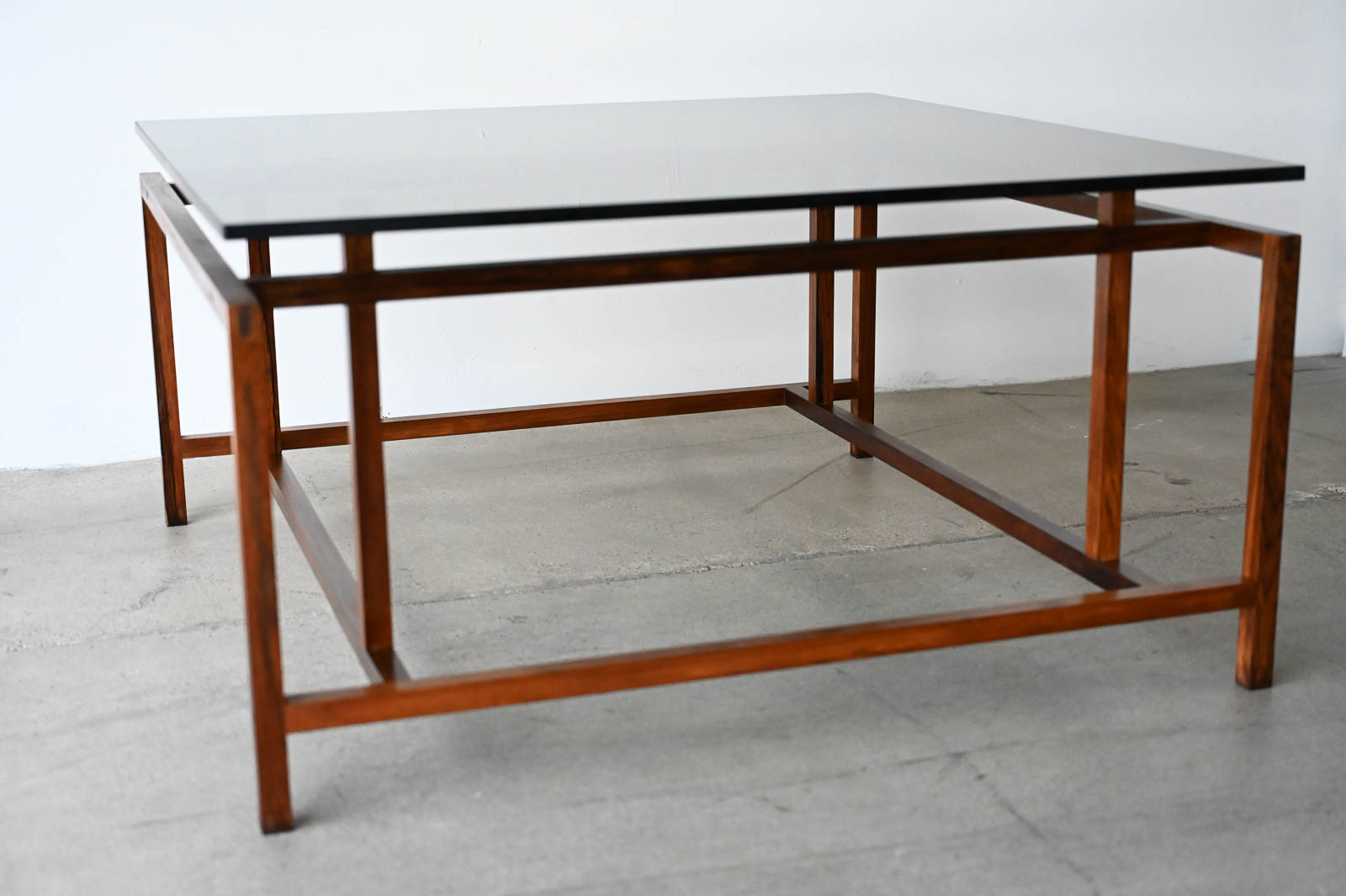 Henning Norgaard for Komfort Rosewood and Smoked Glass Coffee Table, ca. 1960. Beautiful delicate rosewood frame with original smoked glass top that floats effortlessly on the notched frame. Piece is in very good original condition with only slight wear. Measures 31.5″ Square x 16.5″ H