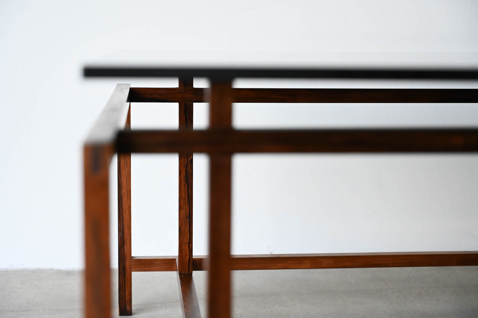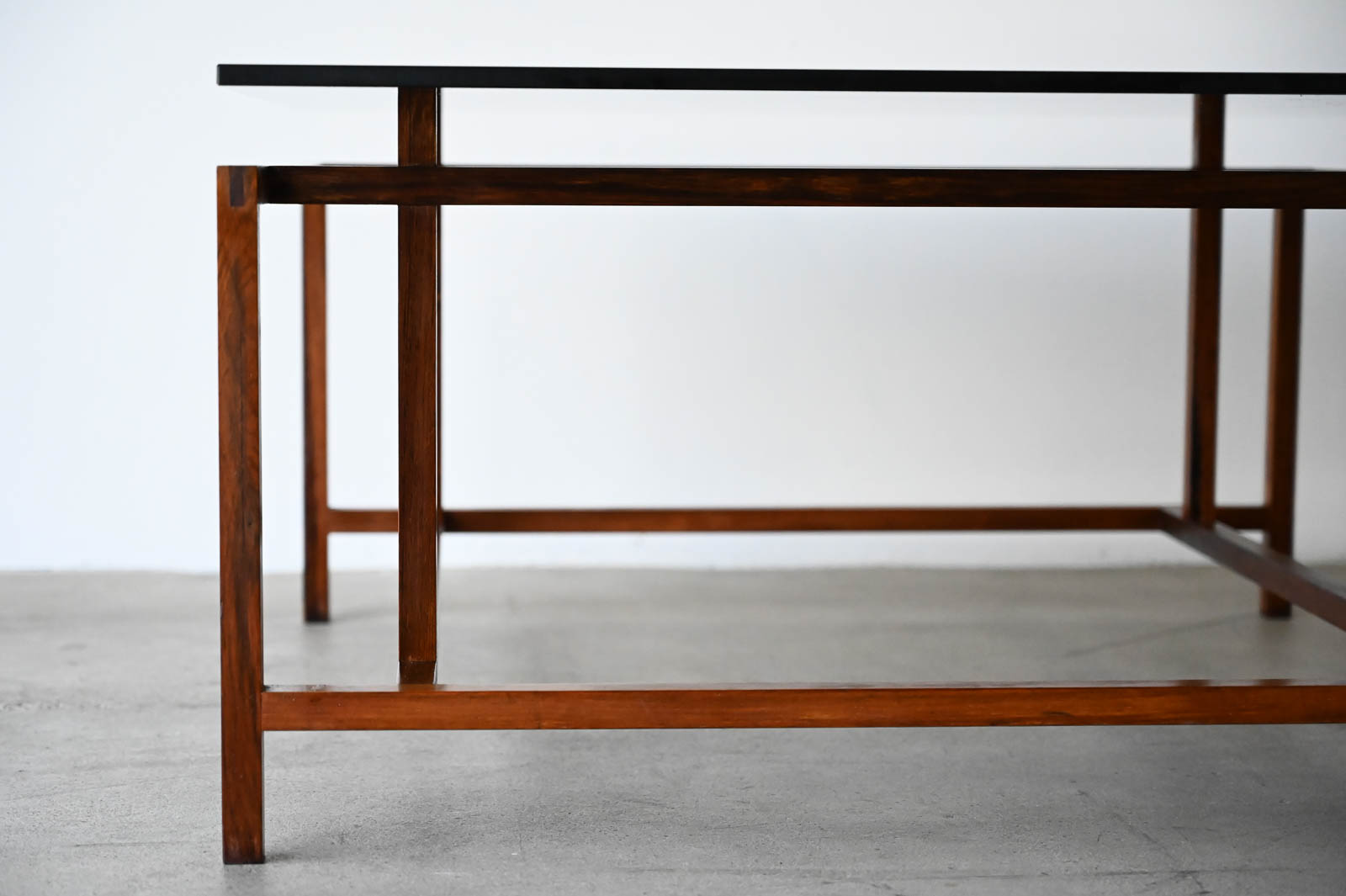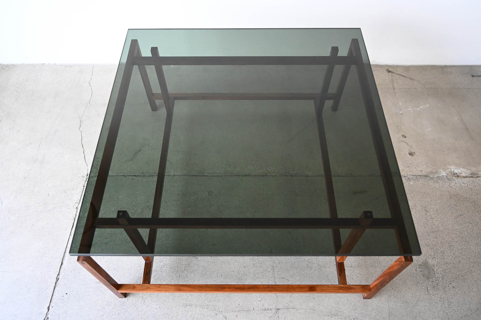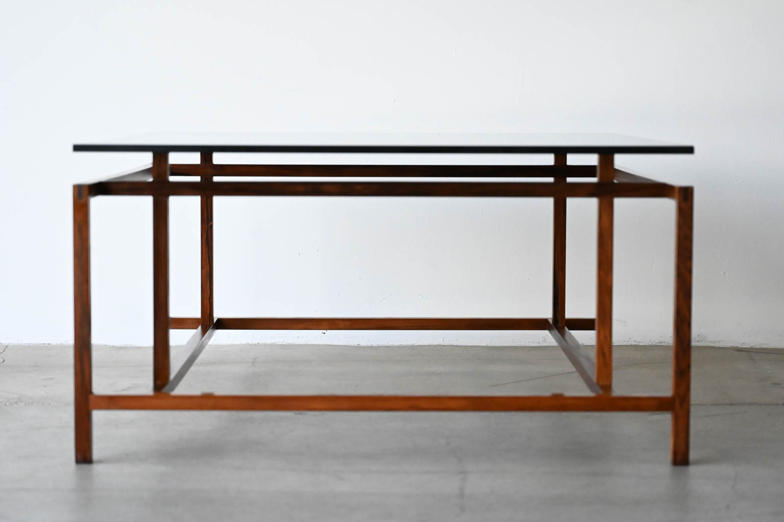 Henning Norgaard for Komfort Rosewood and Smoked Glass Coffee Table, ca. 1960. Beautiful delicate rosewood frame with original smoked glass top that floats effortlessly on the notched frame. Piece is in very good original condition with only slight wear. Measures 31.5″ Square x 16.5″ H