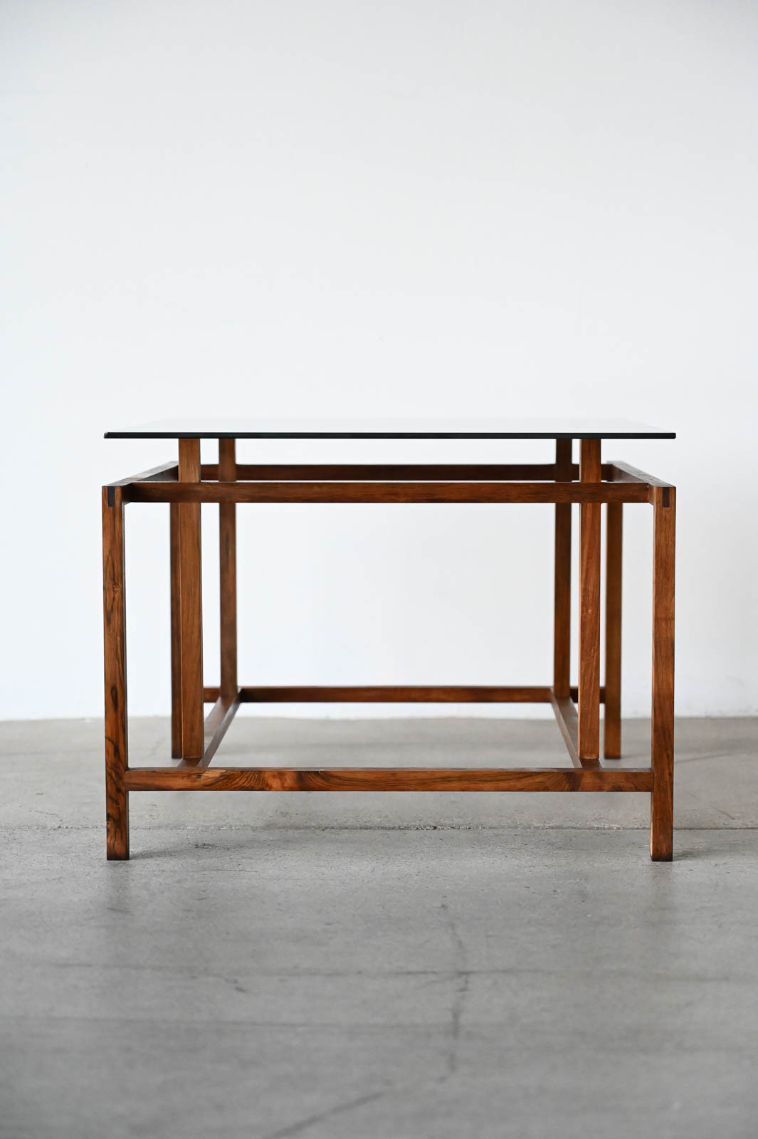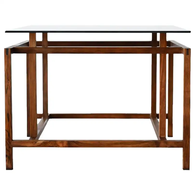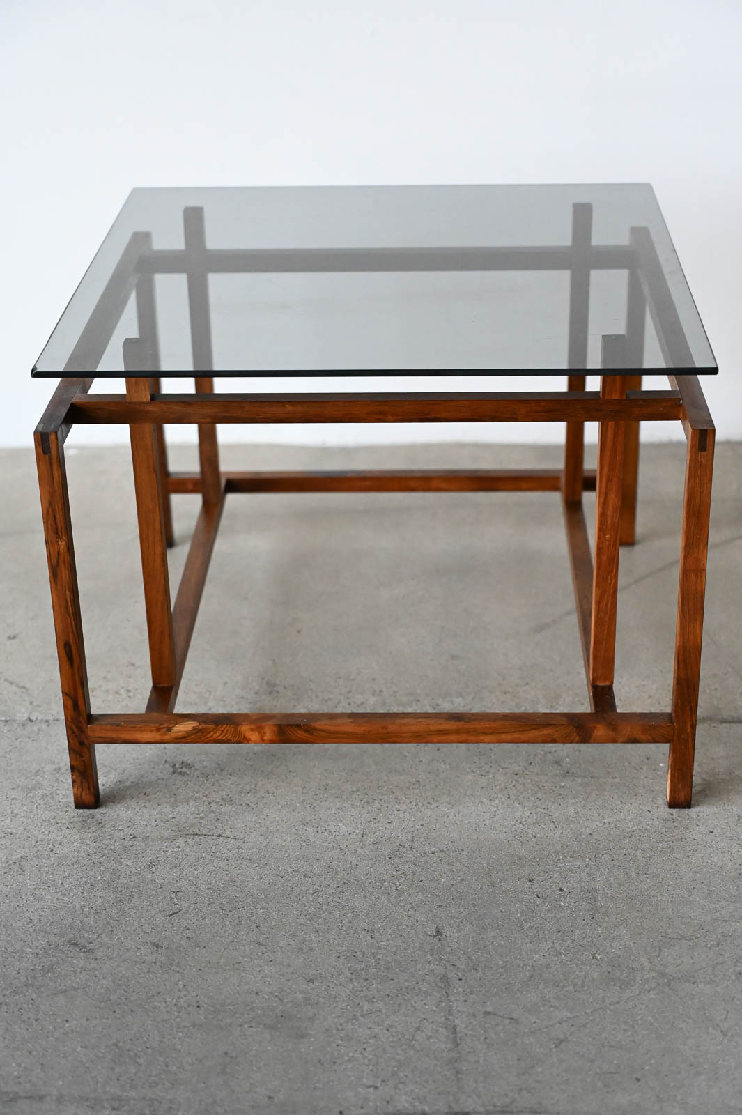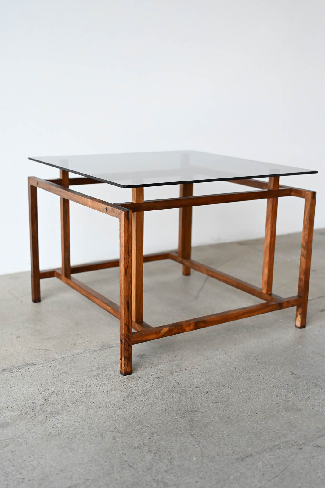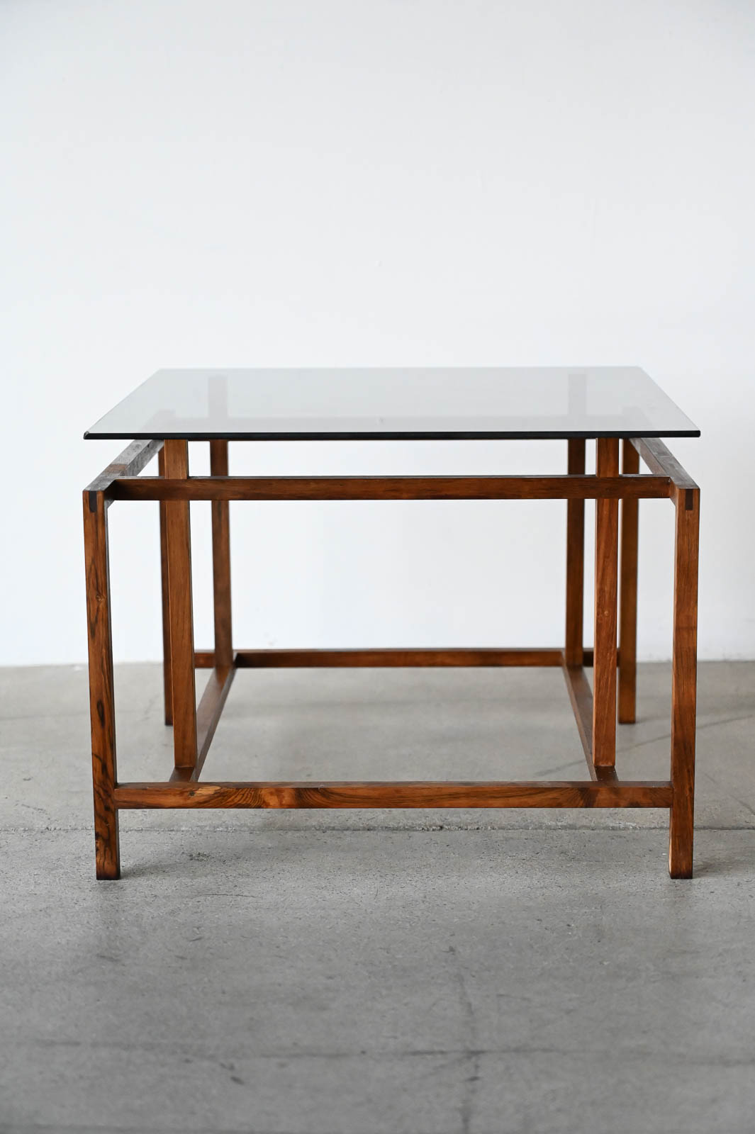 Henning Norgaard for Komfort Rosewood and Smoked Glass Side Table, ca. 1960. Small rosewood and smoked glass square side table with floating glass top on a delicate rosewood base. Measures 19.5″ x 19.5″ x 15″ H