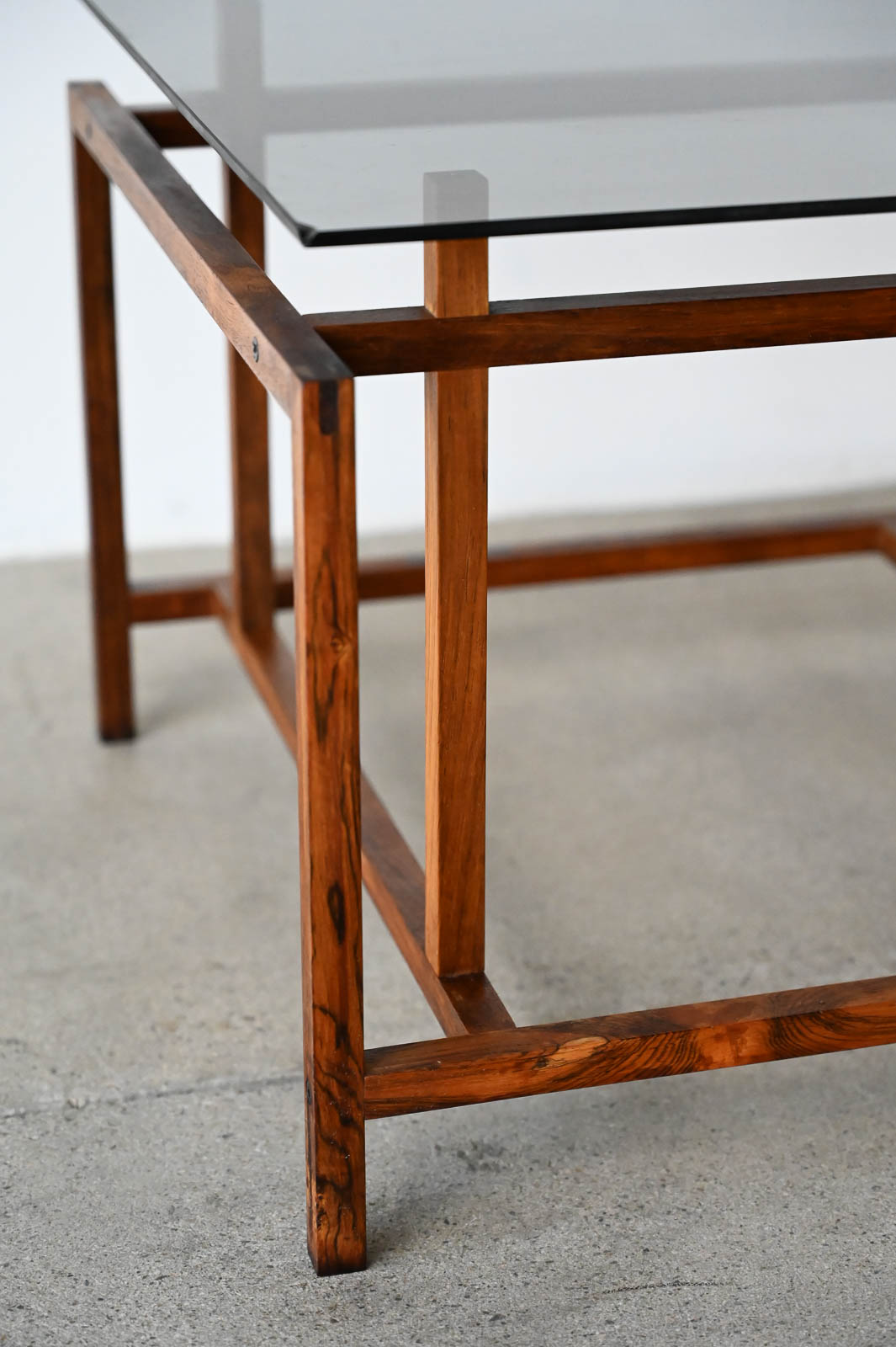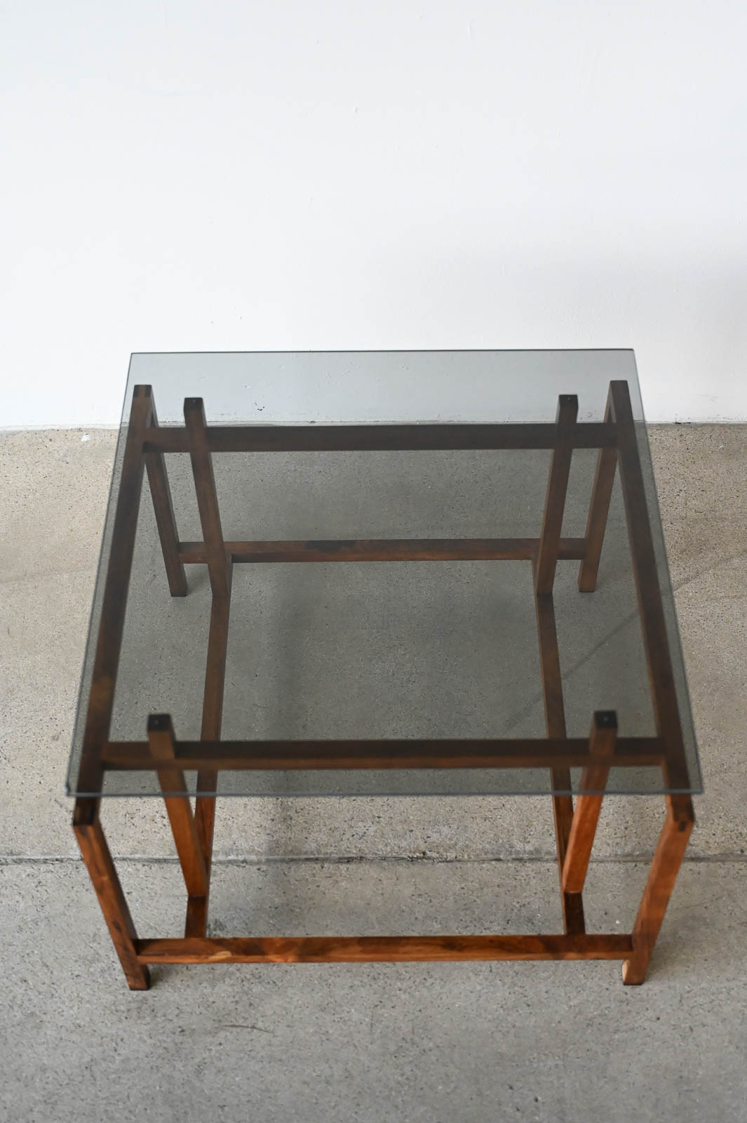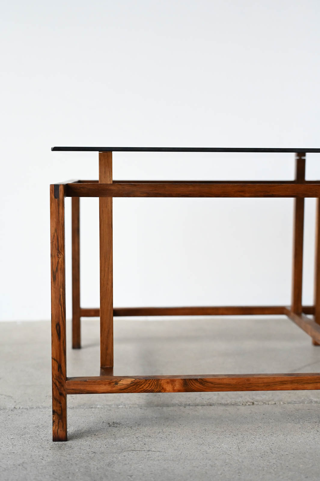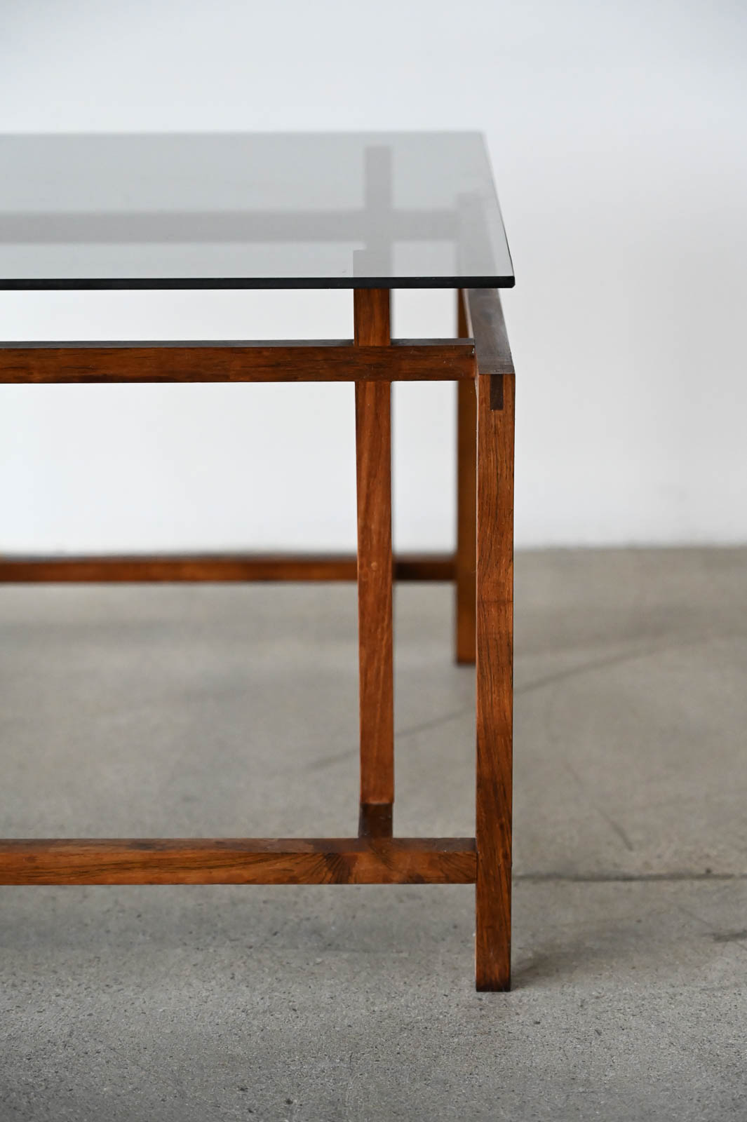 Henning Norgaard for Komfort Rosewood and Smoked Glass Side Table, ca. 1960. Small rosewood and smoked glass square side table with floating glass top on a delicate rosewood base. Measures 19.5″ x 19.5″ x 15″ H