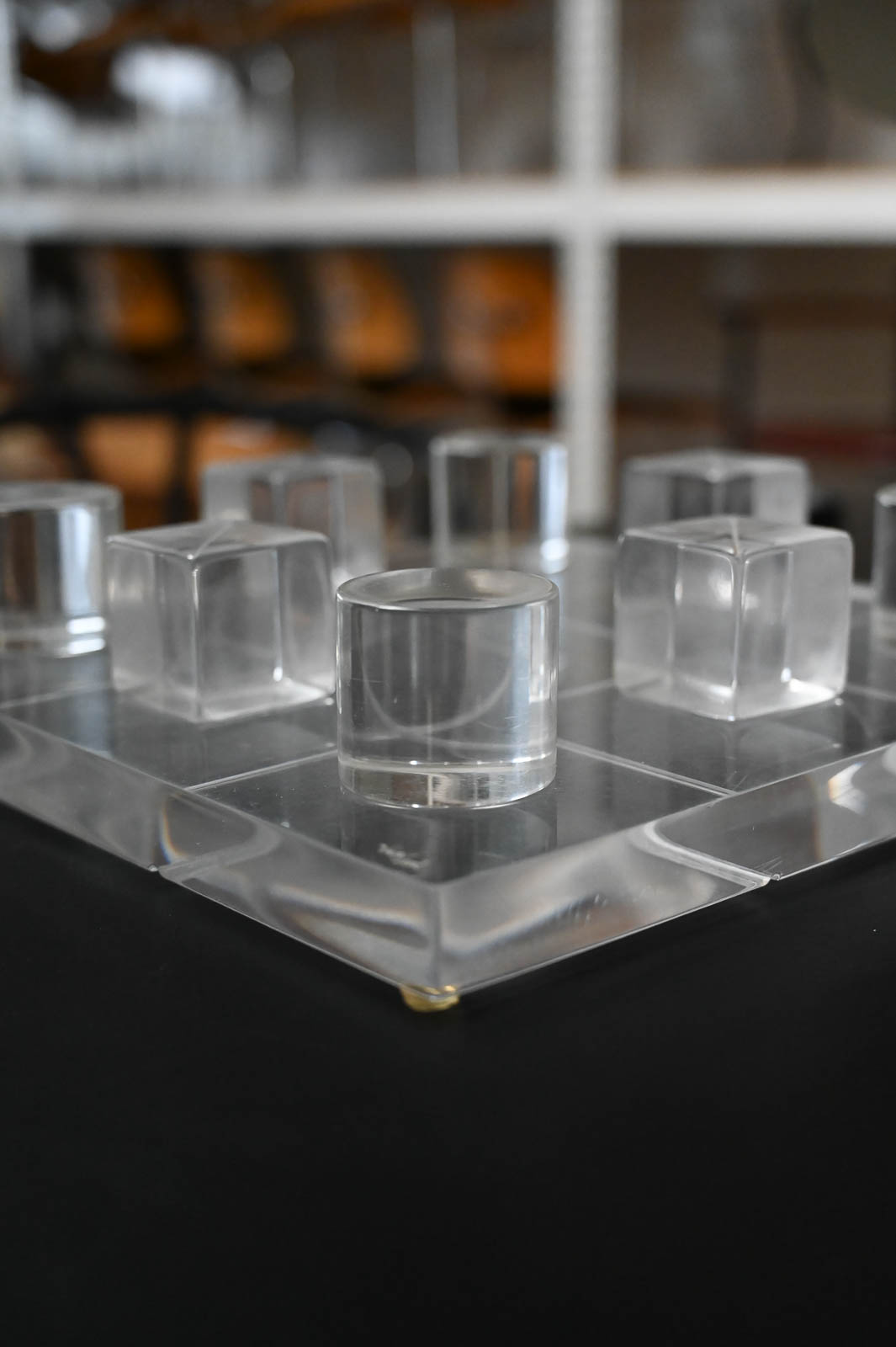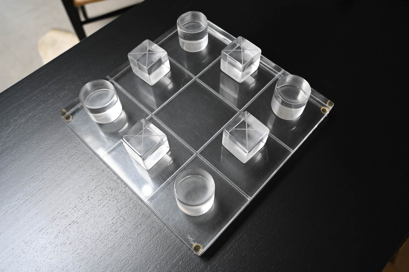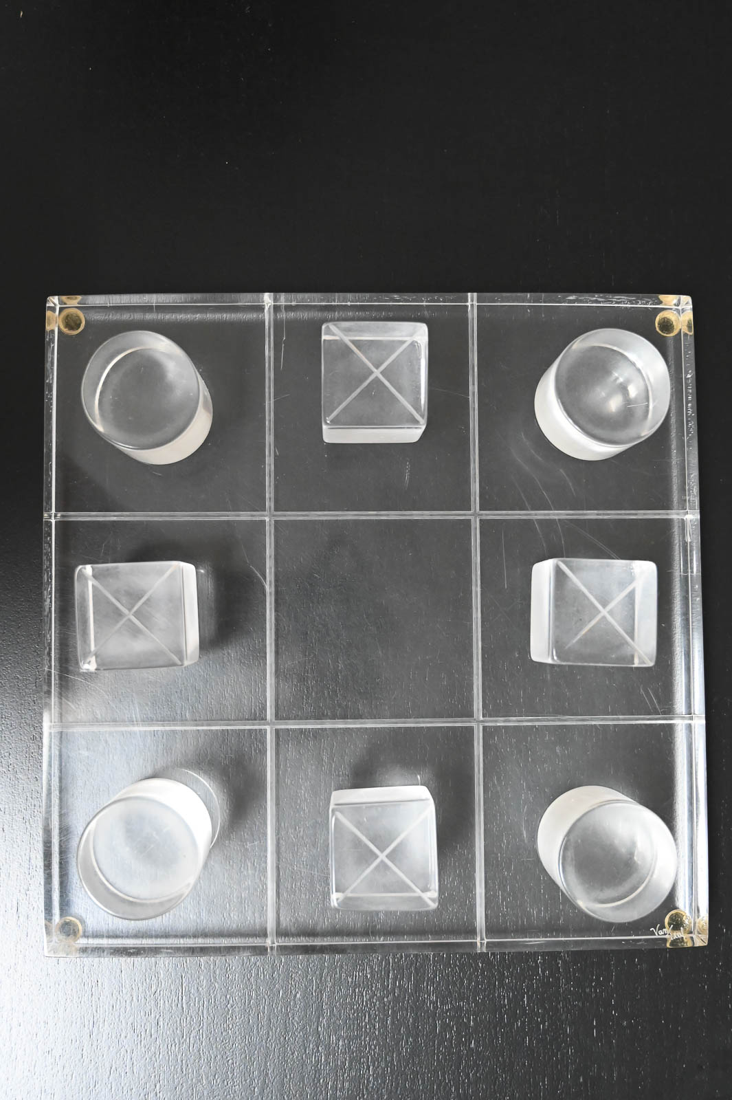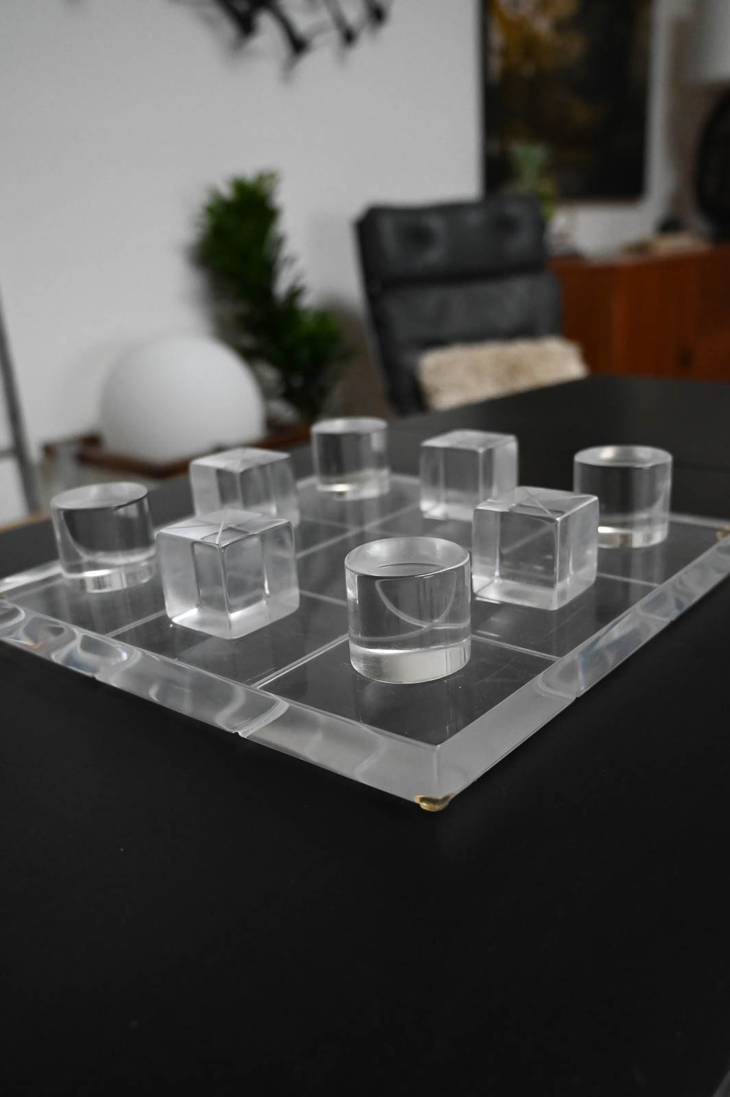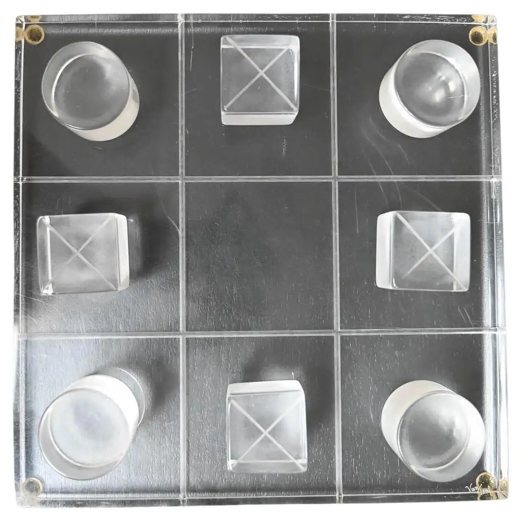 Hivo Van Teal Lucite Tic Tac Toe Set, ca. 1970. Unique lucite set signed by the artist. Fun, whimsical conversation piece for your coffee table or game room. Signed by the artist Hivo Van Teal. Measures 12″x12″ Cubes are 2″x2″x2″.