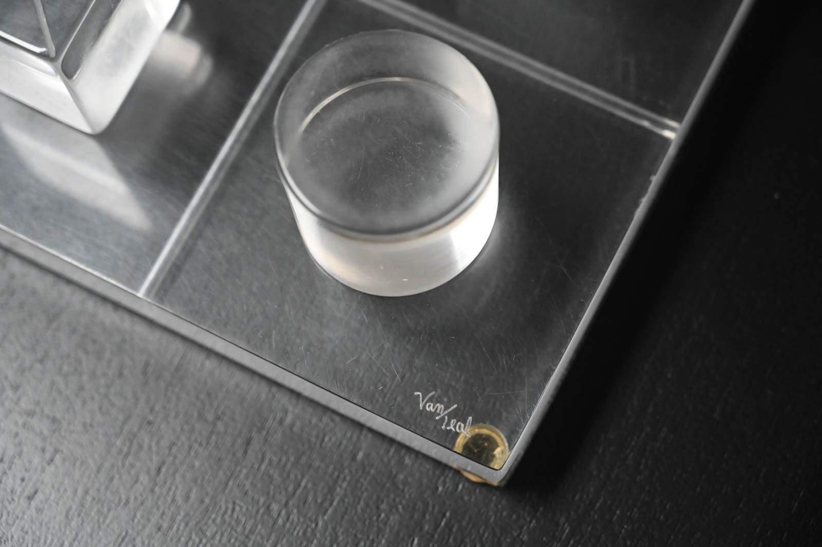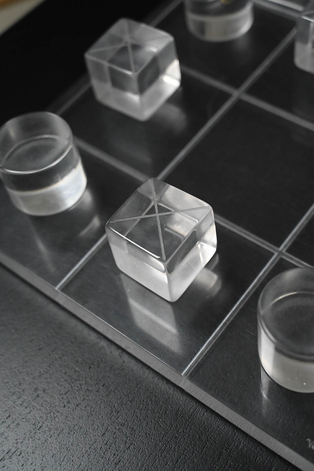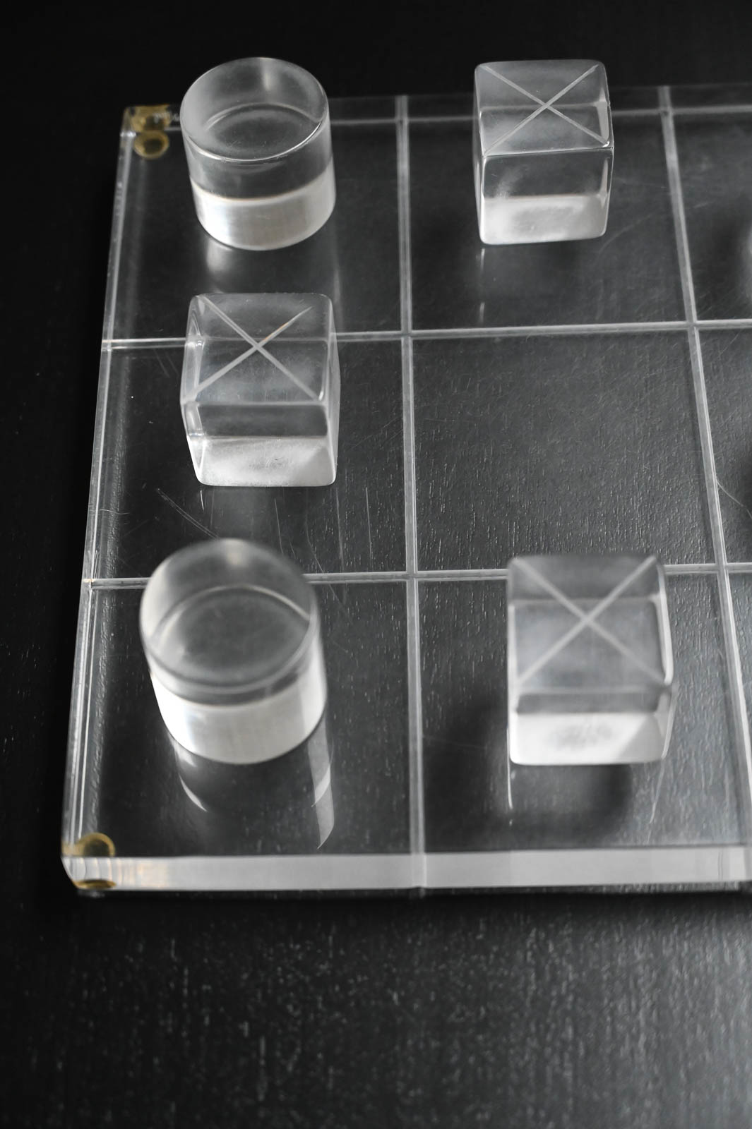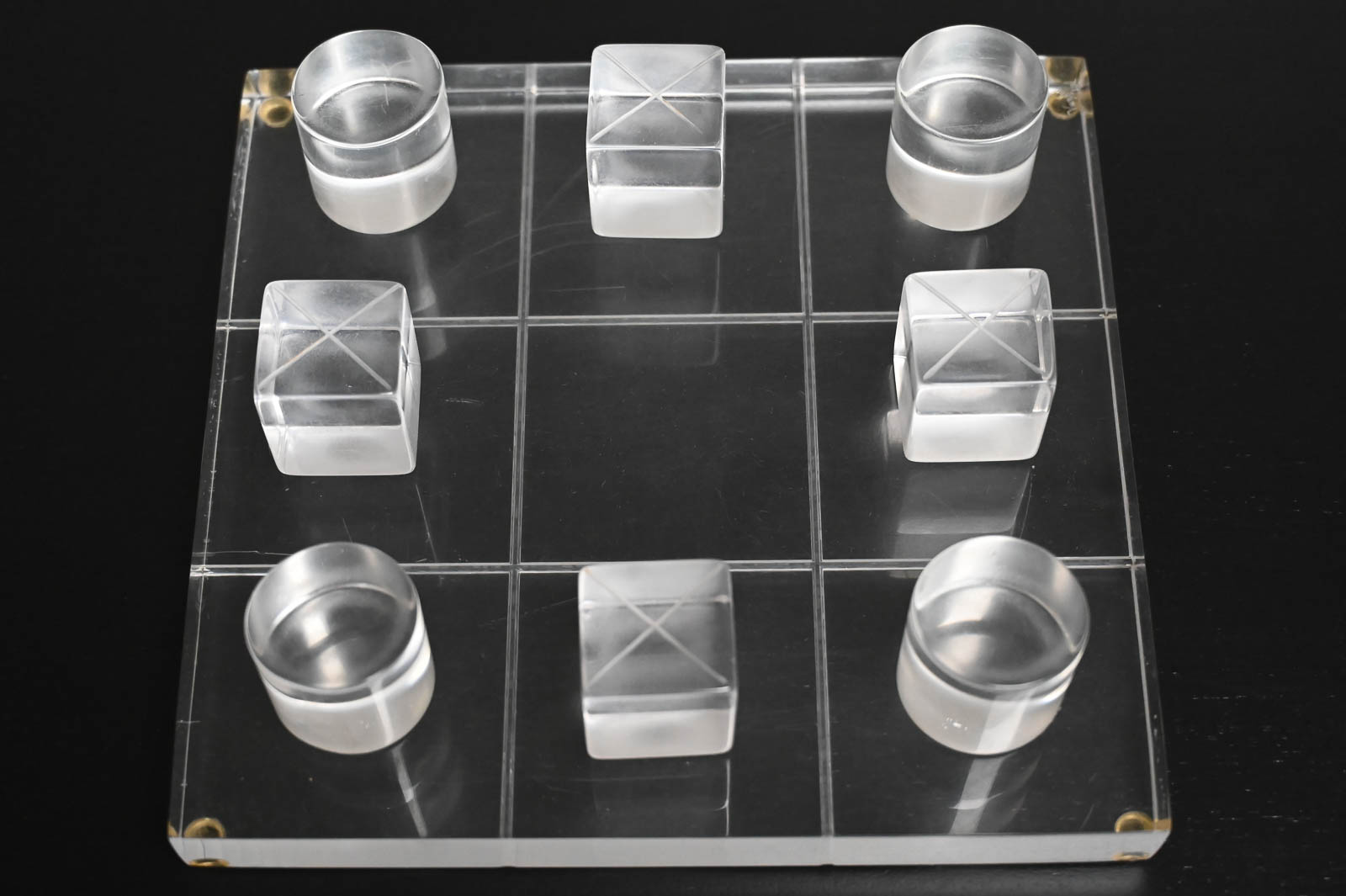 Hivo Van Teal Lucite Tic Tac Toe Set, ca. 1970. Unique lucite set signed by the artist. Fun, whimsical conversation piece for your coffee table or game room. Signed by the artist Hivo Van Teal. Measures 12″x12″ Cubes are 2″x2″x2″.