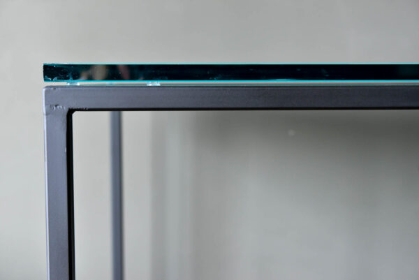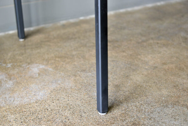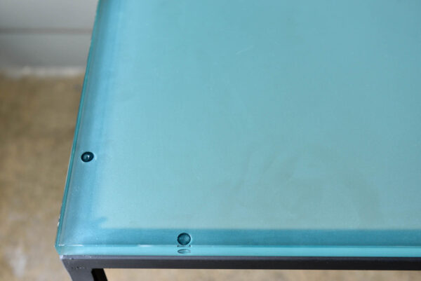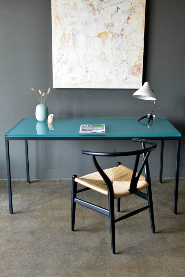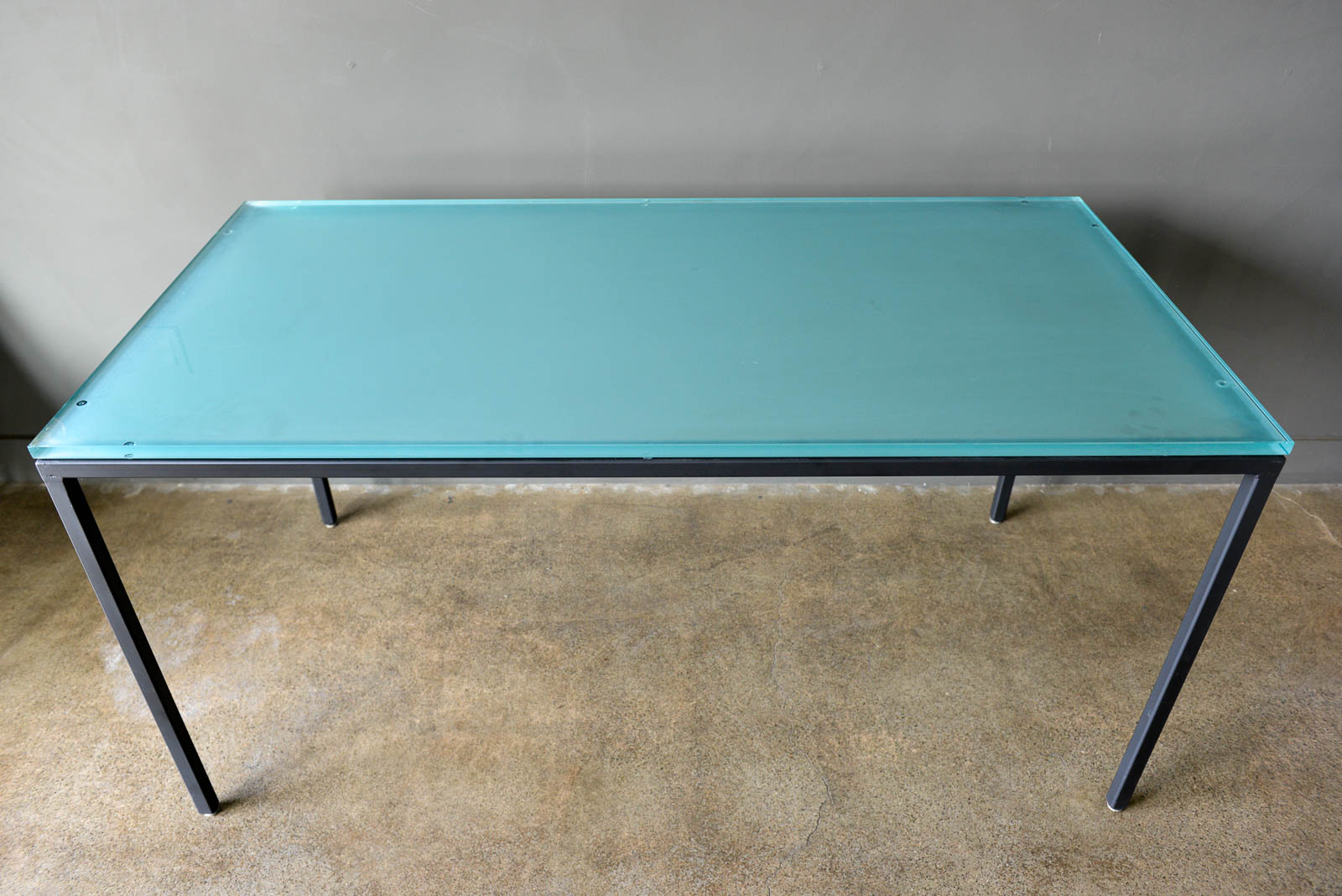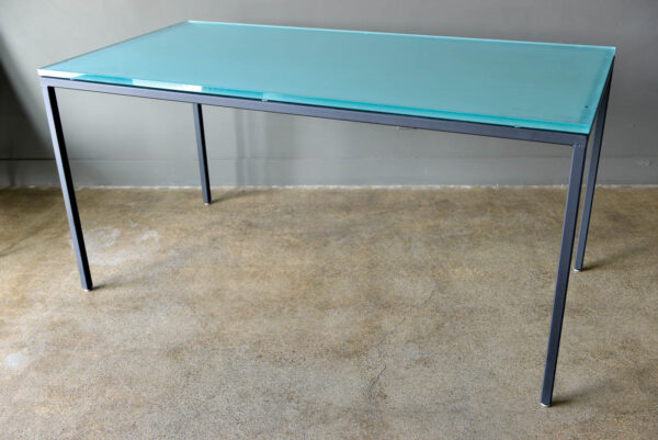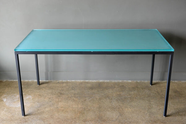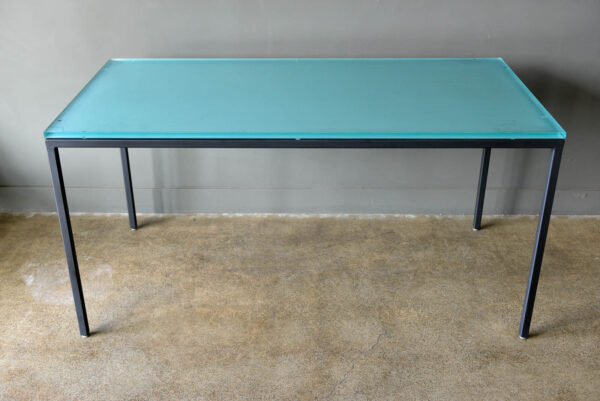 Iron table with original opaque glass by Darrell Landrum for Avard NYC, 1950. Table has been professionally restored with new matte black powder coat and original frosted glass in very good condition. Original domes of silence floor protectors. Exceptionally rare table, hardly seen or offered for sale. Could be used indoors or outdoors. Table has original green opaque frosted glass in excellent condition with no edge chips, only slight wear to glass top which floats on top of frame. Table measures 56″ L x 28″ W x 28″ H.