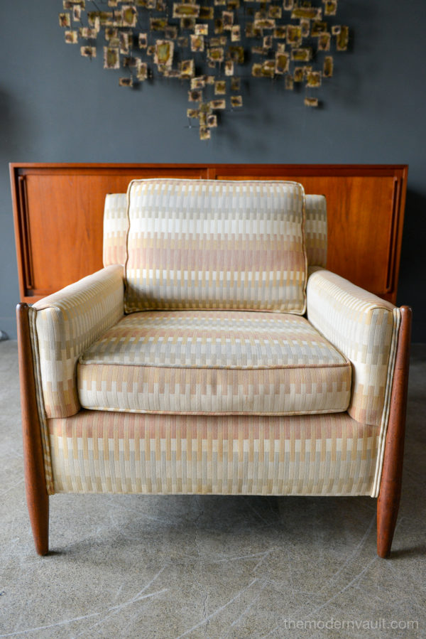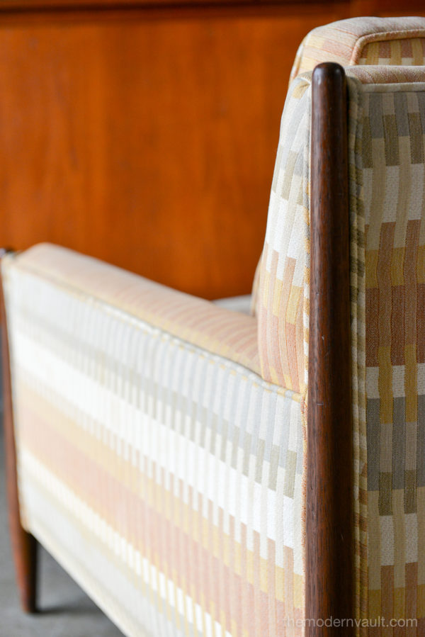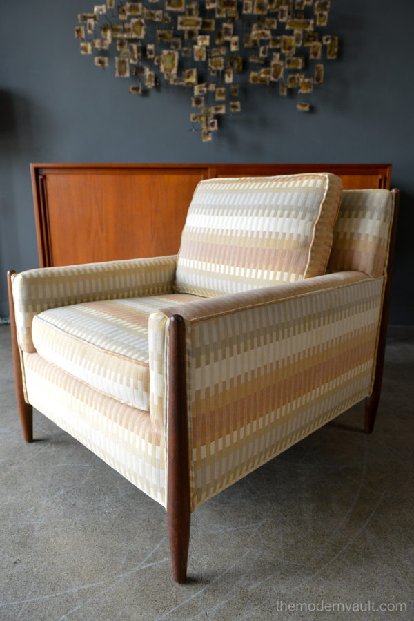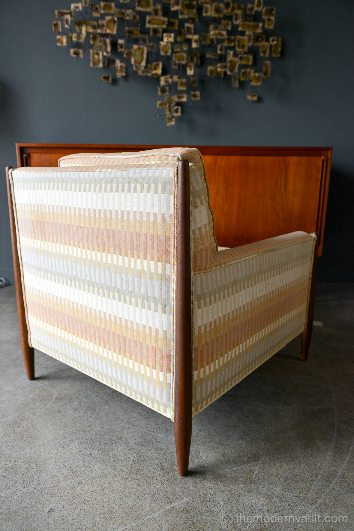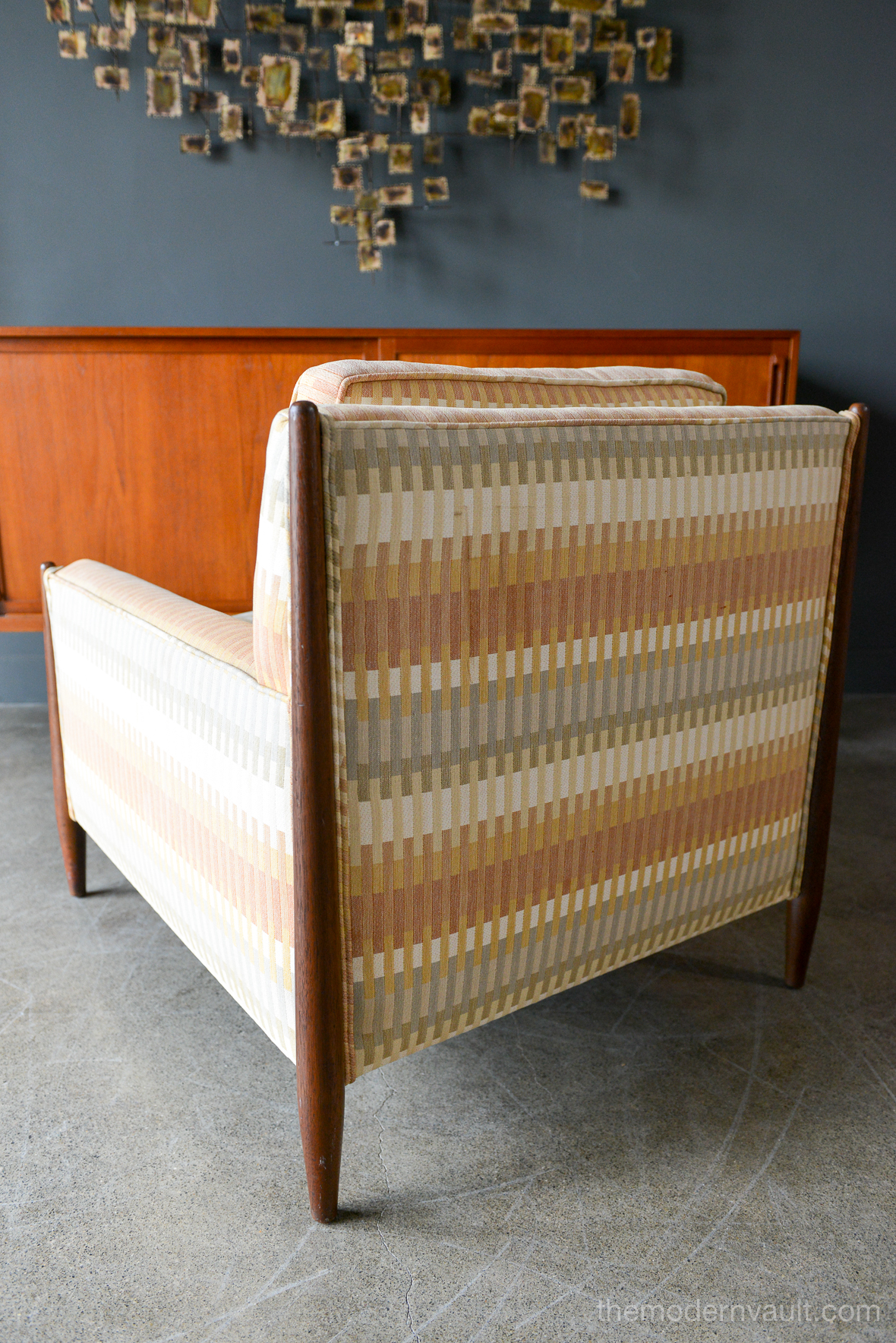 Jules Heumann for Metropolitan Furniture lounge chair, circa 1965. Sculpted walnut legs and frame with vintage fabric in excellent (near new) vintage condition. Beautiful lines, reminiscent of Paul McCobb or Harvey Probber designs with quality construction and timeless design. This chair is extremely comfortable with new seat foam and matching lumbar pillow. Measures 29″ W x 32″ D x 29″ back height x 16.5″ seat height.