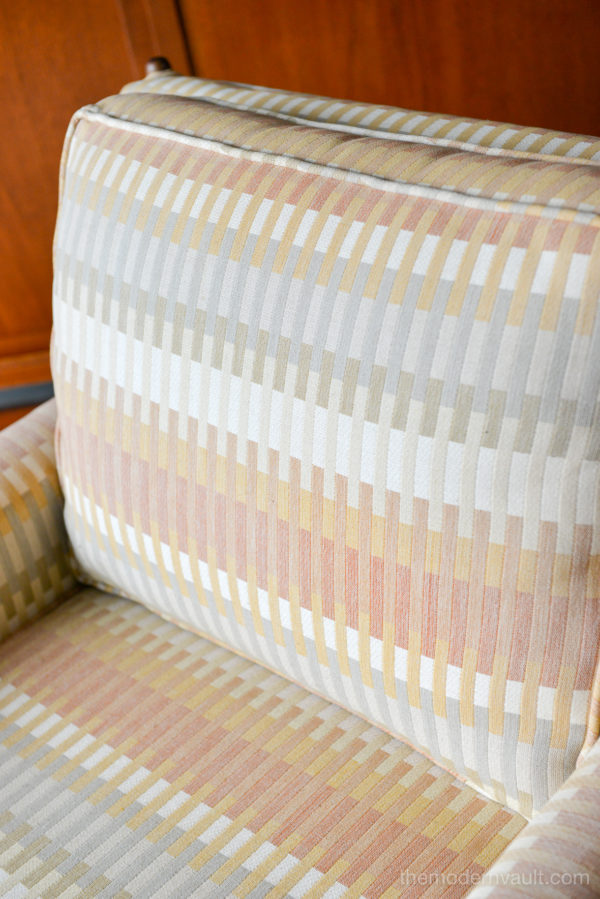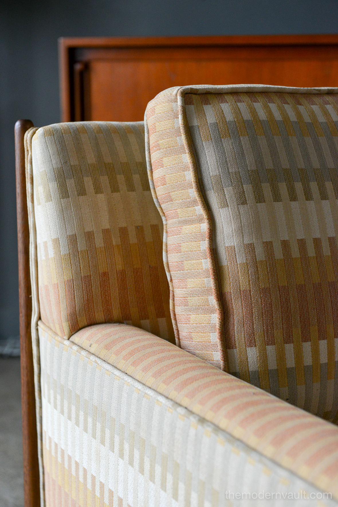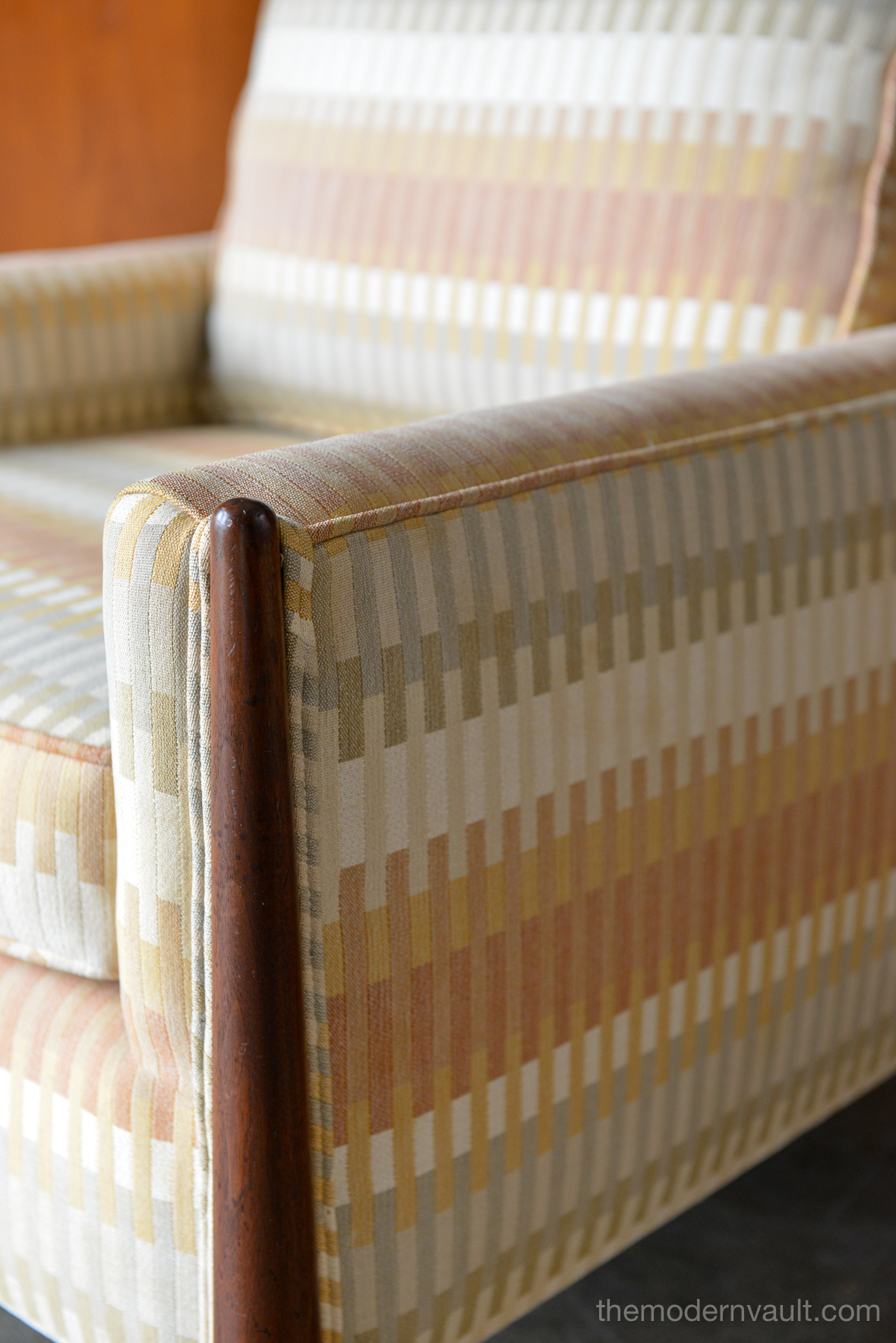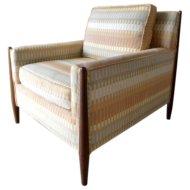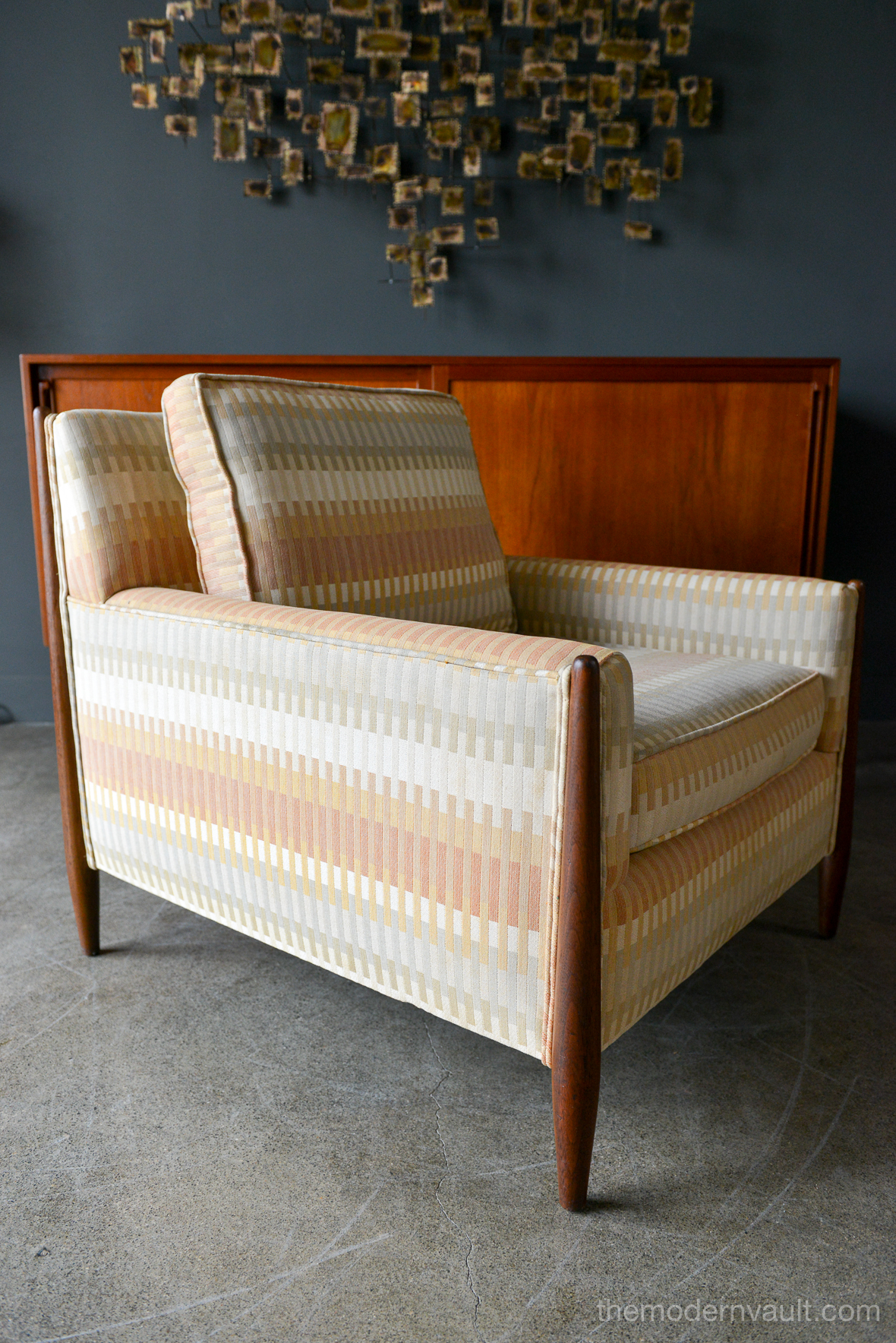 Jules Heumann for Metropolitan Furniture lounge chair, circa 1965. Sculpted walnut legs and frame with vintage fabric in excellent (near new) vintage condition. Beautiful lines, reminiscent of Paul McCobb or Harvey Probber designs with quality construction and timeless design. This chair is extremely comfortable with new seat foam and matching lumbar pillow. Measures 29″ W x 32″ D x 29″ back height x 16.5″ seat height.