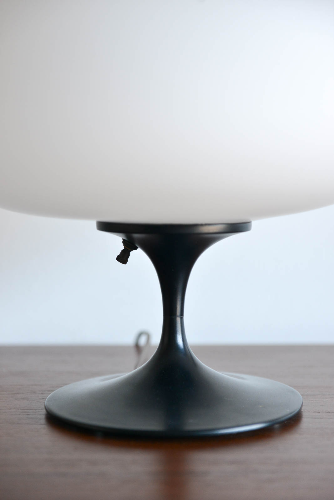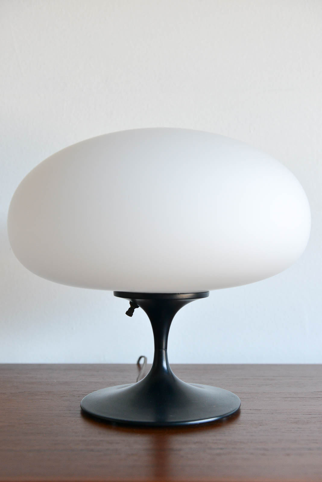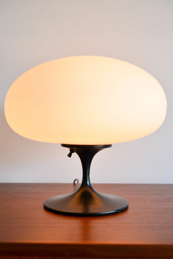 Laurel Mushroom table lamp, circa 1965. Original black base with opaque glass mushroom shade. Measures: 12″ height x 13″ diameter.