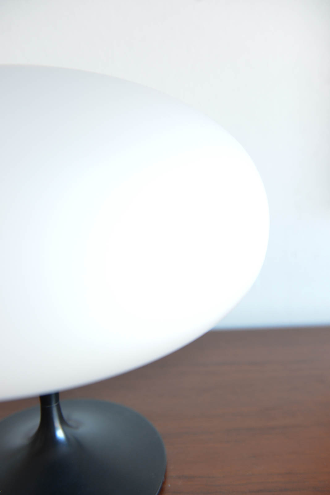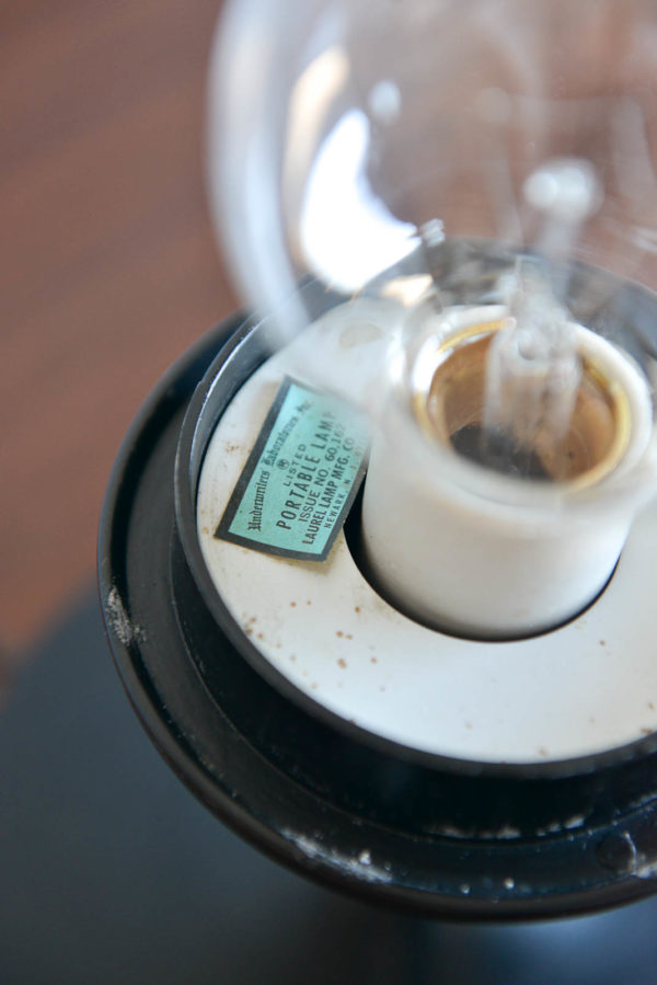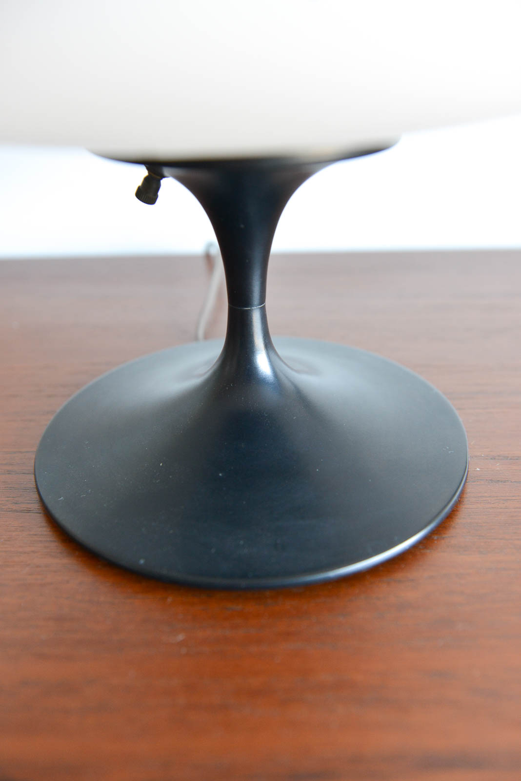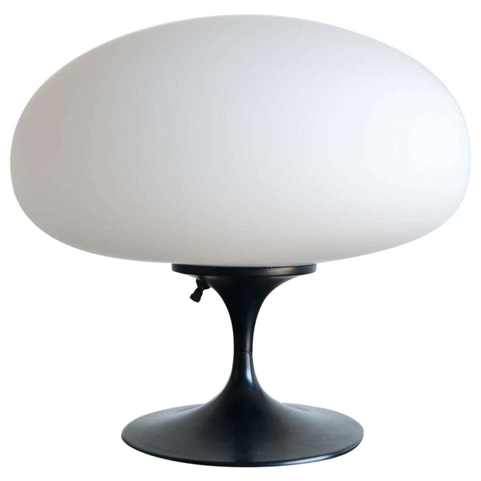 Laurel Mushroom table lamp, circa 1965. Original black base with opaque glass mushroom shade. Measures: 12″ height x 13″ diameter.