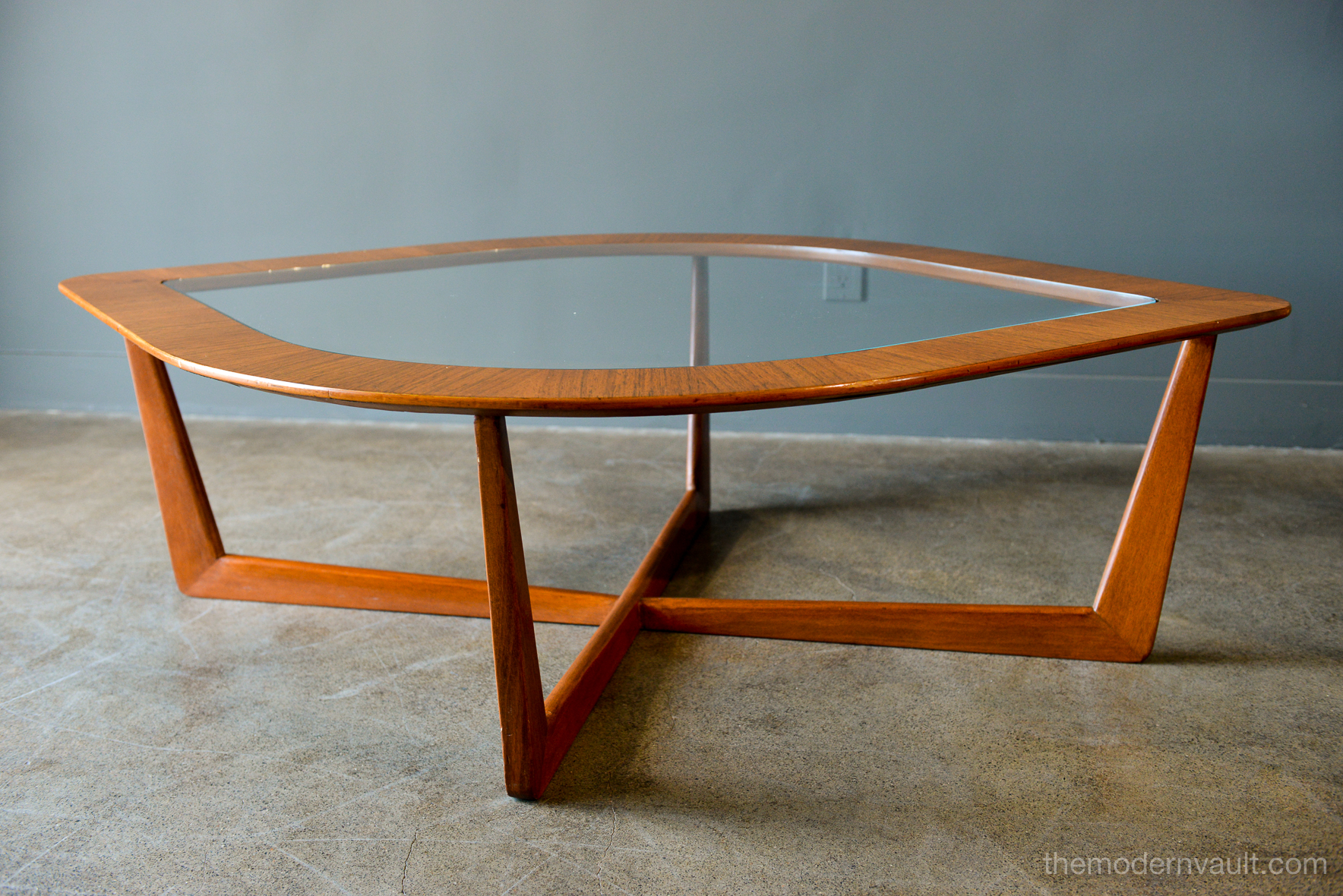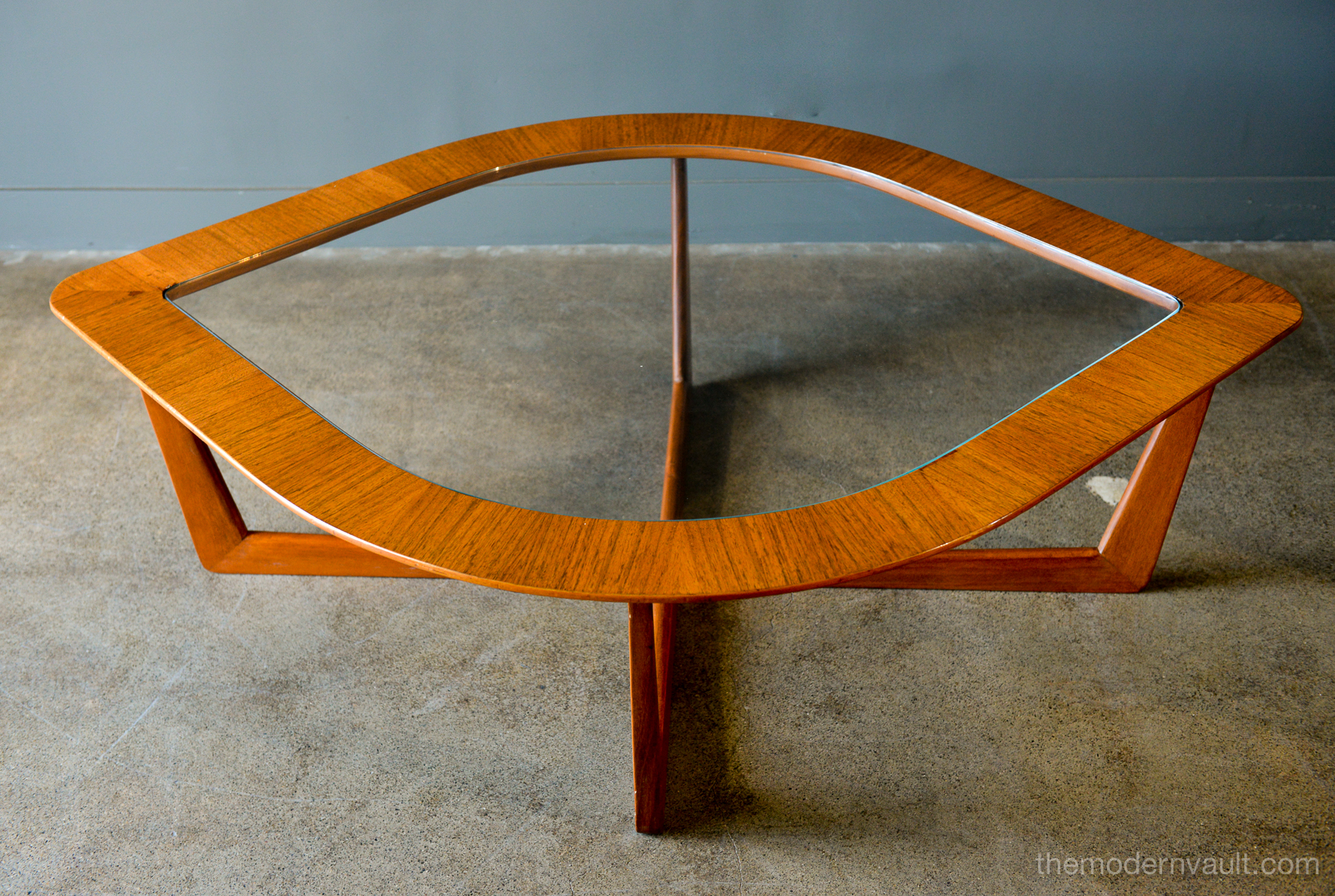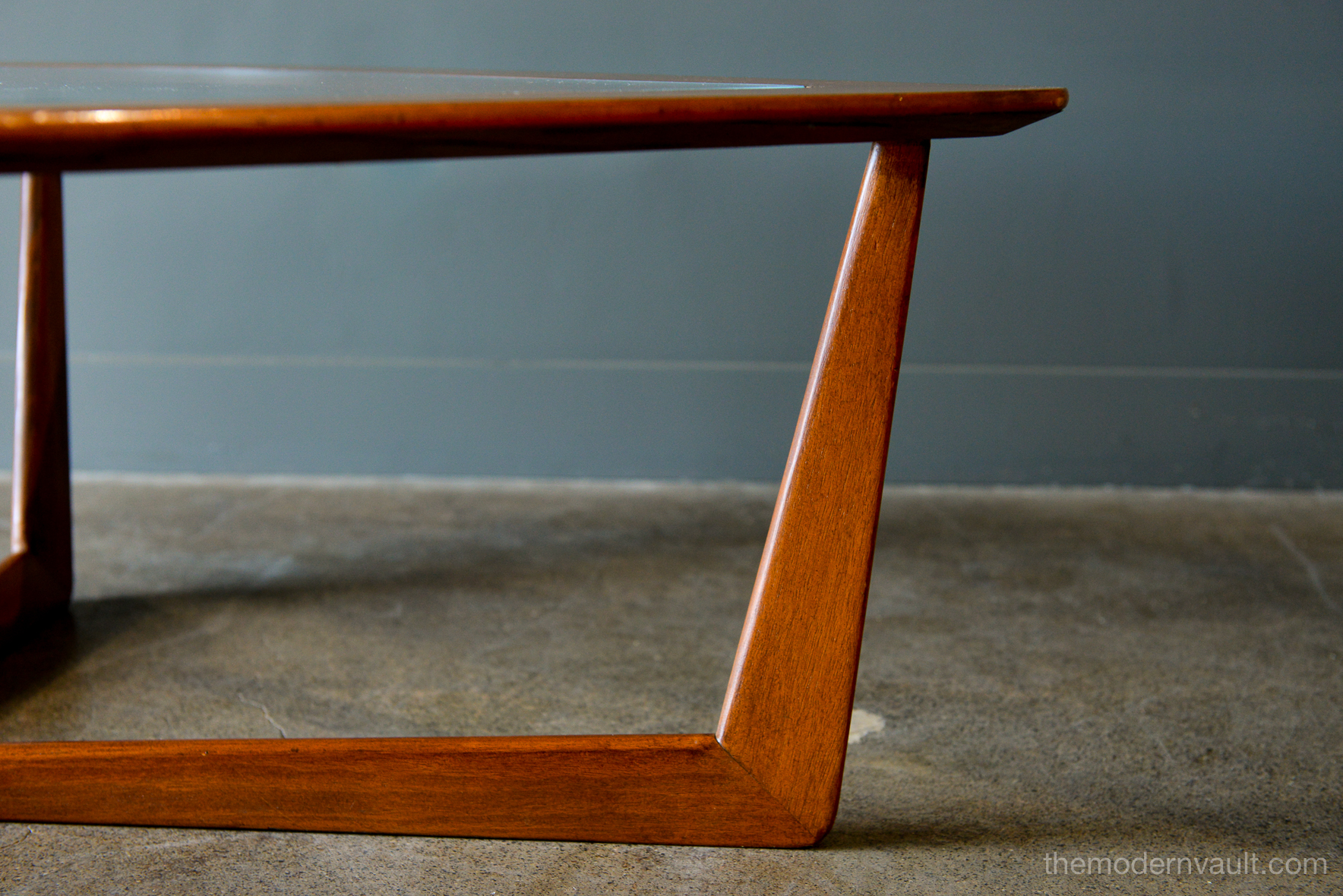 Mahogany and glass coffee table by Erno Fabry, circa 1955. Rare eyeball shape with mahogany top and sculpted mahogany legs and glass inlay. Glass is in very good condition with only slight wear. Mahogany has some minor wear, as shown otherwise very good. Rare shape, this piece has been identified in “Furniture for modern interiors” de Mario Dal Fabbro, edition Reinhold, New york, page 195