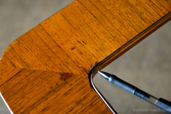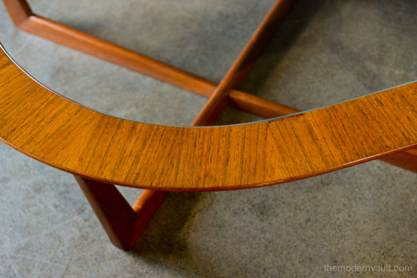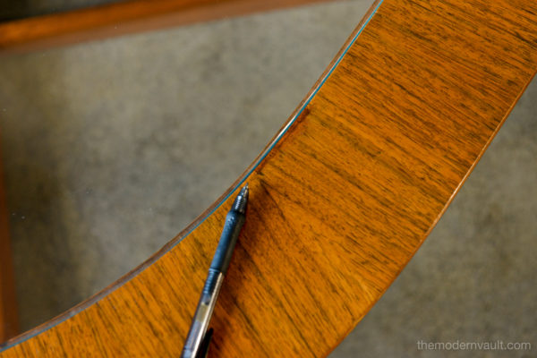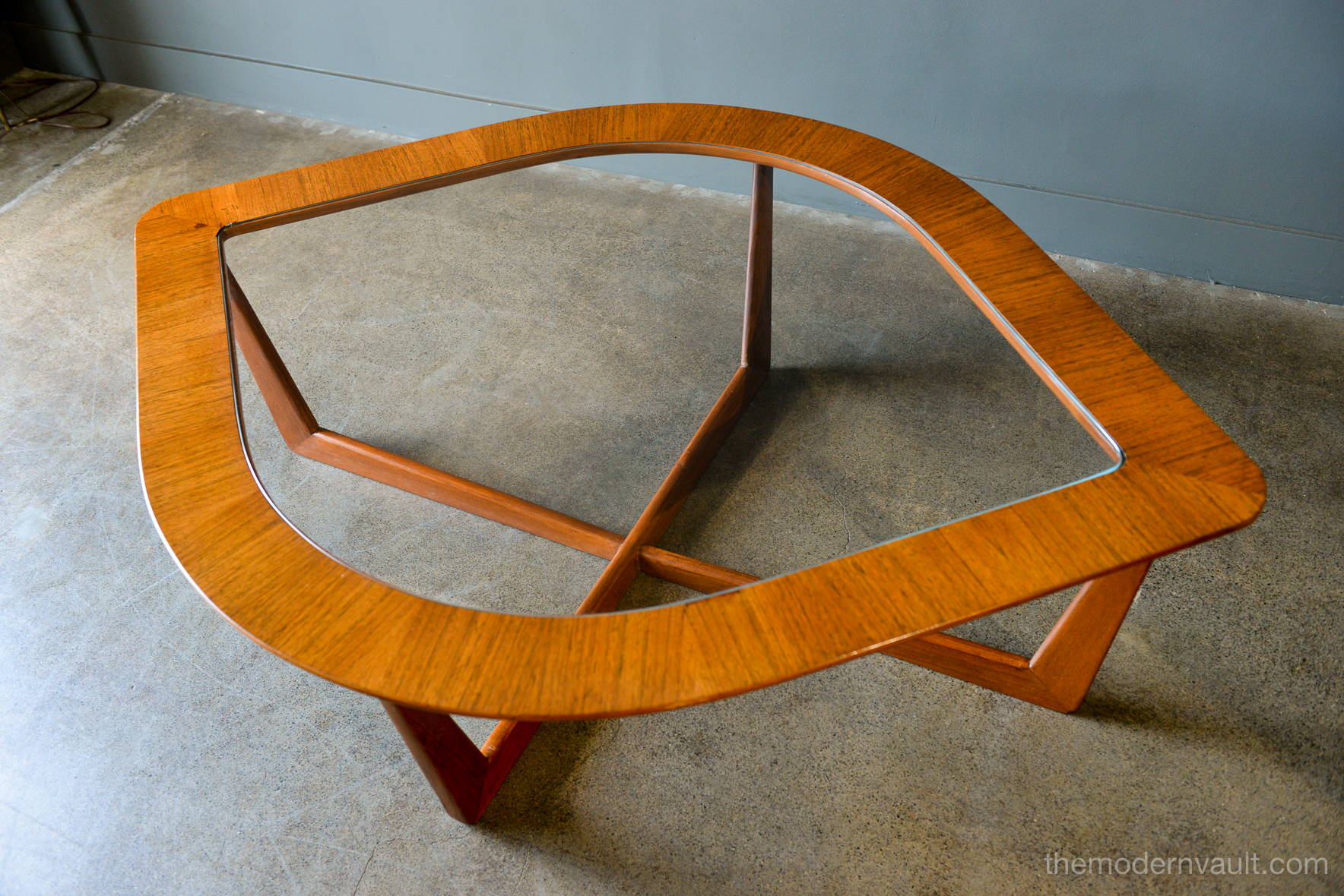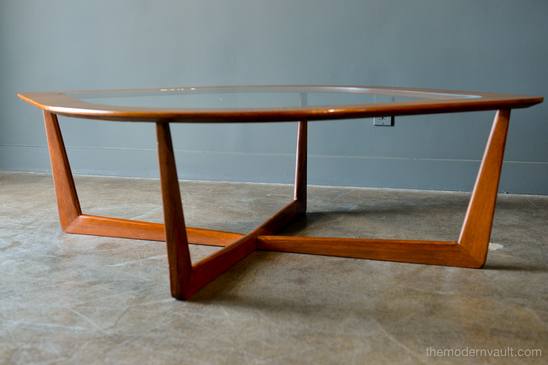 Mahogany and glass coffee table by Erno Fabry, circa 1955. Rare eyeball shape with mahogany top and sculpted mahogany legs and glass inlay. Glass is in very good condition with only slight wear. Mahogany has some minor wear, as shown otherwise very good. Rare shape, this piece has been identified in “Furniture for modern interiors” de Mario Dal Fabbro, edition Reinhold, New york, page 195
