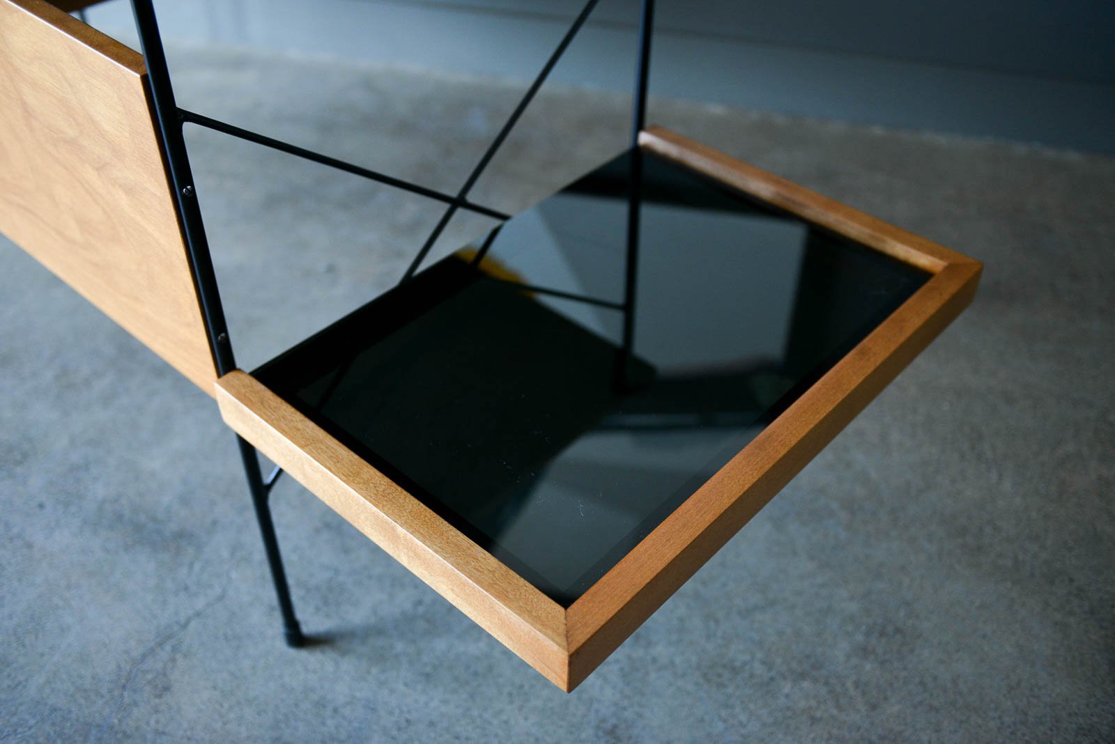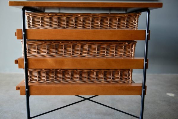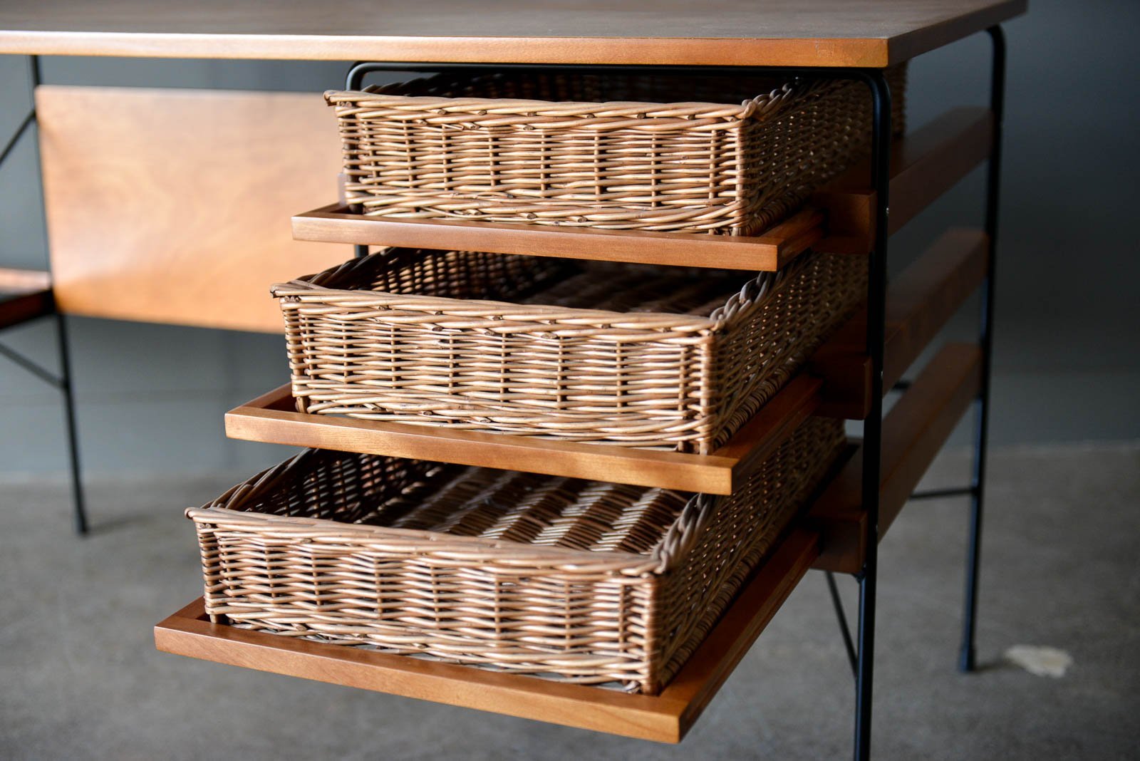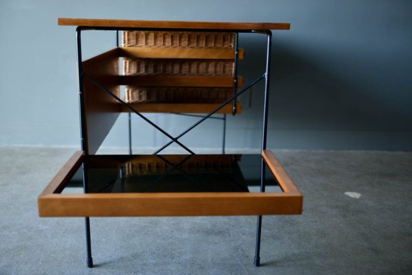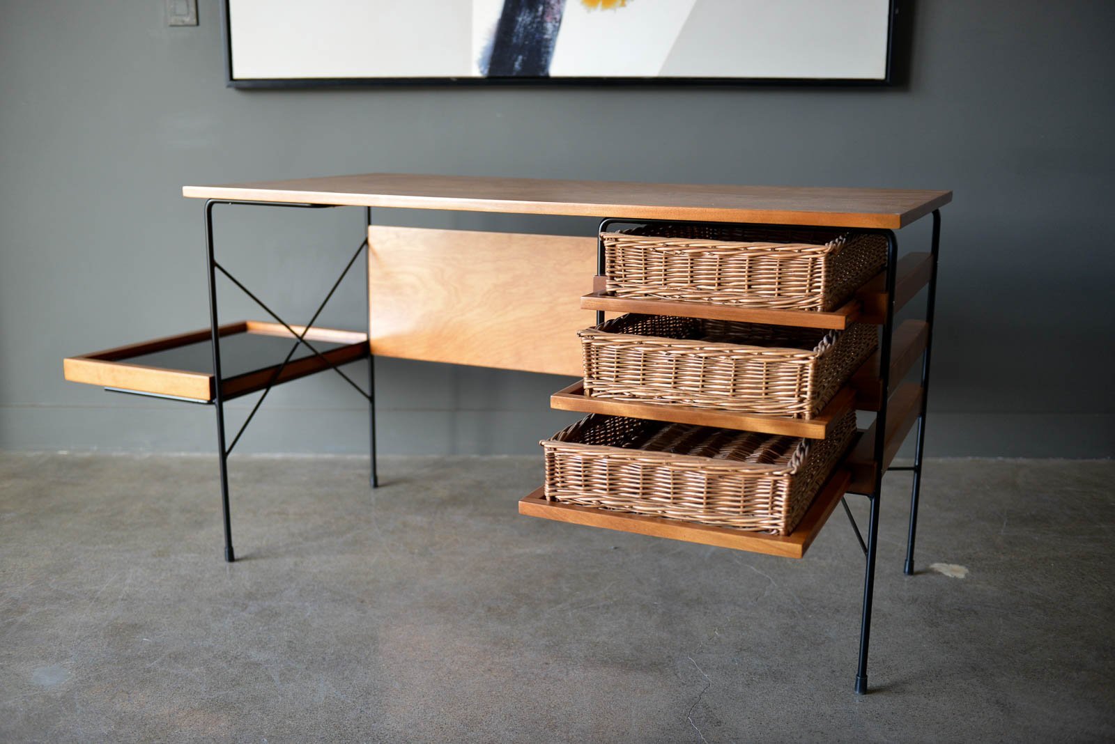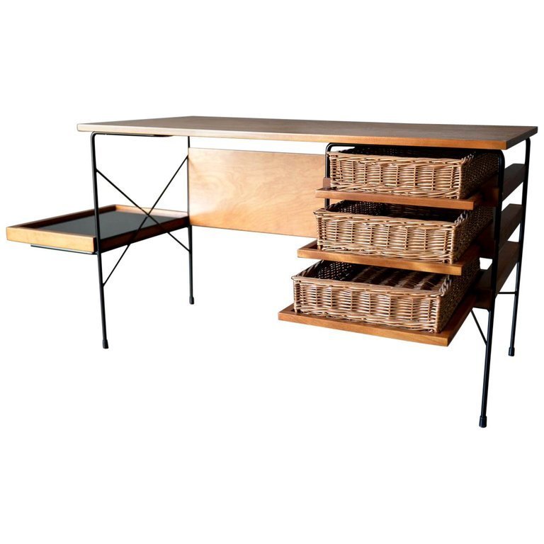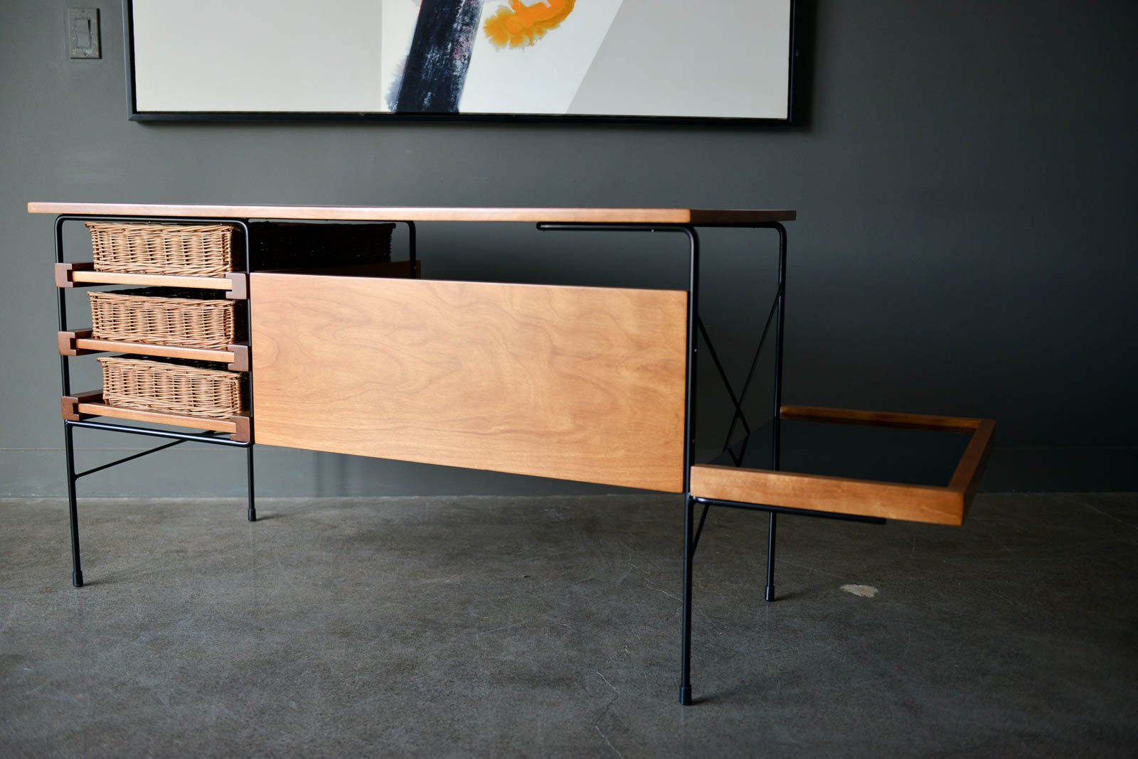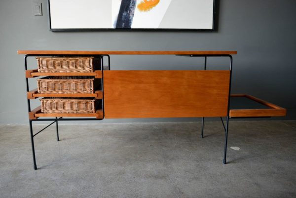 Maple and iron desk by Dorothy Schindele for Modern Color, circa 1950. From the Pacifica Line by Modern Color of California. Original willow side baskets on sliding drawers. Smoked glass shelf for books or additional storage. Extremely rare, hard to find desk with a timeless design. Professionally restored in showroom condition. Measures: Overall (including side shelf) 61″ W x 24″ D x 28″ H. Desktop only measures 48″.