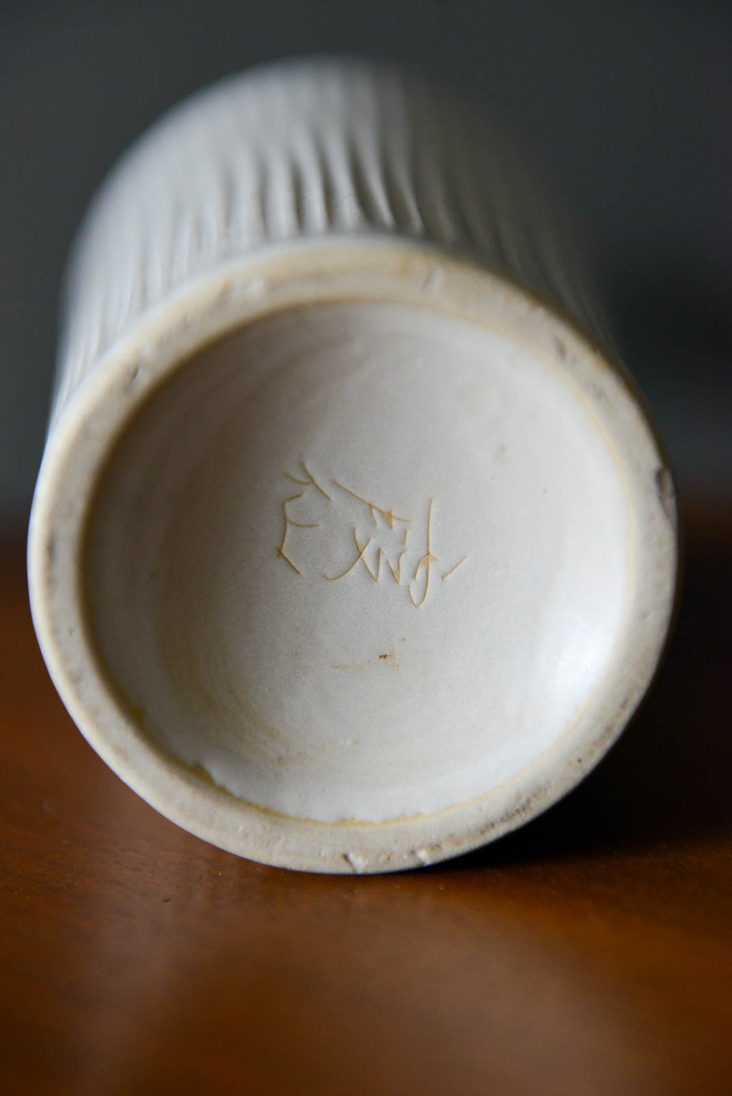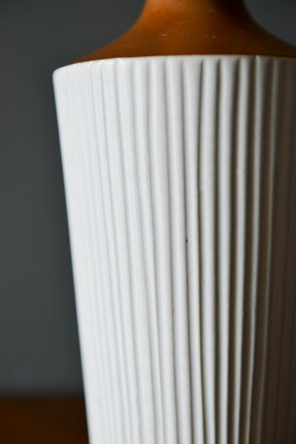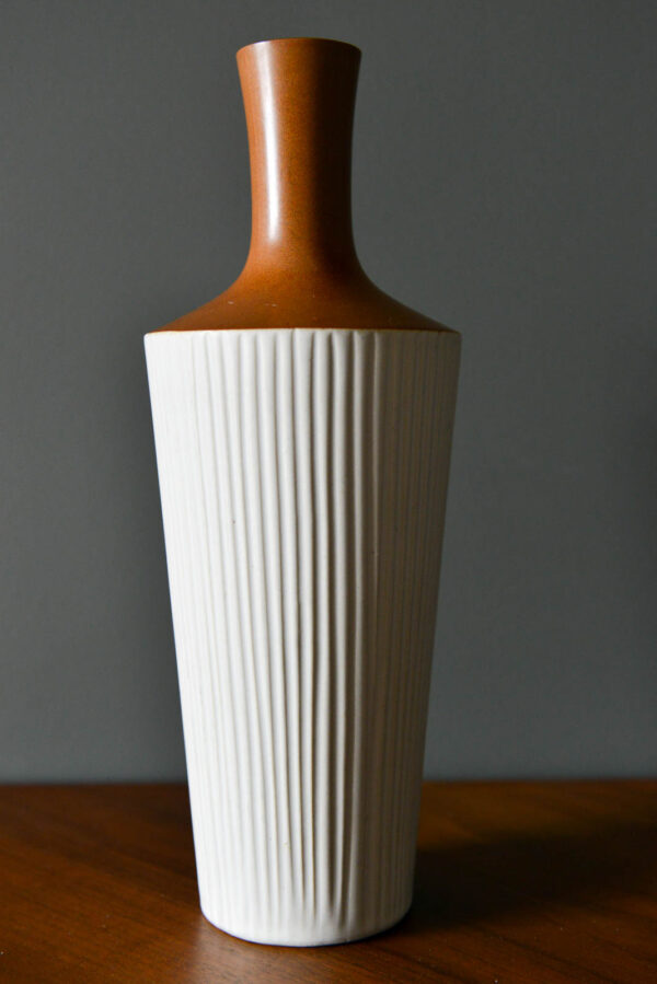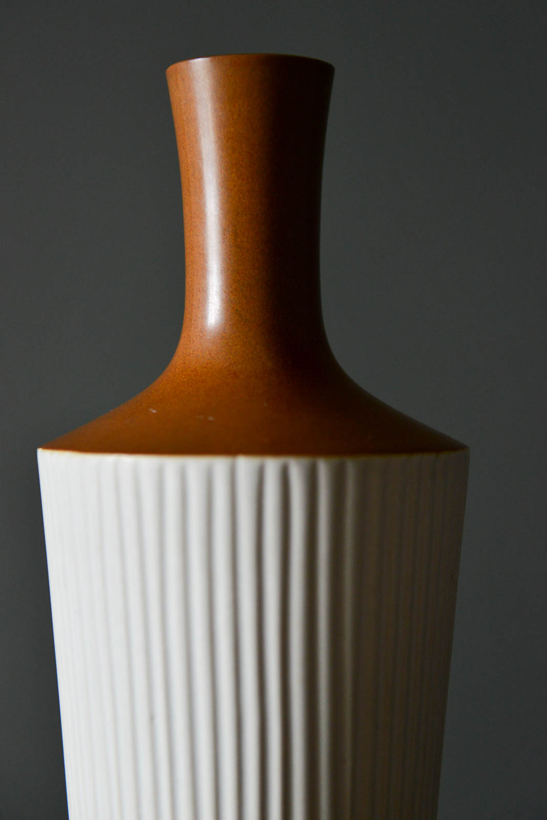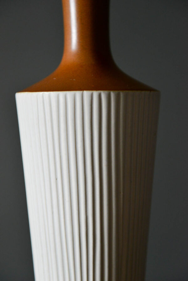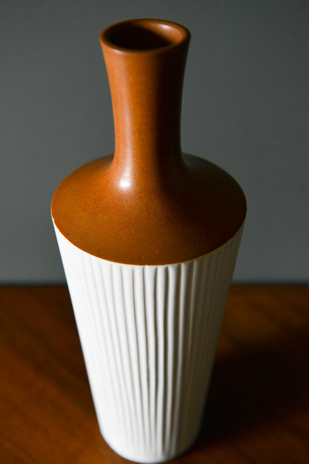Mid-Century Modern Kitagama Kasen ceramic vase, circa 1965. Ribbed body with beautiful rust glaze top. Signed on underside. Measures: 12.5″ H.