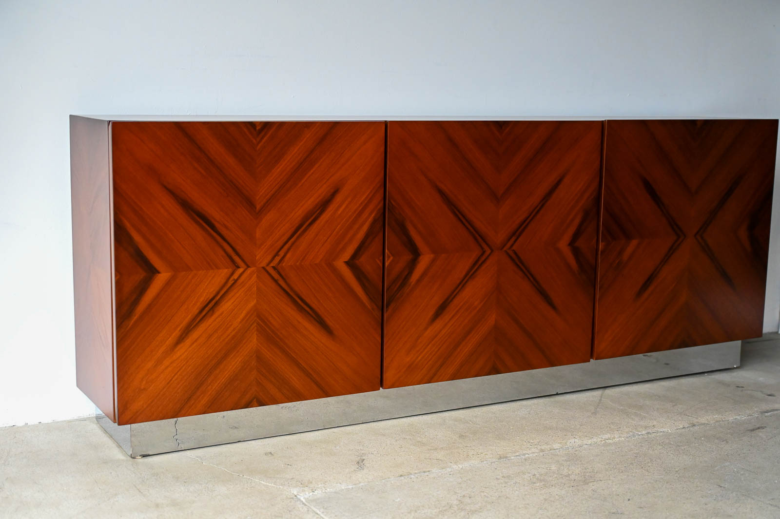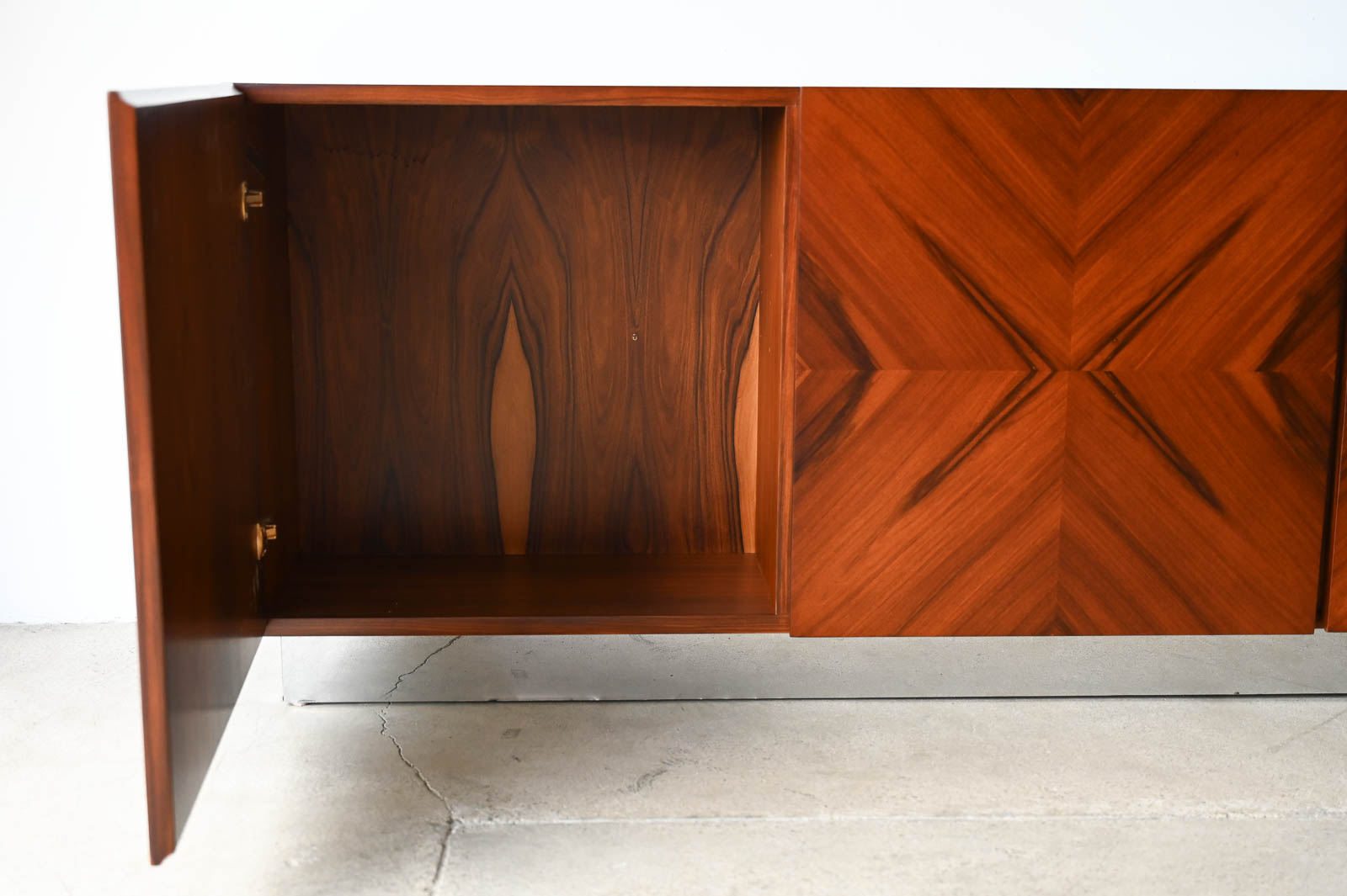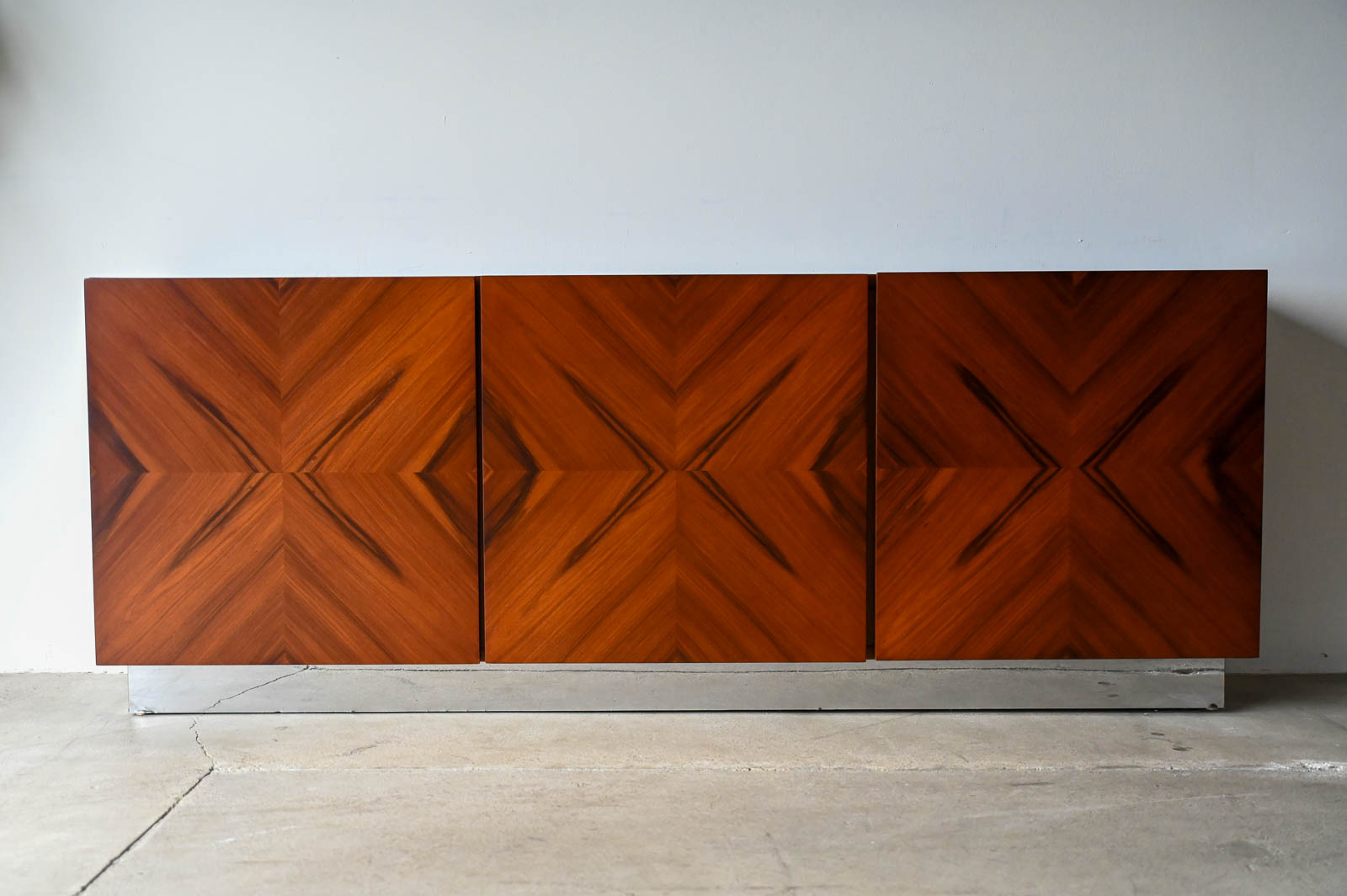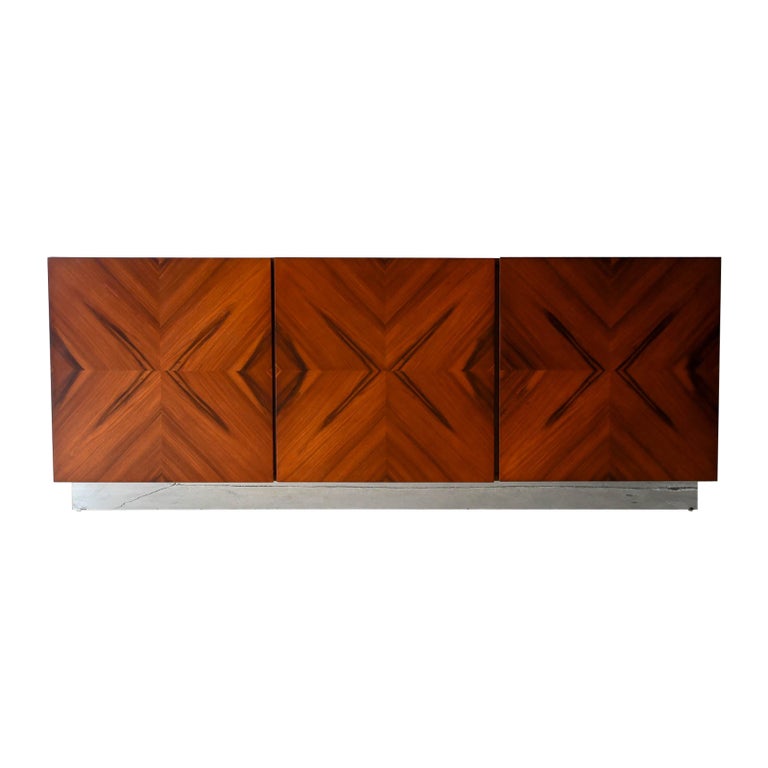 Milo Baughman for Thayer Coggin Rosewood Media Cabinet with Chrome Plinth Base ca. 1970. Beautifully restored rosewood door panels with inner adjustable shelving. The rosewood grain is incredible on the doors and throughout the piece. Original chrome covered plinth base. Can also be wall mounted or floated if desired. Great for entry or media/audio cabinet or smaller spaces. Measures 66″ W x 12″ D x 25″ H.