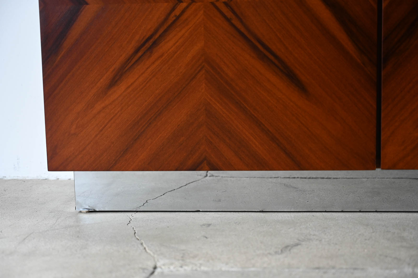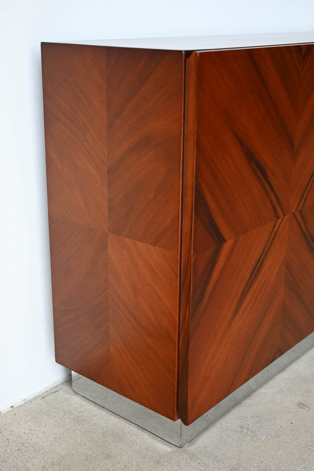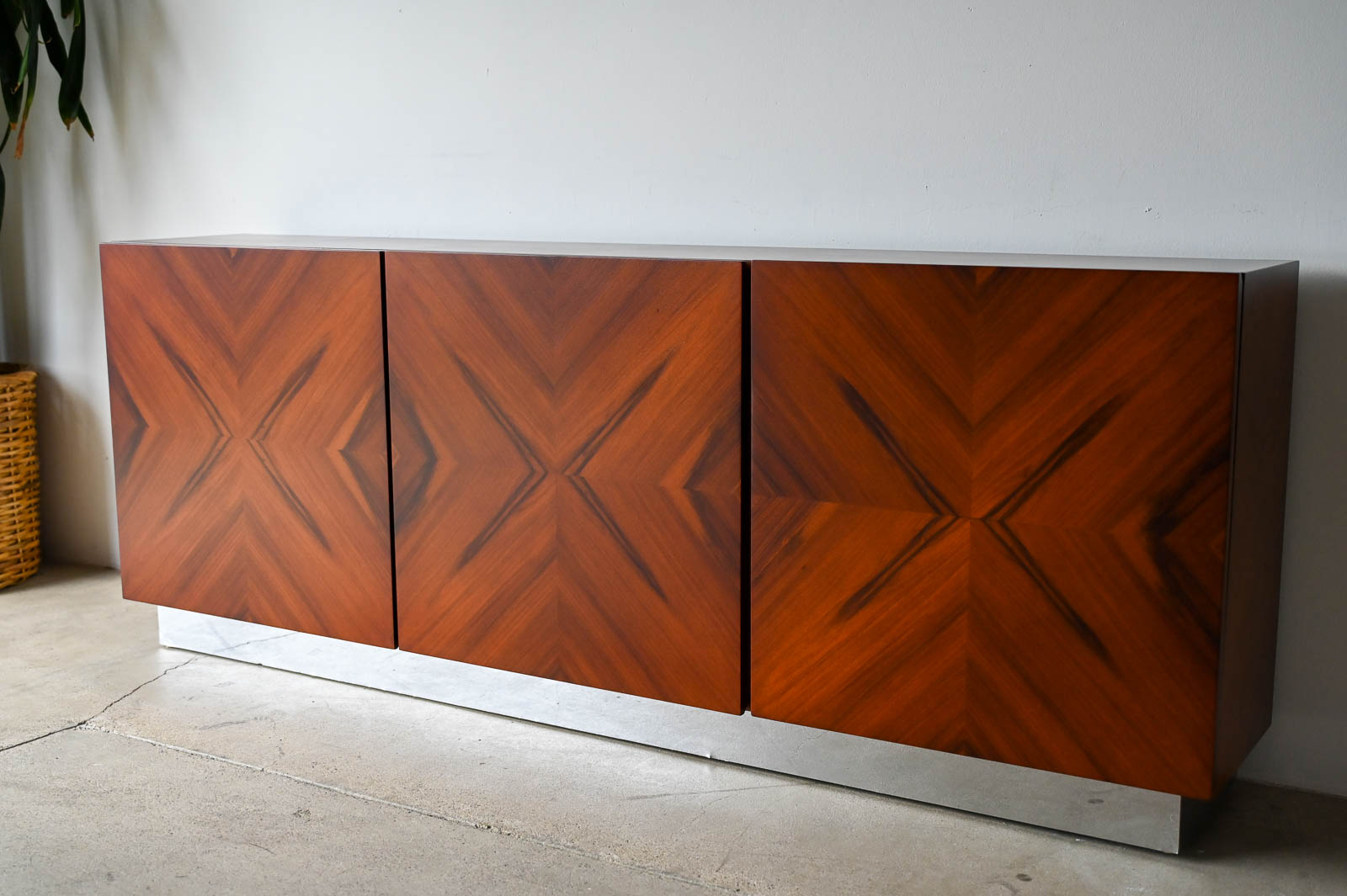 Milo Baughman for Thayer Coggin Rosewood Media Cabinet with Chrome Plinth Base ca. 1970. Beautifully restored rosewood door panels with inner adjustable shelving. The rosewood grain is incredible on the doors and throughout the piece. Original chrome covered plinth base. Can also be wall mounted or floated if desired. Great for entry or media/audio cabinet or smaller spaces. Measures 66″ W x 12″ D x 25″ H.