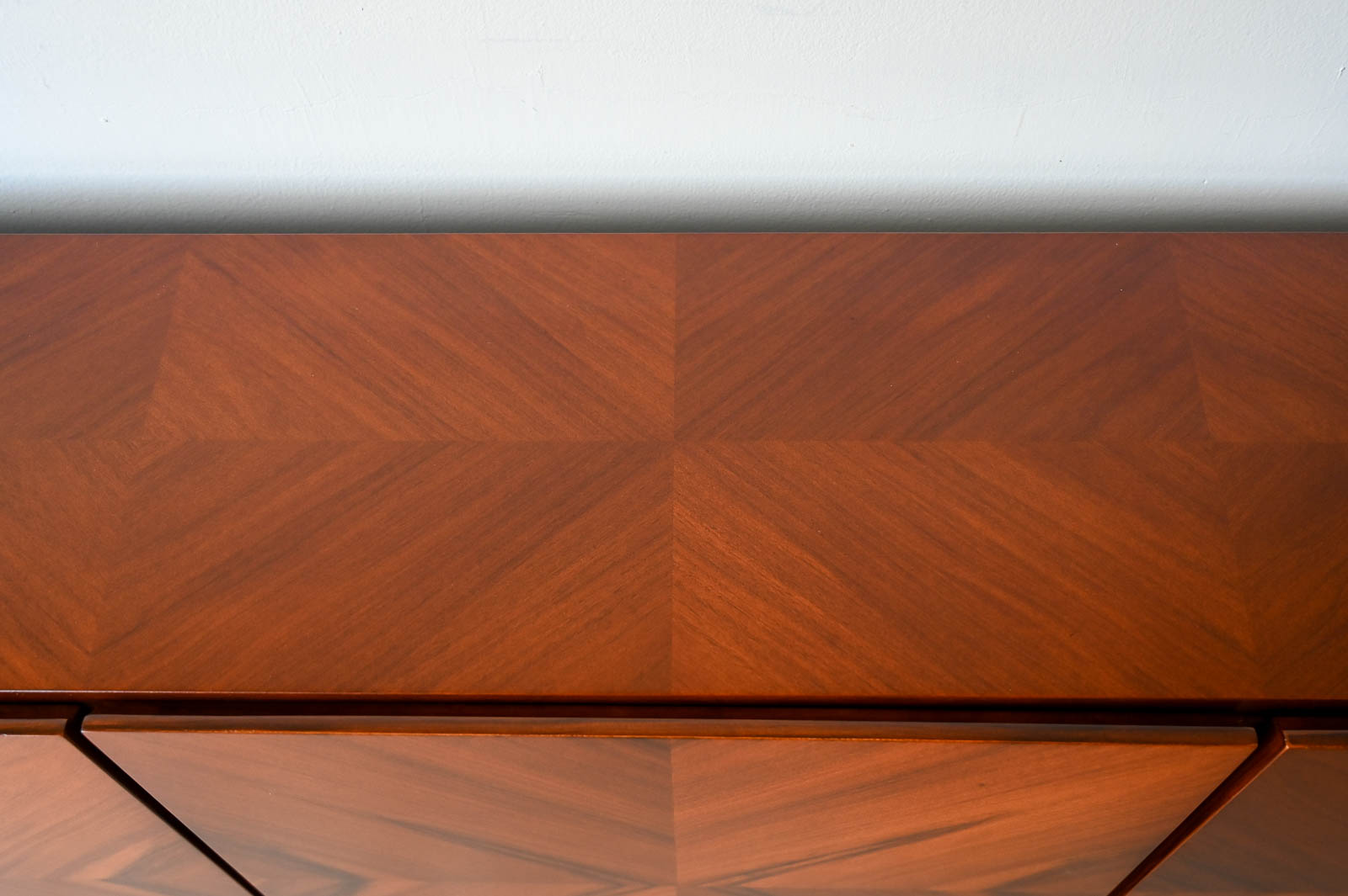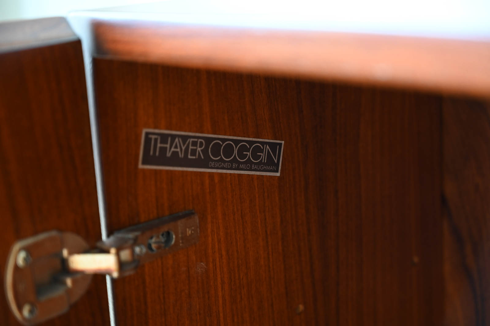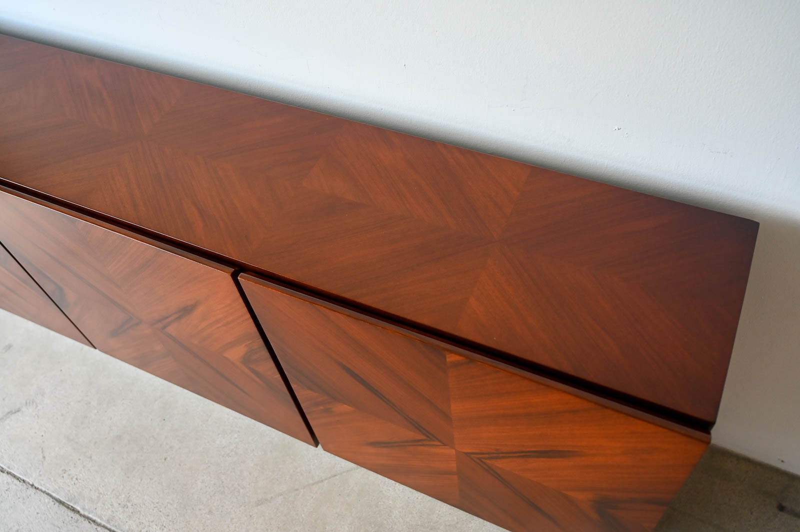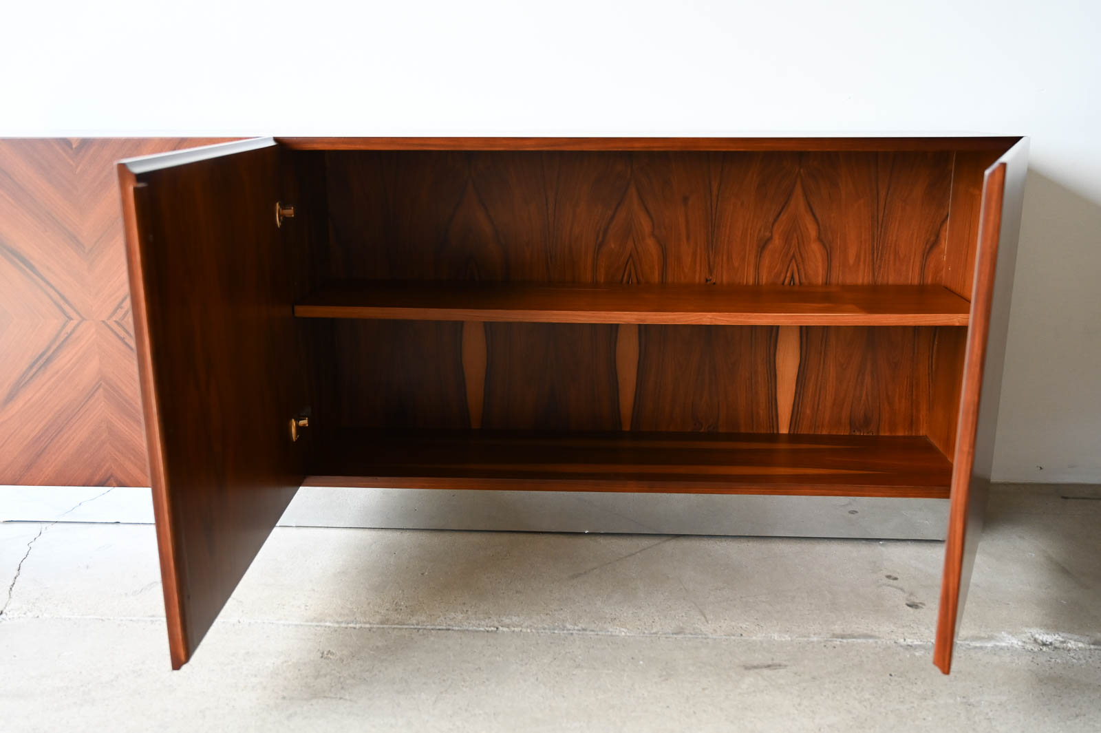 Milo Baughman for Thayer Coggin Rosewood Media Cabinet with Chrome Plinth Base ca. 1970. Beautifully restored rosewood door panels with inner adjustable shelving. The rosewood grain is incredible on the doors and throughout the piece. Original chrome covered plinth base. Can also be wall mounted or floated if desired. Great for entry or media/audio cabinet or smaller spaces. Measures 66″ W x 12″ D x 25″ H.