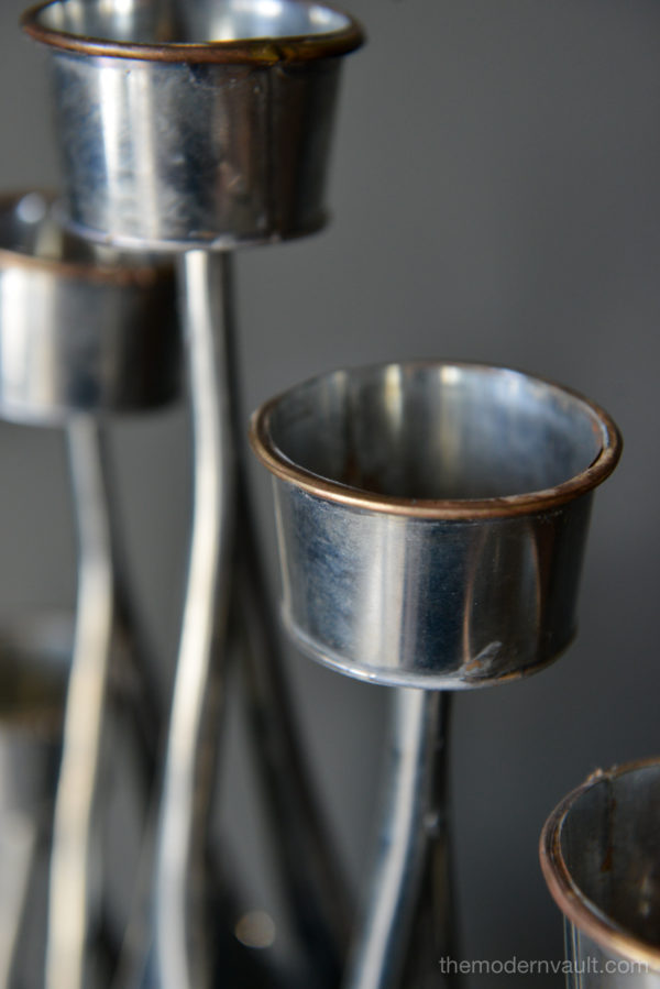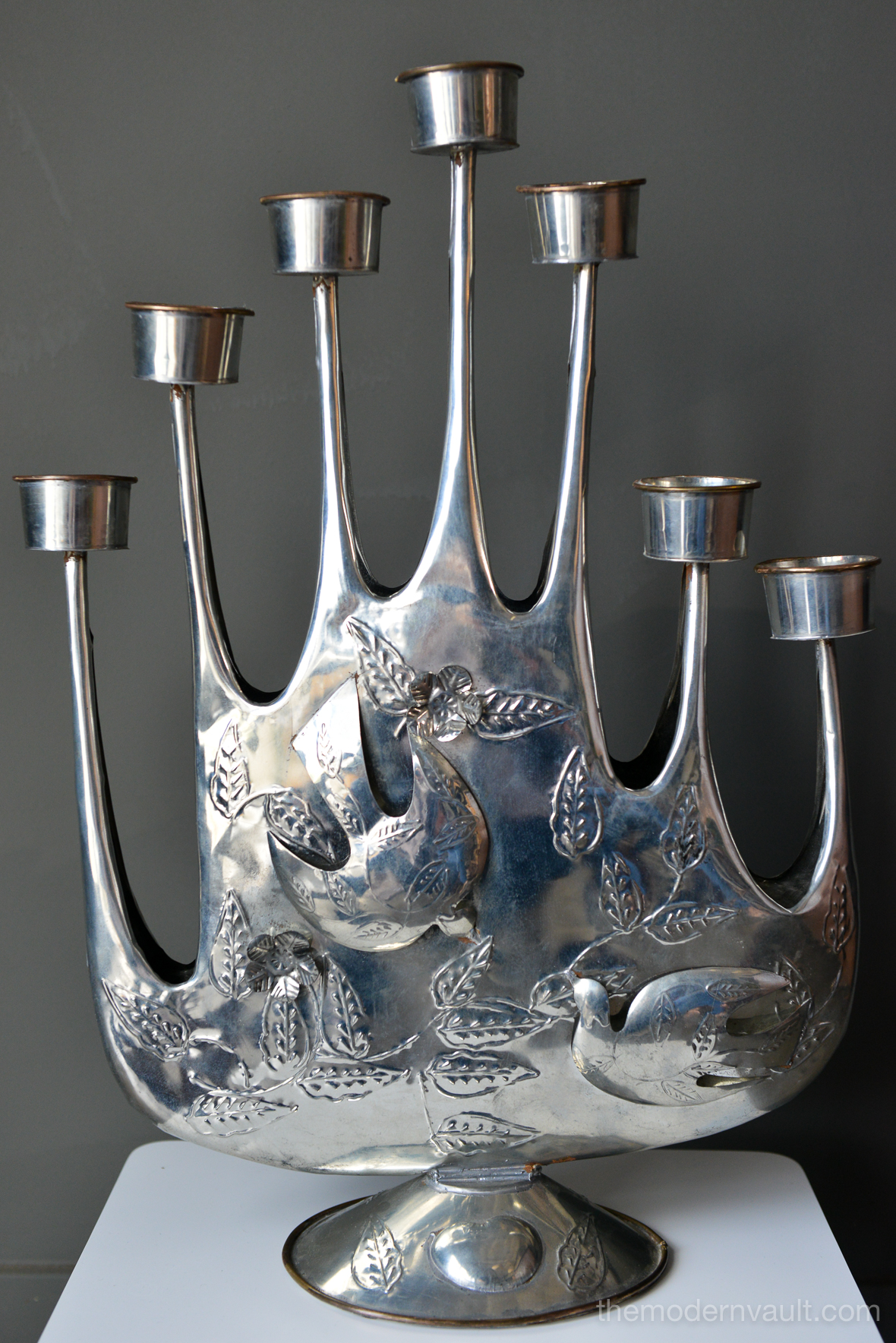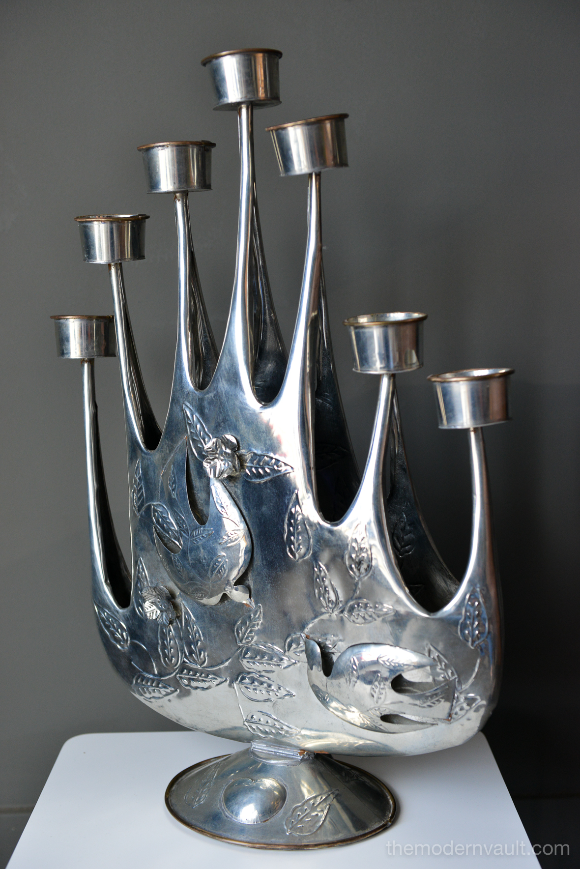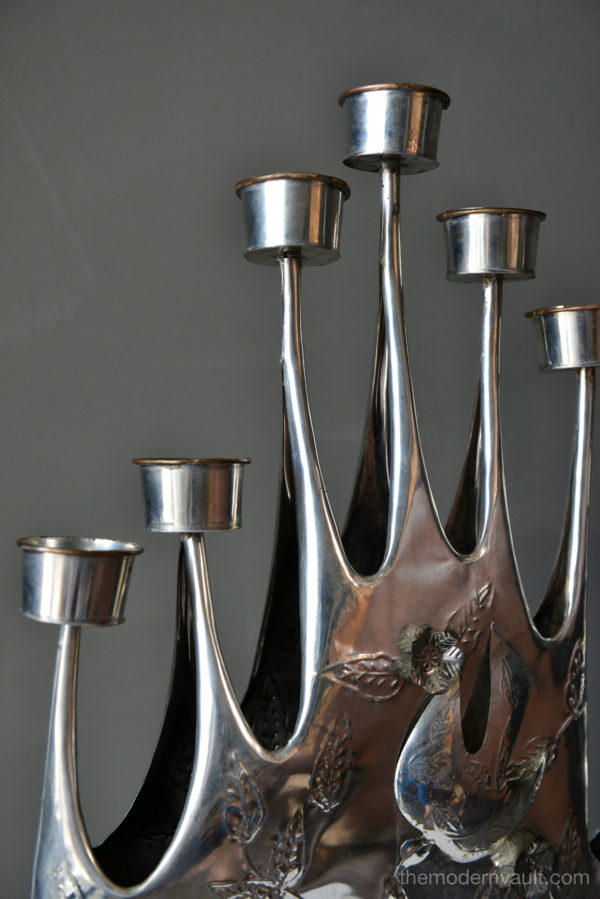 Hammered tin Brutalist tin candelabra by Mexican artist Gene Byron. Handmade of hand-hammered tin with lovely detail, this beautiful piece was also featured in the Verna Cook Shipway Mexican modernism design books of the 1960s. Signed with monogram on underside. Measures 23″ H x 17.5″ W x 5″ D