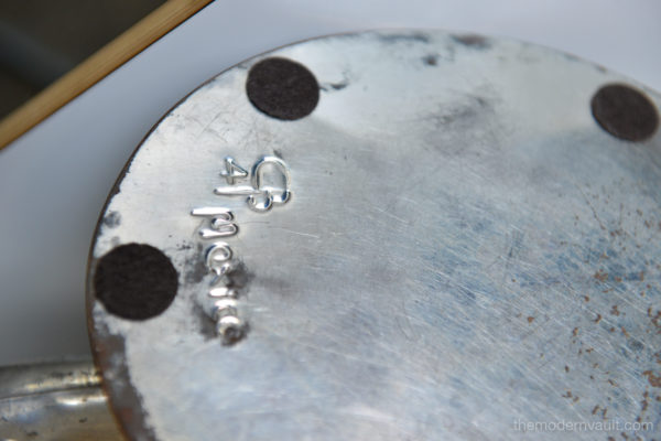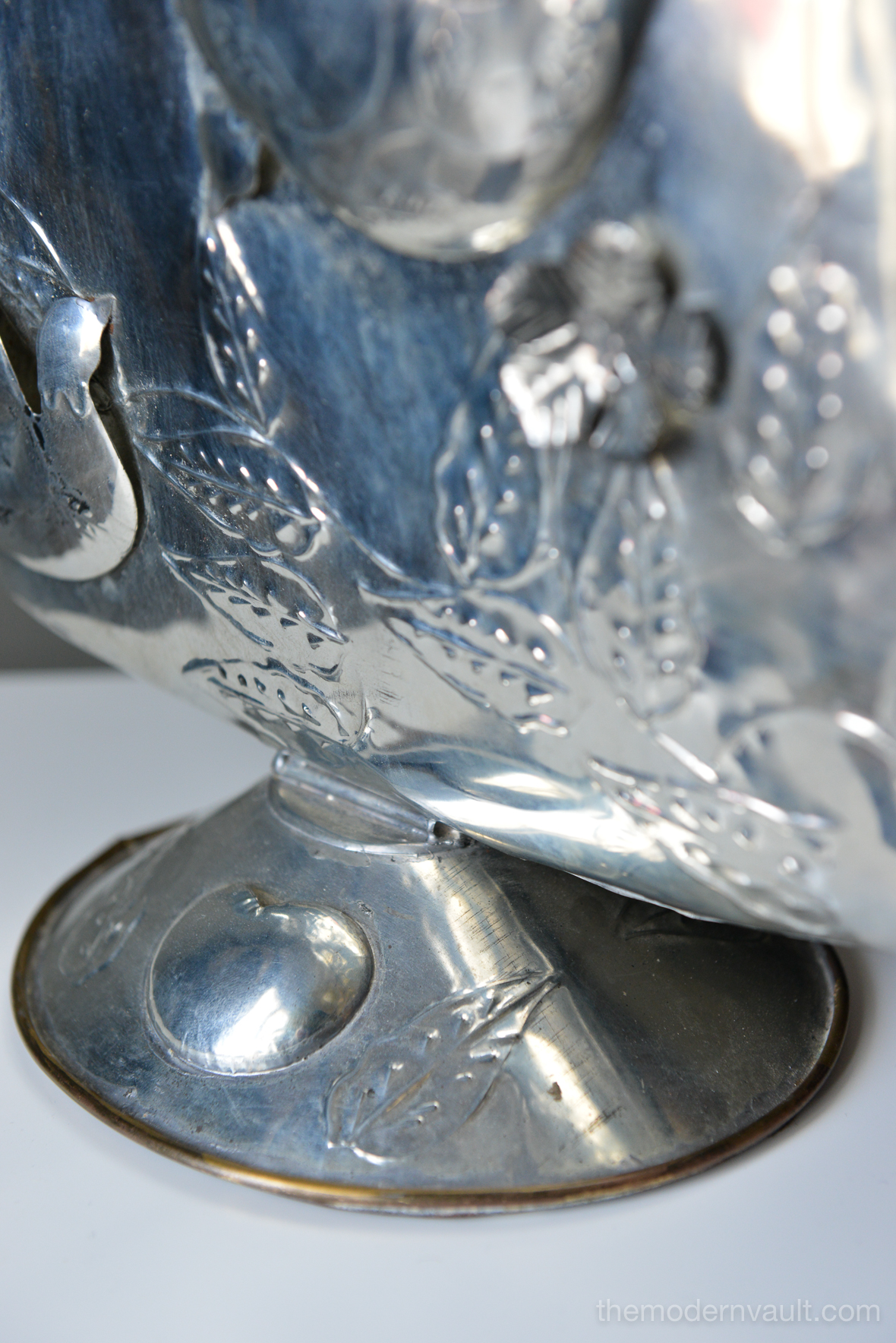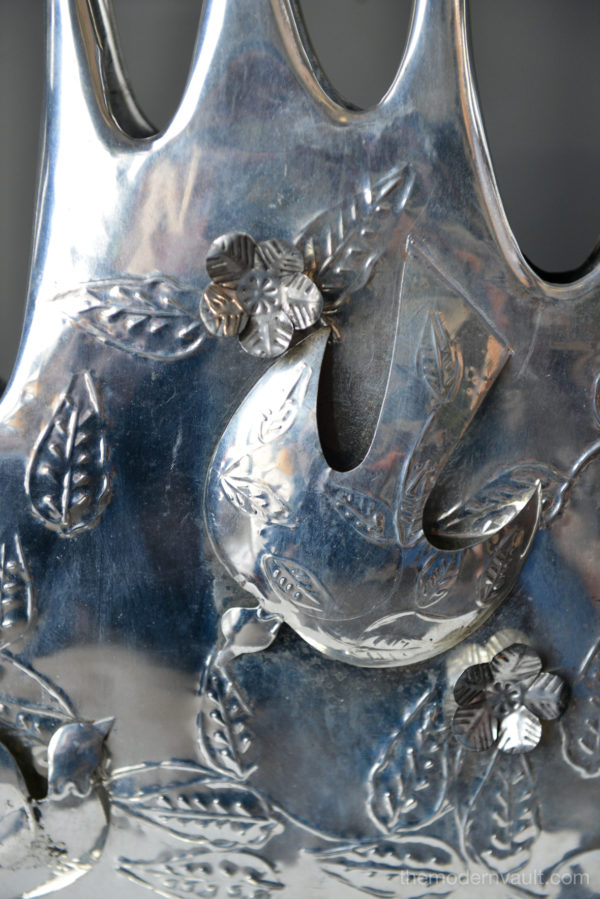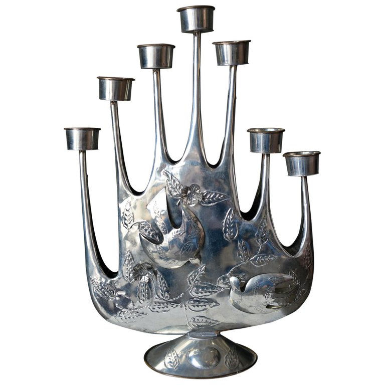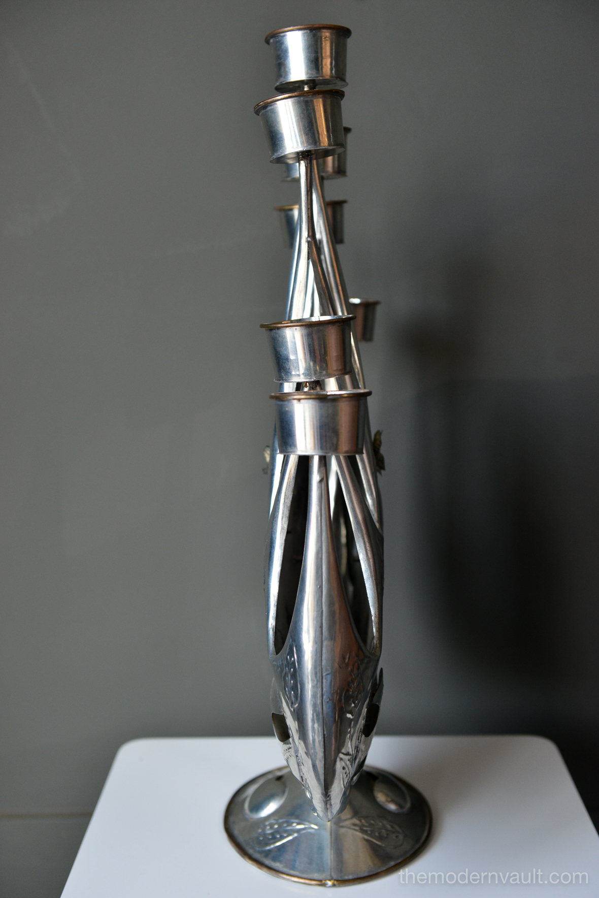 Hammered tin Brutalist tin candelabra by Mexican artist Gene Byron. Handmade of hand-hammered tin with lovely detail, this beautiful piece was also featured in the Verna Cook Shipway Mexican modernism design books of the 1960s. Signed with monogram on underside. Measures 23″ H x 17.5″ W x 5″ D