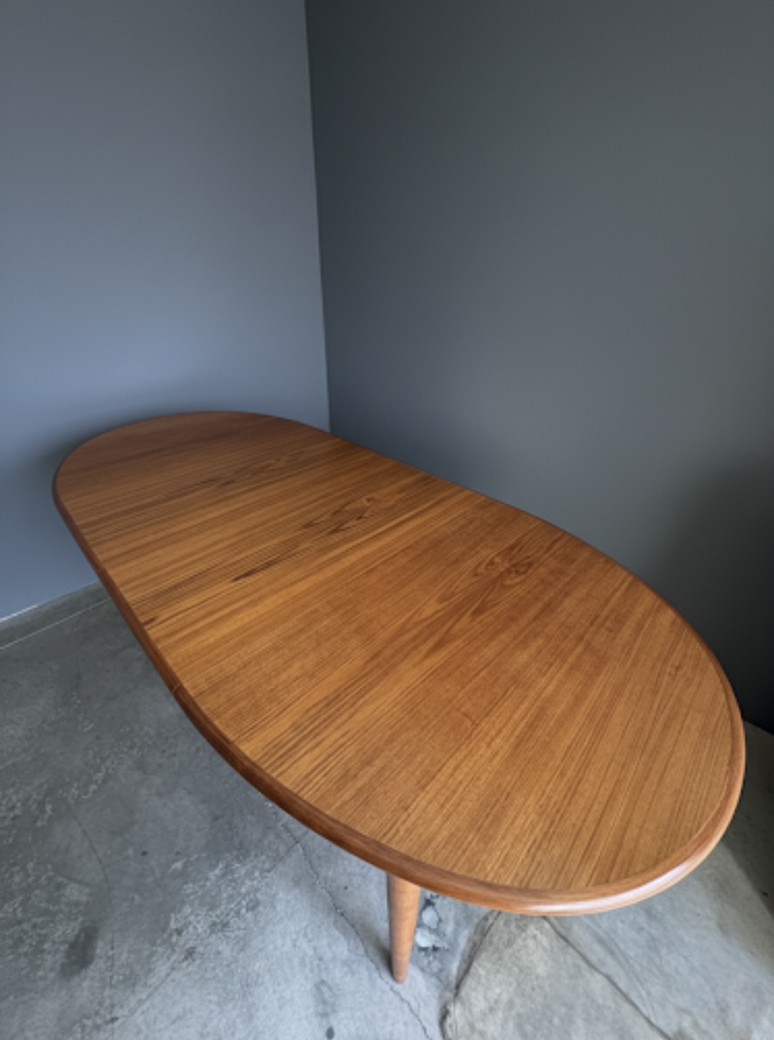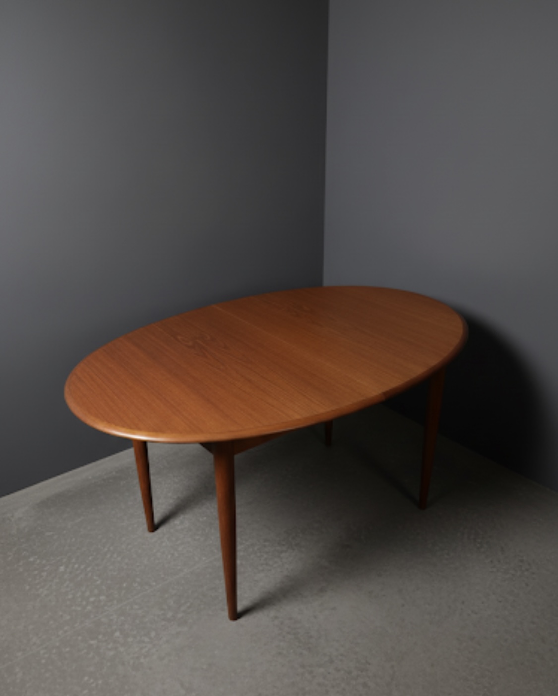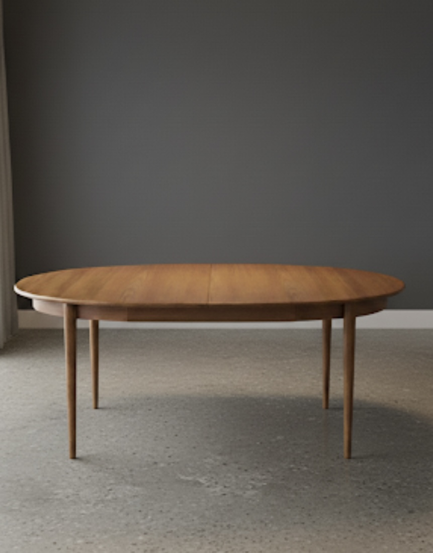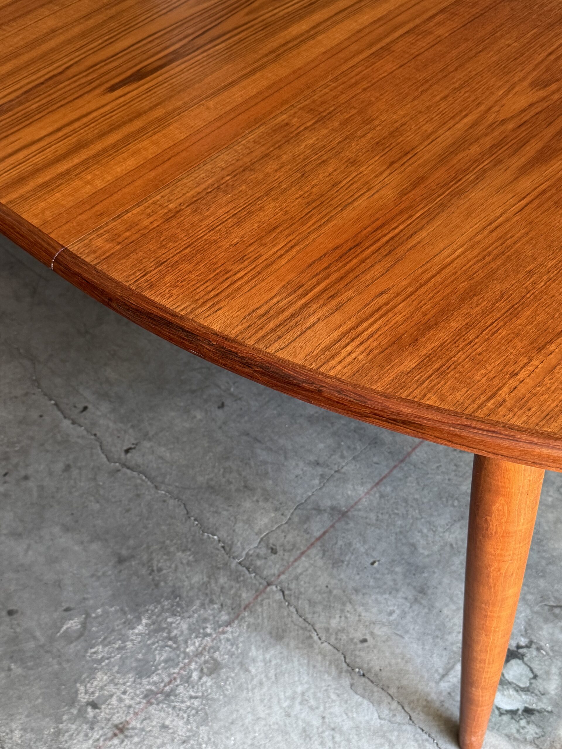 Just in time for the holidays!! Oval Expandable Teak Dining Table by Niels O. Moller for Gudme Denmark, Ca. 1960. This gorgeous table is in excellent original condition with hardly any wear. The table top and included two leaves are all book-matched teak and the leaves can be used independently from one another, allowing for a full expandable size of 97″ long to seat 8-10. Solid teak sculpted turned legs with continuous table skirting around the bottom and included on the leaves, allow for a seamless look when the table is expanded. Only very slight wear to one spot, as shown otherwise excellent original condition. Truly a work of wonderful craftsmanship in this table with a hard to find Oval size. Excellent craftsmanship in this table, the edges are contrasting grain teak and very well made. Legs are removable for shipping.
