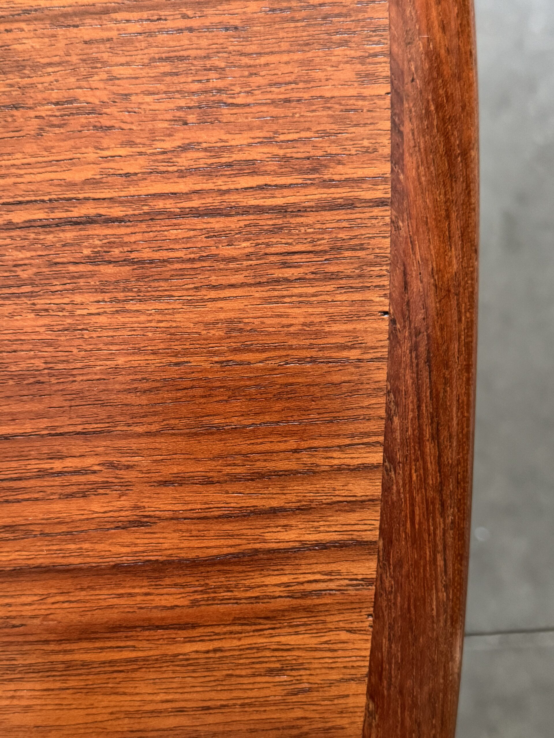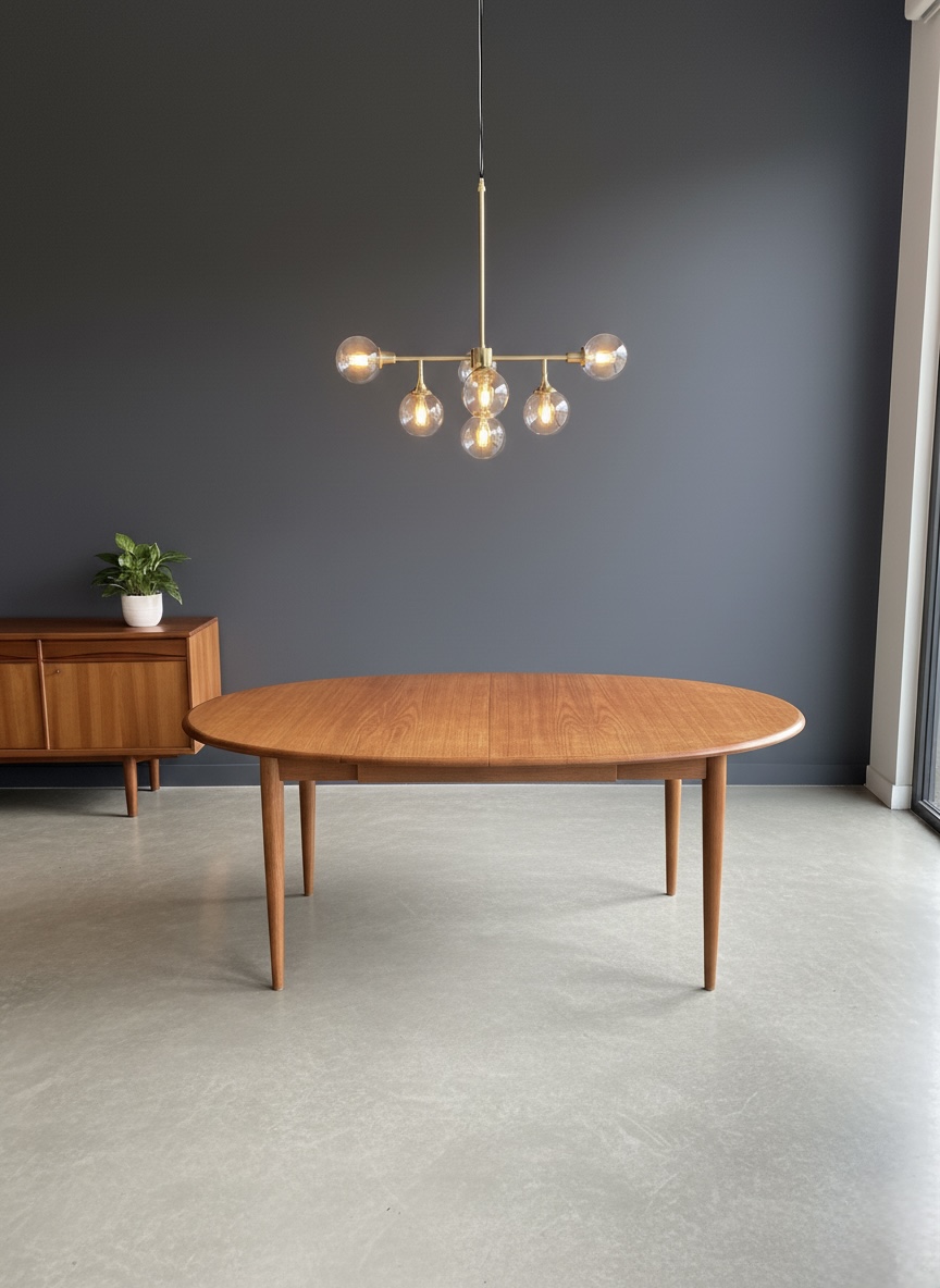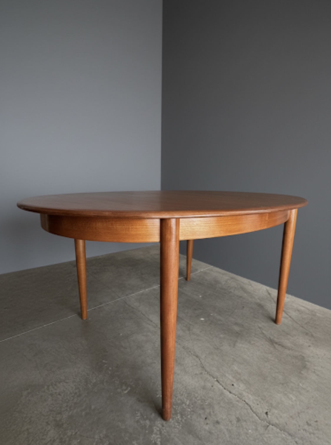 Just in time for the holidays!! Oval Expandable Teak Dining Table by Niels O. Moller for Gudme Denmark, Ca. 1960. This gorgeous table is in excellent original condition with hardly any wear. The table top and included two leaves are all book-matched teak and the leaves can be used independently from one another, allowing for a full expandable size of 97″ long to seat 8-10. Solid teak sculpted turned legs with continuous table skirting around the bottom and included on the leaves, allow for a seamless look when the table is expanded. Only very slight wear to one spot, as shown otherwise excellent original condition. Truly a work of wonderful craftsmanship in this table with a hard to find Oval size. Excellent craftsmanship in this table, the edges are contrasting grain teak and very well made. Legs are removable for shipping.