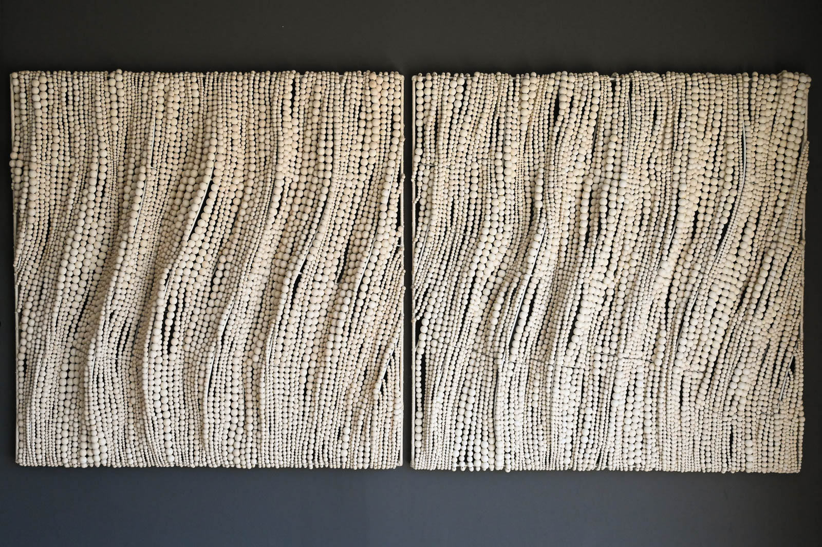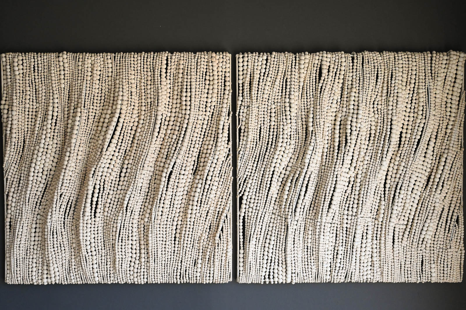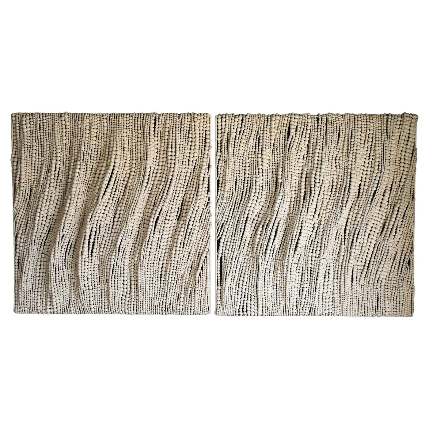 Pair of Beaded Wall Hangings by Palecek Handcrafted, wood beads in a soft white finish hand-sewn together over a metal frame. Wall décor comes with metal keyhole hangers for mounting both vertically and horizontally. Beautiful flowing wooden beads create the look of movement. Each Measure 40″ Square