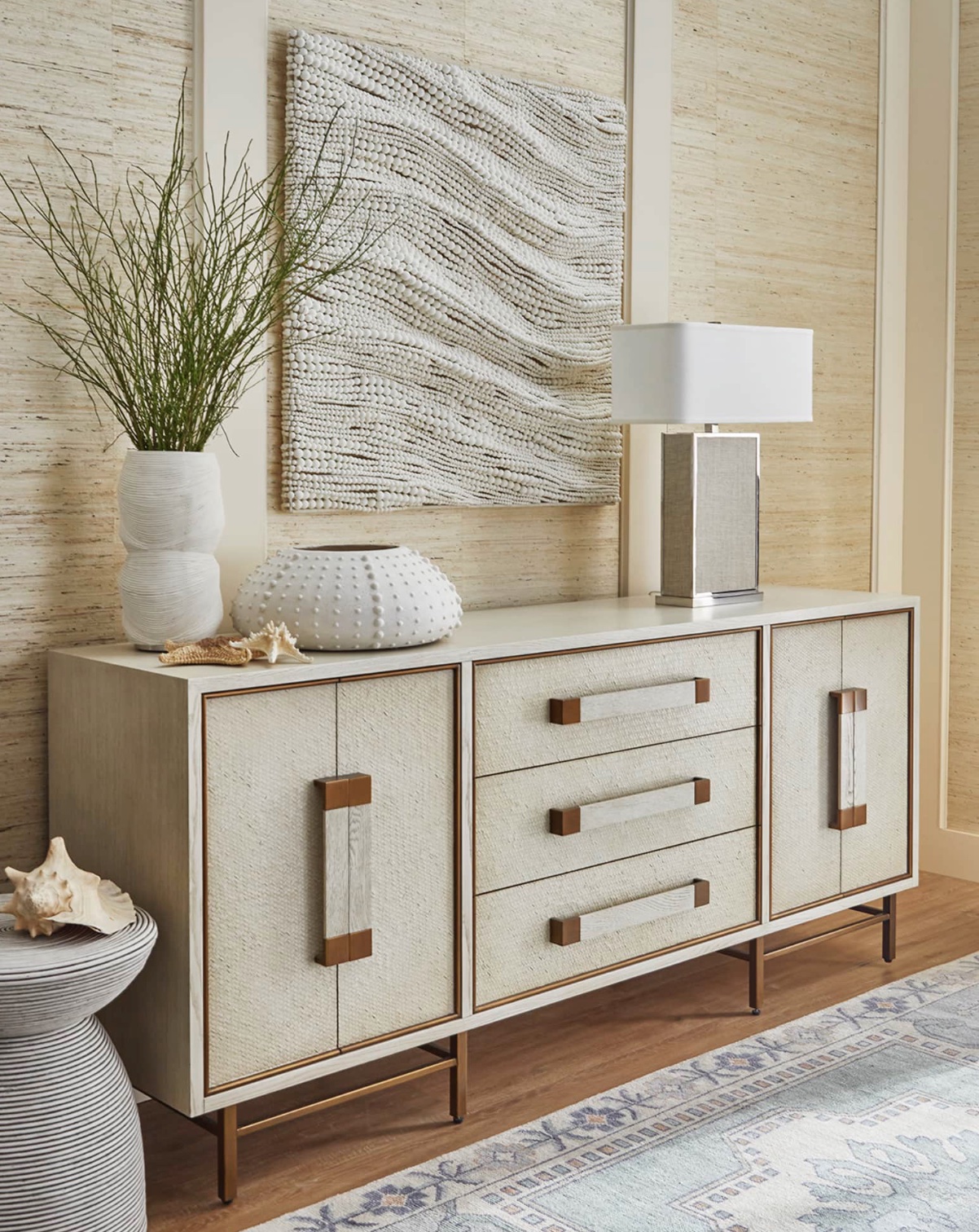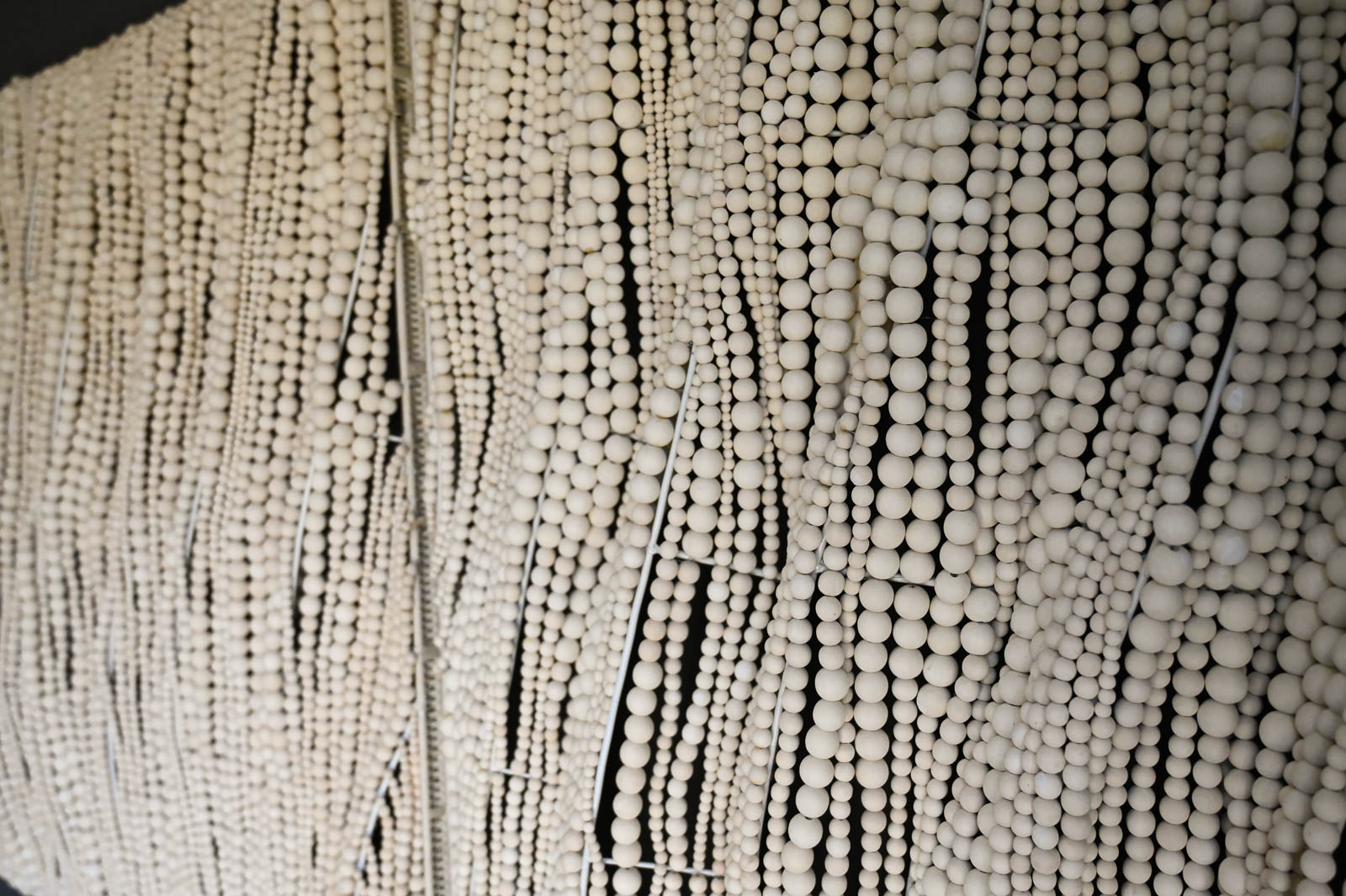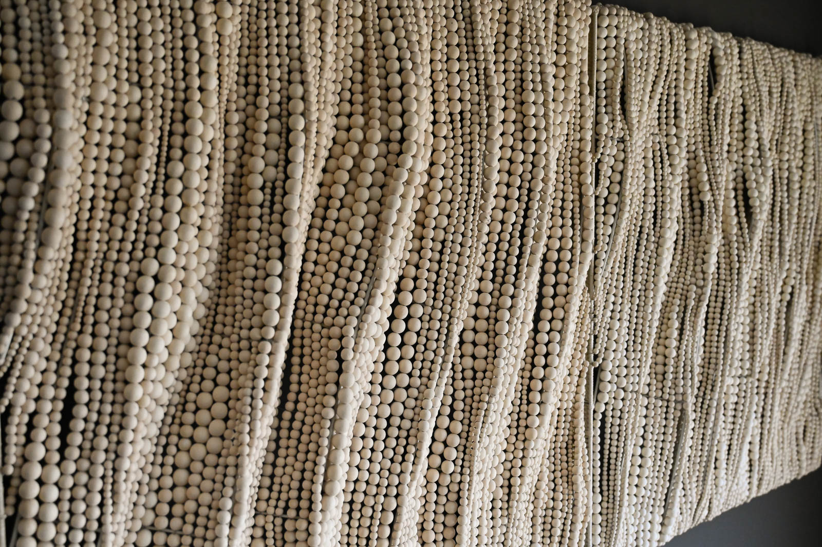 Pair of Beaded Wall Hangings by Palecek Handcrafted, wood beads in a soft white finish hand-sewn together over a metal frame. Wall décor comes with metal keyhole hangers for mounting both vertically and horizontally. Beautiful flowing wooden beads create the look of movement. Each Measure 40″ Square