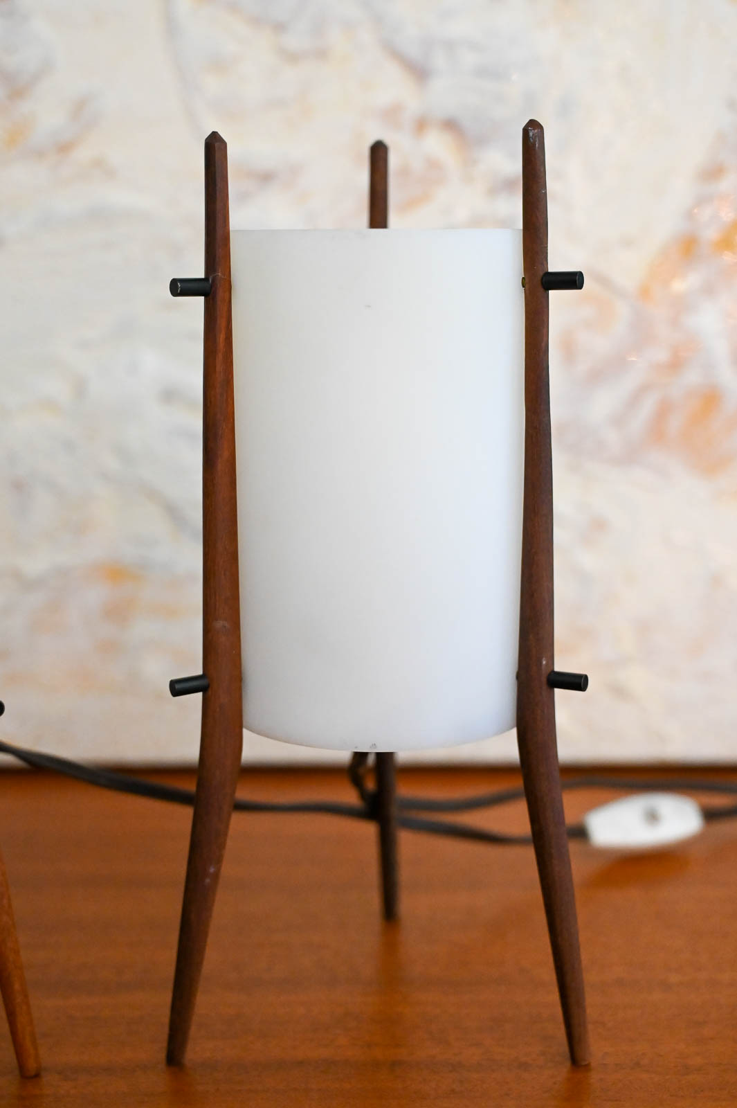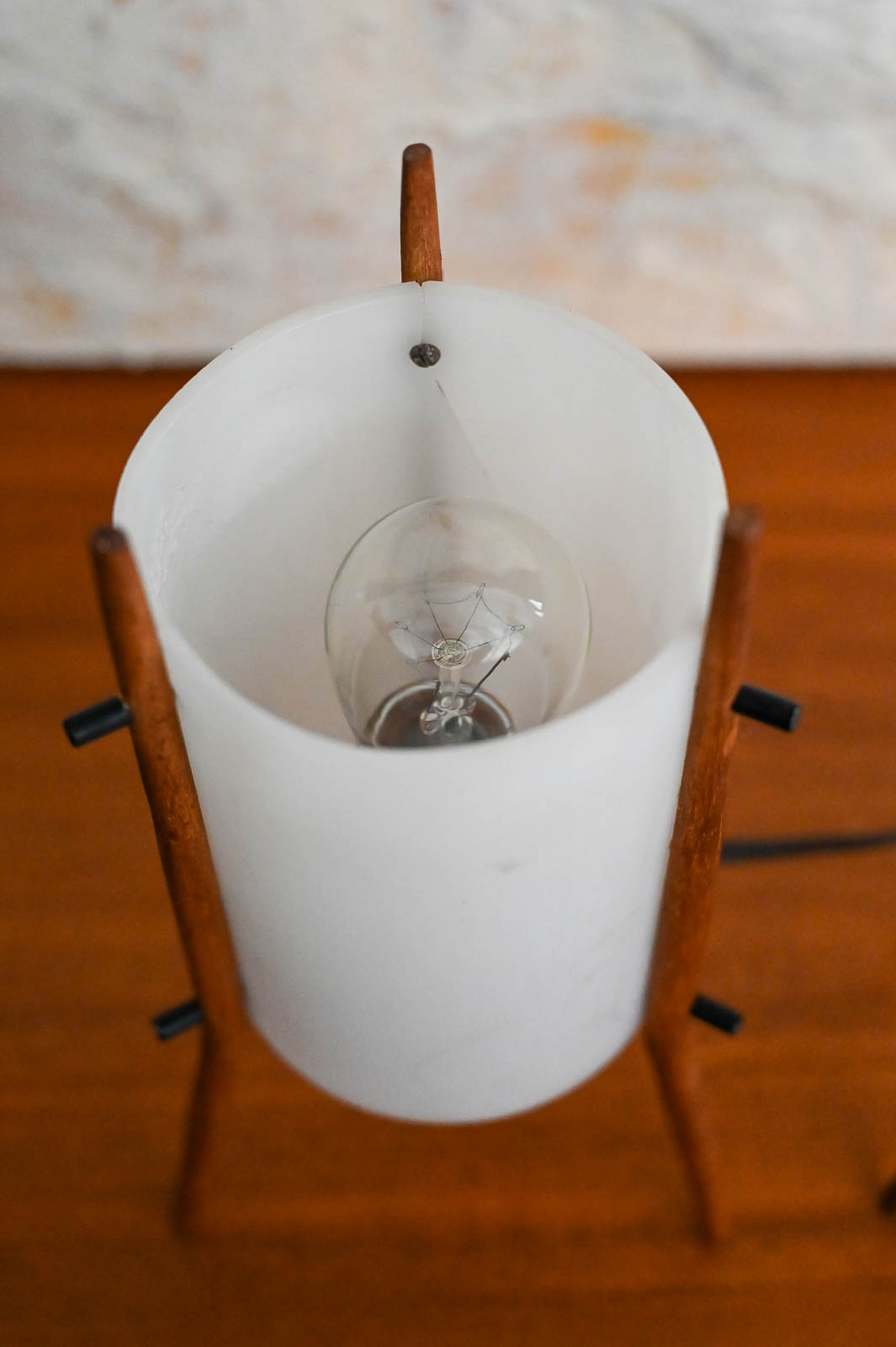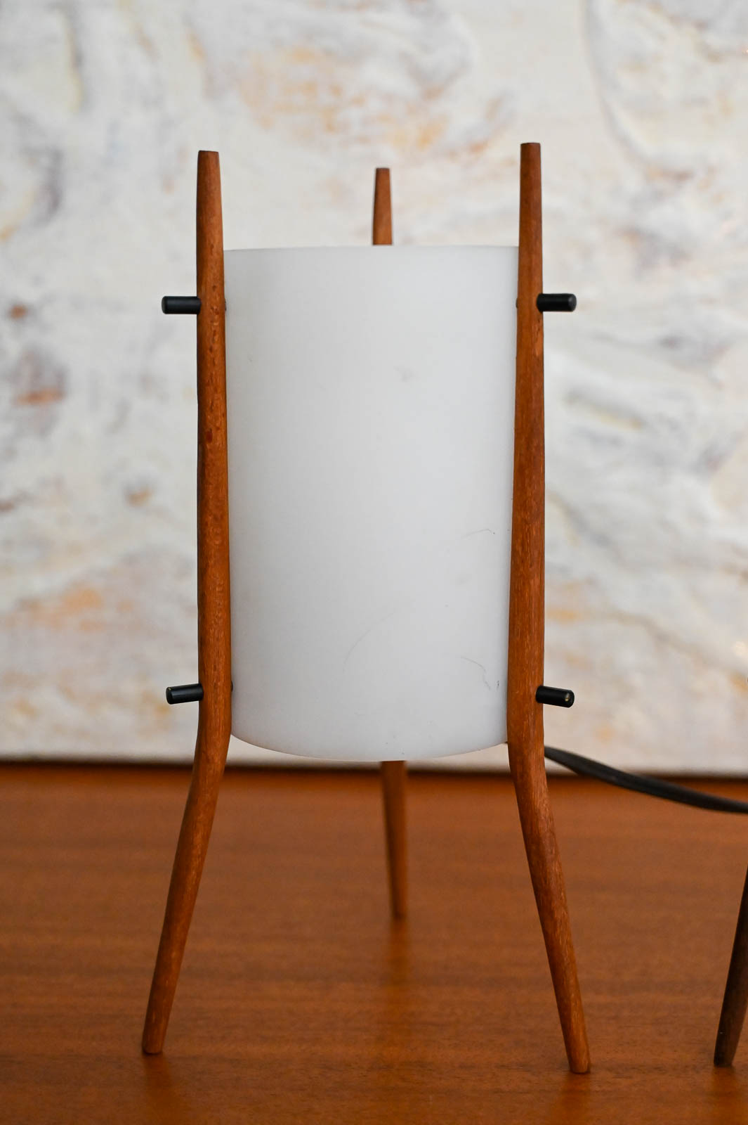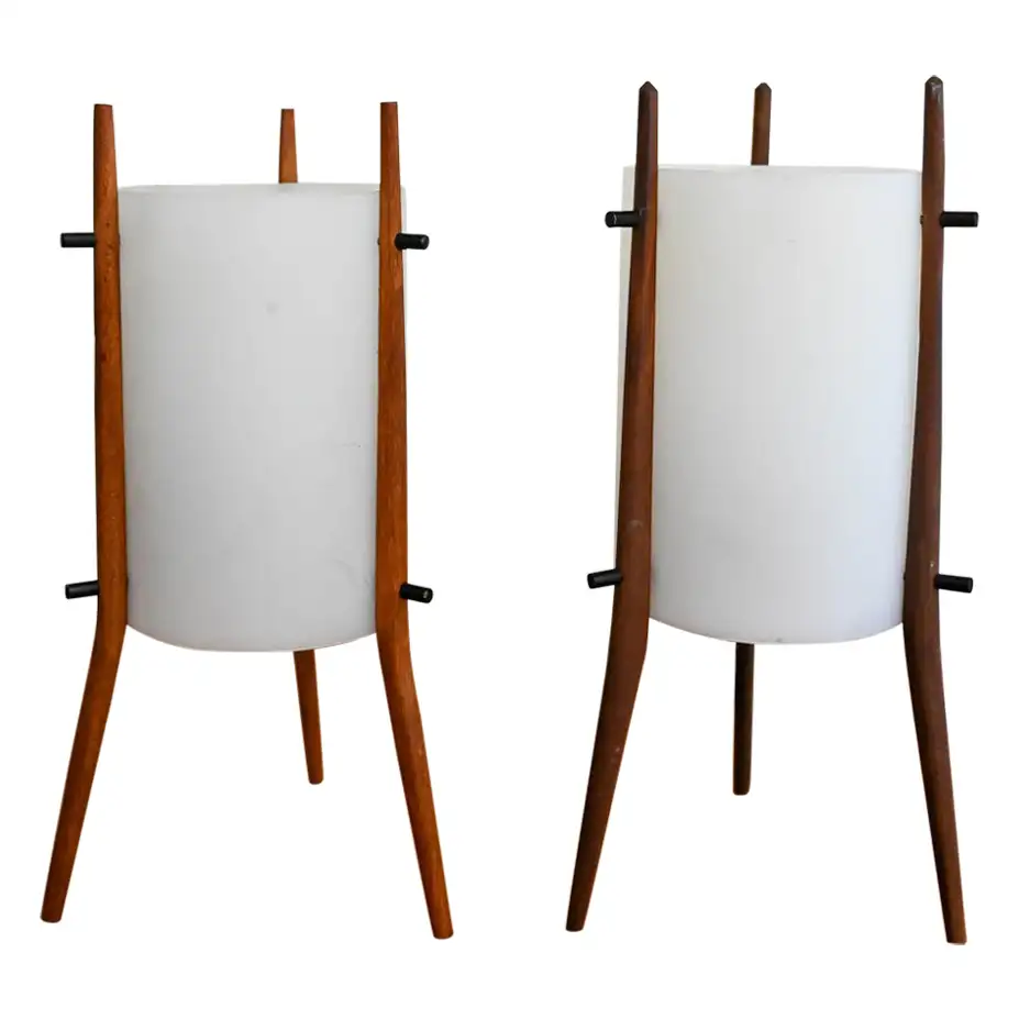 Pair of desk lamps by Alfaplex of Italy, circa 1960. Extremely rare pair of petite desk or table lamps by Alfaplex, Milano. Teak wood frame and plexi shades in good condition. Measure 10.5″ H x 5″ D. Both have original wiring and switch. One of the shades has some separation at the seam, but otherwise good. Great unusual and rare pair for your desk, wall unit or nightstands.